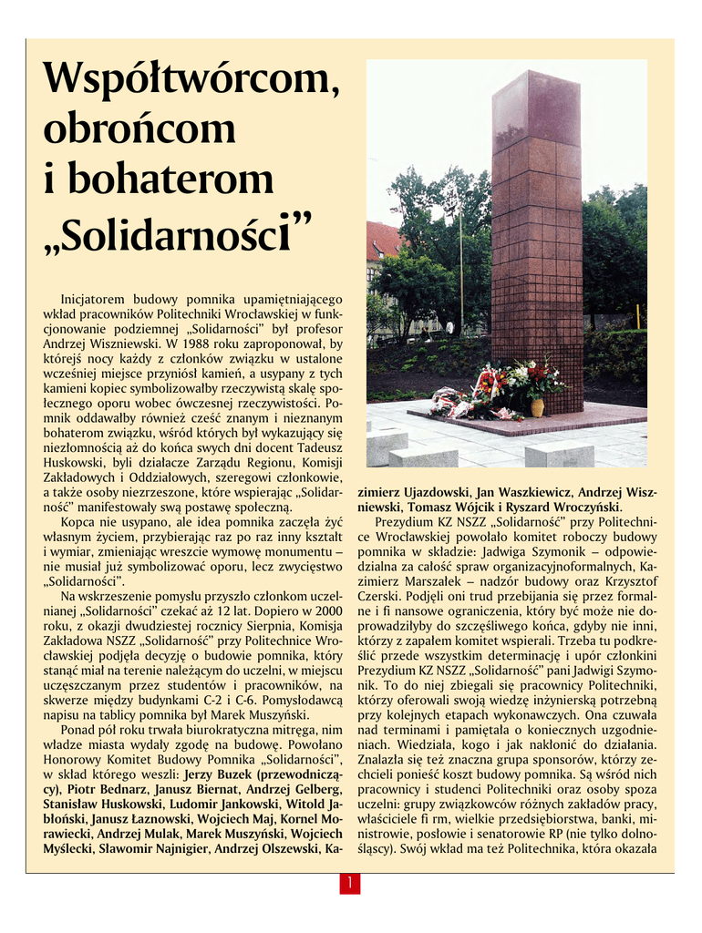 Współtwórcom, obrońcom i bohaterom „Solidarności” Inicjatorem budowy pomnika upamiętniającego wkład pracowników Politechniki Wrocławskiej w funkcjonowanie podziemnej „Solidarności” był profesor Andrzej Wiszniewski. W 1988 roku zaproponował, by którejś nocy każdy z członków związku w ustalone wcześniej miejsce przyniósł kamień, a usypany z tych kamieni kopiec symbolizowałby rzeczywistą skalę społecznego oporu wobec ówczesnej rzeczywistości. Pomnik oddawałby również cześć znanym i nieznanym bohaterom związku, wśród których był wykazujący się niezłomnością aż do końca swych dni docent Tadeusz Huskowski, byli działacze Zarządu Regionu, Komisji Zakładowych i Oddziałowych, szeregowi członkowie, a także osoby niezrzeszone, które wspierając „Solidarność” manifestowały swą postawę społeczną. Kopca nie usypano, ale idea pomnika zaczęła żyć własnym życiem, przybierając raz po raz inny kształt i wymiar, zmieniając wreszcie wymowę monumentu – nie musiał już symbolizować oporu, lecz zwycięstwo „Solidarności”. Na wskrzeszenie pomysłu przyszło członkom uczelnianej „Solidarności” czekać aż 12 lat. Dopiero w 2000 roku, z okazji dwudziestej rocznicy Sierpnia, Komisja Zakładowa NSZZ „Solidarność” przy Politechnice Wrocławskiej podjęła decyzję o budowie pomnika, który stanąć miał na terenie należącym do uczelni, w miejscu uczęszczanym przez studentów i pracowników, na skwerze między budynkami C-2 i C-6. Pomysłodawcą napisu na tablicy pomnika był Marek Muszyński. Ponad pół roku trwała biurokratyczna mitręga, nim władze miasta wydały zgodę na budowę. Powołano Honorowy Komitet Budowy Pomnika „Solidarności”, w skład którego weszli: Jerzy Buzek (przewodniczący), Piotr Bednarz, Janusz Biernat, Andrzej Gelberg, Stanisław Huskowski, Ludomir Jankowski, Witold Jabłoński, Janusz Łaznowski, Wojciech Maj, Kornel Morawiecki, Andrzej Mulak, Marek Muszyński, Wojciech Myślecki, Sławomir Najnigier, Andrzej Olszewski, Ka- zimierz Ujazdowski, Jan Waszkiewicz, Andrzej Wiszniewski, Tomasz Wójcik i Ryszard Wroczyński. Prezydium KZ NSZZ „Solidarność” przy Politechnice Wrocławskiej powołało komitet roboczy budowy pomnika w składzie: Jadwiga Szymonik – odpowiedzialna za całość spraw organizacyjnoformalnych, Kazimierz Marszałek – nadzór budowy oraz Krzysztof Czerski. Podjęli oni trud przebijania się przez formalne i fi nansowe ograniczenia, który być może nie doprowadziłyby do szczęśliwego końca, gdyby nie inni, którzy z zapałem komitet wspierali. Trzeba tu podkreślić przede wszystkim determinację i upór członkini Prezydium KZ NSZZ „Solidarność” pani Jadwigi Szymonik. To do niej zbiegali się pracownicy Politechniki, którzy oferowali swoją wiedzę inżynierską potrzebną przy kolejnych etapach wykonawczych. Ona czuwała nad terminami i pamiętała o koniecznych uzgodnieniach. Wiedziała, kogo i jak nakłonić do działania. Znalazła się też znaczna grupa sponsorów, którzy zechcieli ponieść koszt budowy pomnika. Są wśród nich pracownicy i studenci Politechniki oraz osoby spoza uczelni: grupy związkowców różnych zakładów pracy, właściciele fi rm, wielkie przedsiębiorstwa, banki, ministrowie, posłowie i senatorowie RP (nie tylko dolnośląscy). Swój wkład ma też Politechnika, która okazała 1 WSPÓ£TWÓRCOM, OBROÑCOM I BOHATEROM wielką życzliwość wobec związkowej inicjatywy. Niejednokrotnie zamiast pieniędzy świadczono bezpłatnie znaczące prace na rzecz pomnika. Poczynając od autora projektu, Eugeniusza Geta-Stankiewicza, przez wykonawców robót ziemnych, budowlanych oraz realizatorów pracochłonnych i kosztownych prac porządkowych w otoczeniu pomnika. Eugeniusz Get-Stankiewicz bezinteresownie wykonał projekt i nadzorował wszystkie prace, proponując obelisk wykonany ze skandynawskiego granitu. Bryła od dołu przypomina w zarysie pomysł profesora Andrzeja Wiszniewskiego z kamieniami, które miały się złożyć na kopiec, ale tu pojedynczo rozsypane kostki w miarę wznoszenia ku górze stopniowo się scalają, aż przechodzą w jednolitą, gładko wypolerowaną powierzchnię. Można mieć nadzieję, że zrealizowana inicjatywa jeszcze raz zaprezentuje Politechnikę jako ośrodek integracji społecznych inicjatyw – jak kiedyś, gdy jako miejsce działania jednej z najbardziej znaczących i aktywnych komisji zakładowych „Solidarności” przyciągała uwagę wielu zakładów pracy. W piękny, słoneczny dzień 19 września odbyły się uroczystości odsłonięcia pomnika poświęconego współtwórcom, obrońcom i bohaterom „Solidarności”. Rozpoczęła je msza św. w kościele Najświętszego Serca Jezusowego. Celebrował ją ksiądz Henryk kardynał Gulbinowicz wraz z księżmi: Mirosławem Drzewieckim i Stanisławem Pawlaczkiem – kapelanami „Solidarności”. Kazanie, które wygłosił ksiądz Mirosław Drzewiecki, nawiązywało do problematyki etycznej i kwestii wierności ideałom Czy dzisiejsza Solidarność to jeszcze monolit? – postawił pytanie kapłan. – Czy nie nastąpił proces odwrotny, rozbicie? Czy Pan Bóg z nieba nie widzi – patrząc z góry – naszego dzieła właśnie w taki sposób? Po mszy uczestnicy uroczystości złożyli kwiaty pod tablicą upamiętniającą Tadeusza Huskowskiego. Przewodniczący Komisji Zakładowej NSZZ „Solidarność” Ryszard Wroczyński przypomniał zasługi Zmarłego dla związku – jego jawnych i niejawnych struktur. Na odsłonięcie pomnika przybyło wielu dostojnych gości. Przyjechał prezydent Ryszard Kaczorowski z żoną, premier Jerzy Buzek, ministrowie Janusz Pałubicki i Andrzej Wiszniewski, liczni przedstawiciele władz samorządowych i lokalnej administracji państwowej. Obecność delegacji kombatanckich i związkowych ze sztandarami podkreślała szczególny charakter wydarzenia. Otwierający uroczystość JM Rektor pro