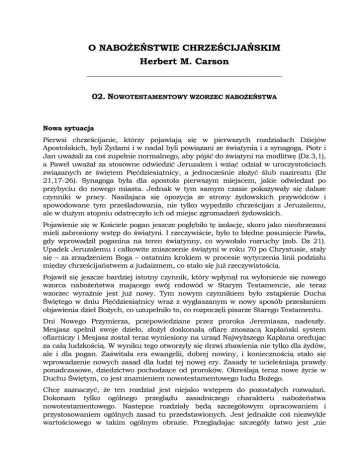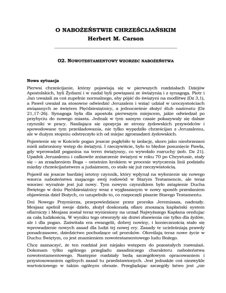 O NABOŻEŃSTWIE CHRZEŚCIJAŃSKIM Herbert M. Carson ________________________________________________________ 02. NOWOTESTAMENTOWY WZORZEC NABOŻEŃSTWA Nowa sytuacja Pierwsi chrześcijanie, którzy pojawiają się w pierwszych rozdziałach Dziejów Apostolskich, byli Żydami i w nadal byli powiązani ze świątynią i z synagogą. Piotr i Jan uważali za coś zupełnie normalnego, aby pójść do świątyni na modlitwę (Dz 3,1), a Paweł uważał za stosowne odwiedzić Jeruzalem i wziąć udział w uroczystościach związanych ze świętem Pięćdziesiątnicy, a jednocześnie złożyć ślub nazireatu (Dz 21,17-26). Synagoga była dla apostoła pierwszym miejscem, jakie odwiedzał po przybyciu do nowego miasta. Jednak w tym samym czasie pokazywały się dalsze czynniki w pracy. Nasilająca się opozycja ze strony żydowskich przywódców i spowodowane tym prześladowania, nie tylko wypędziło chrześcijan z Jeruzalemu, ale w dużym stopniu odstręczyło ich od miejsc zgromadzeń żydowskich. Pojawienie się w Kościele pogan jeszcze pogłębiło tę izolację, skoro jako nieobrzezani mieli zabroniony wstęp do świątyni. I rzeczywiście, było to błędne posunięcie Pawła, gdy wprowadził poganina na teren świątynny, co wywołało rozruchy (zob. Dz 21). Upadek Jeruzalemu i całkowite zniszczenie świątyni w roku 70 po Chrystusie, stały się – za zrządzeniem Boga – ostatnim krokiem w procesie wytyczenia linii podziału między chrześcijaństwem a judaizmem, co stało się już rzeczywistością. Pojawił się jeszcze bardziej istotny czynnik, który wpłynął na wyłonienie się nowego wzorca nabożeństwa mającego swój rodowód w Starym Testamencie, ale teraz wzorzec wyraźnie jest już nowy. Tym nowym czynnikiem było zstąpienie Ducha Świętego w dniu Pięćdziesiątnicy wraz z wygłaszanym w nowy sposób przesłaniem objawienia dzieł Bożych, co uzupełniło to, co rozpoczęli pisarze Starego Testamentu. Dni Nowego Przymierza, przepowiedziane przez proroka Jeremiasza, nadeszły. Mesjasz spełnił swoje dzieło, złożył doskonałą ofiarę znoszącą kapłański system ofiarniczy i Mesjasz został teraz wyniesiony na urząd Najwyższego Kapłana orędując za całą ludzkością. W wyniku tego otworzyły się drzwi zbawienia nie tylko dla żydów, ale i dla pogan. Zaświtała era ewangelii, dobrej nowiny, i koniecznością stało się wprowadzenie nowych zasad dla ludzi tej nowej ery. Zasady te ucieleśniają prawdy ponadczasowe, dziedzictwo pochodzące od proroków. Określają teraz nowe życie w Duchu Świętym, co jest znamieniem nowotestamentowego ludu Bożego. Chcę zaznaczyć, że ten rozdział jest niejako wstępem do pozostałych rozważań. Dokonam tylko ogólnego przeglądu zasadniczego charakteru nabożeństwa nowotestamentowego. Następne rozdziały będą szczegółowym opracowaniem i przystosowaniem ogólnych zasad tu przedstawionych. Jest jednakże coś niezwykle wartościowego w takim ogólnym obrazie. Przeglądając szczegóły łatwo jest „nie O nabożeństwie chrześcijańskim, Herbert M. Carson - 02. Nowotestamentowy wzorzec nabożeństwa ______________________________________________________________________________________________________ dostrzec lasu spoza drzew”. Studium dotyczące szczegółów jest oczywiście konieczne, a nawet w pewnych kontrowersyjnych zagadnieniach może być nieodzowne zwrócenie baczniejszej uwagi właśnie na szczegóły. Jednocześnie jednak warto odrywać się o od nich, by widzieć cały wzorzec. Postępując tak nie będziemy idealizować osób opisanych w Nowym Testamencie i ich duchowej działalności. Ujrzymy raczej prawdziwych mężczyzn i prawdziwe kobiety z krwi i kości ze swymi słabościami, lękami, problemami i grzechami, którzy jednak mają ogromną radość przeżywania wspólnego nabożeństwa odbywającego się w imieniu Jezusa. My także przez Ducha Świętego zostajemy włączani do tej nadzwyczajnej wspólnoty Boga Wszechmogącego. Nienaruszalna zasada jest wciąż ta sama jak w Starym Testamencie: Słowo Boże jest standardem, na podstawie którego ma zostać ocenione każde działanie. Paweł ostrzegał Kolosan przed „obrzędami wymyślonymi przez ludzi” (Kol 2,23), które Kalwin słusznie zinterpretował jako „zmyślone”. Apostolskie zalecenia i zakazy – to przewodnie linie, na które należy zwracać uwagę, gdzie po jednej stronie znajduje się właściwe nauczanie, a po drugiej ostrzeżenie przed błędnymi odchyleniami. Cel także pozostaje ten sam i słusznie, bowiem uwielbienie Boga jest zawsze celem, na który ma być nakierowane ludzkie życie. Wizja chwały Pańskiej ma być przewodnią zasadą nie tylko wtedy, gdy zgromadzamy się razem i mamy nabożeństwo, ale w każdym miejscu naszego życia. Podstawowym celem nabożeństw w Dniu Pańskim nie jest odebranie od Boga błogosławieństw – chociaż jasne jest, że ma to miejsce – ale oddanie chwały Bogu. Umysły tych, którzy przygotowują się do służenia w nabożeństwie powinny być zdominowane przeświadczeniem, aby pod każdym względem mógł być uwielbiony Bóg. Porządek, wolność i prostota Ściśle powiązana z zagadnieniem oddawanie chwały Bogu jest zasada, że „wszystko niech się odbywa godnie i w porządku” (1 Kor 14,40). Bóg stworzenia jest Bogiem porządku, a nie chaosu. Bóg opatrzności jest Bogiem, który kieruje szczegółami historycznych wydarzeń oraz życiem każdej jednostki i jest także ostatecznym końcem realizacji swoich zamierzeń. Dlatego porządek i szacunek charakteryzować mają służbę Bożą. „Bóg – powiada Paweł – nie jest Bogiem nieporządku, ale pokoju” (1 Kor 14,33). Jest to jednak porządek całkowicie zgodny z wolnością. Bóg, który ustanowił porządek przyrodzie, nie umieścił w klatkach skowronków, które stworzył. Tak też wzorzec uporządkowanego nabożeństwa nie polega na „liturgicznym kaftanie bezpieczeństwa”, który krępuje w
