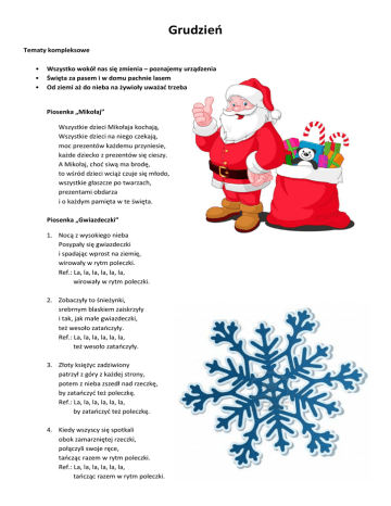 Grudzień Tematy kompleksowe • • • Wszystko wokół nas się zmienia – poznajemy urządzenia Święta za pasem i w domu pachnie lasem Od ziemi aż do nieba na żywioły uważać trzeba Piosenka „Mikołaj” Wszystkie dzieci Mikołaja kochają, Wszystkie dzieci na niego czekają, moc prezentów każdemu przyniesie, każde dziecko z prezentów się cieszy. A Mikołaj, choć siwą ma brodę, to wśród dzieci wciąż czuje się młodo, wszystkie głaszcze po twarzach, prezentami obdarza i o każdym pamięta w te święta. Piosenka „Gwiazdeczki” 1. Nocą z wysokiego nieba Posypały się gwiazdeczki i spadając wprost na ziemię, wirowały w rytm poleczki. Ref.: La, la, la, la, la, la, wirowały w rytm poleczki. 2. Zobaczyły to śnieżynki, srebrnym blaskiem zaiskrzyły i tak, jak małe gwiazdeczki, też wesoło zatańczyły. Ref.: La, la, la, la, la, la, też wesoło zatańczyły. 3. Złoty księżyc zadziwiony patrzył z góry z każdej strony, potem z nieba zszedł nad rzeczkę, by zatańczyć też poleczkę. Ref.: La, la, la, la, la, la, by zatańczyć też poleczkę. 4. Kiedy wszyscy się spotkali obok zamarzniętej rzeczki, połączyli swoje ręce, tańcząc razem w rytm poleczki. Ref.: La, la, la, la, la, la, tańcząc razem w rytm poleczki. Piosenka „Był pastuszek bosy” Był pastuszek bosy na fujarce grał, pasał w górach owce i w szałasie spał. Nagle aniołowie z nieba w bieli przyfrunęli obudzili go gdy spał, gdy spał... Obudzili go gdy spał, gdy spał. Dziś do Betlejem trzeba nocą iść, bo Narodzenia czas wypełnił dni, tam gdzie stajenka razem z bydlątkami, leży dzieciąteczko i na sianku śpi. Świat na to czekał wiele już lat i Narodzenia dziś wita czas, biegnij pastuszku jasną drogą, niebo płonie, A na niebie pierwszej gwiazdy blask, a na niebie pierwszej gwiazdy blask. Był pastuszek bosy, zimne nóżki miał, ale dobry anioł piękne butki dał. Wziął pastuszek owce, pobiegł tak jak wiatr przed siebie, a na niebie blask od gwiazd, od gwiazd... A na niebie blask od gwiazd, od gwiazd. Wiersz „Weźmy się za ręce” Weźmy się za ręce, chłopcy i dziewczynki, Zatańczymy razem dokoła choinki. Dokoła choinki jest tu miejsca dosyć. Może by i inne dzieci też zaprosić? Prosimy, prosimy, przyjdźcie do nas w gości w to wesołe święto, w to święto Radości! Przewidywane osiągnięcia dziecka: • Wszystko wokół nas się zmienia – poznajemy urządzenia Dziecko: • • • • • • • • • • • • • • • • • • • • • • • • • współpracuje z innymi w grupie dba o swój wygląd bierze udział w rozmowie, wypowiada się na określony temat tworzy za pomocą stempli wzory i desenie na projektach tkanin lub ubiorów projektuje i wykonuje prace konstrukcyjne stosuje zasady bezpiecznego korzystania z urządzeń technicznych rozpoznaje i nazywa wybrane wynalazki przedstawione na ilustracjach oraz zna ich przeznaczenie prawidłowo stosuje liczebniki porządkowe oraz różnicuje pojęcia ilościowe i wielkościowe identyfikuje liczbę 5 z jej zapisem graficznym posługuje się pojęciami, określając i porównując wysokość przedmiotów uważnie i ze zrozumieniem słucha tekstów literackich rozumie i właściwie reaguje na umówione znaki, gesty, dźwięki i słowa stosowane w komunikacji międzyludzkiej dokonuje analizy sylabowej i fonemowej wyrazów dokonuje syntezy sylabowej lub głoskowej wyrazów dokonuje analizy głoskowej wyrazów, wyróżnia w wyrazie głoskę „u” w różnych pozycjach rozpoznaje i nazywa drukowane i pisane litery „u”, „U” czyta sylaby, zdania i krótkie teksty w zakresie poznanych liter pisze litery „u, U,” po śladzie wypowiada się na temat wybranych sposobów porozumiewania się ludzi na odległość dawniej i dzisiaj rozpoznaje i nazywa źródła dźwięków (pracujące wybrane urządzenia) jest świadome zmian wynikających z postępu technicznego i zmian warunków życia człowieka wypowiada się na temat zmian zachodzących w sposobie ubierania się ludzi na przestrzeni wieków oraz pojęcia „moda” prowadzi rozmowę telefoniczną opisując rozwój cywilizacji, posługuje się określeniem „wynalazek” Święta za pasem i w domu pachnie lasem Dziecko: • • • • • • • • • • • • • • utrzymuje porządek w miejscu pracy i zabawy interpretuje słownie treść wiersza opowiada o relacjach łączących najbliższych w swojej rodzinie mówi wiersz z pamięci bierze udział w zabawach parateatralnych – wciela się w role prezentuje swoje umiejętności przed rodzicami śpiewa w grupie kolędy, pastorałki, piosenki wykonuje dekoracje świąteczne wymienia cechy charakterystyczne dla zimy jako pory roku dodaje i odejmuje na konkretach, w zakresie poznanych liczb wskazuje zbiór pusty, określając go liczbą 0 posługuje się pojęciami określającymi wysokość opisuje przedmiot wypowiada się na temat wysłuchanego tekstu • • • • czyta wyrazy w zakresie poznanych liter reaguje empatycznie na trudne sytuacje innych dzieci składa życzenia świąteczne współorganizuje spotkanie przedwigilijne dla rodziców • Od ziemi aż do nieba na żywioły uważać trzeba Dziecko: • • • • • • • • • • • • • • • • • • • • • układa opowiadanie twórcze potrafi wykonać samodzielnie lub z pomocą nauczyciela proste doświadczenia uważnie obserwuje oraz wyciąga wnioski wie, że nieostrożne obchodzenie się z ogniem grozi pożarem szereguje barwy od najjaśniejszej do najciemniejszej bierze udział w zabawach twórczych, konstrukcyjnych wymienia naturalne i techniczne źródła światła nazywa części roślin znajdujące się w ziemi przelicza do 6, wskazuje cyfrę 6 potrafi zdefiniować pojęcie „rok” zapamiętuje i układa wzór czyta wyrazy w zakresie poznanych liter wie, że powietrze znajduje się wszędzie, zna jego właściwości wymienia właściwości ognia wie, jakie 
