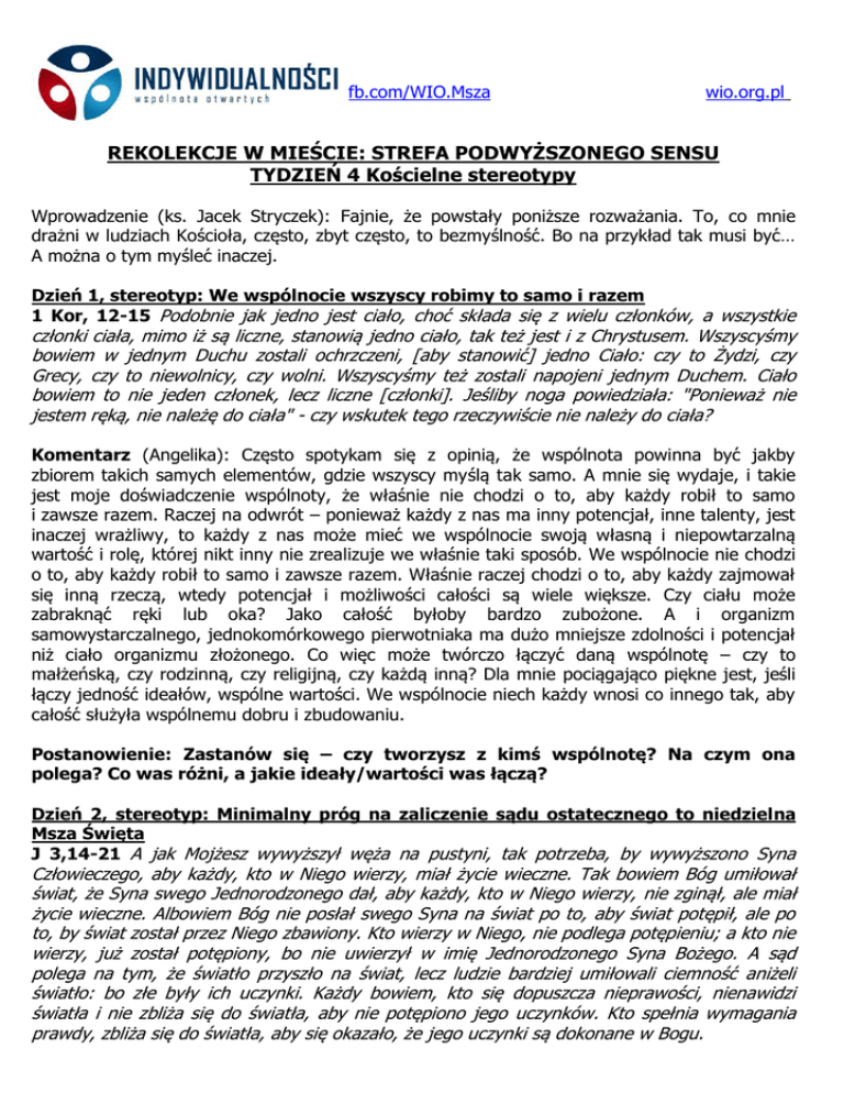fb.com/WIO.Msza wio.org.pl REKOLEKCJE W MIEŚCIE: STREFA PODWYŻSZONEGO SENSU TYDZIEŃ 4 Kościelne stereotypy Wprowadzenie (ks. Jacek Stryczek): Fajnie, że powstały poniższe rozważania. To, co mnie drażni w ludziach Kościoła, często, zbyt często, to bezmyślność. Bo na przykład tak musi być… A można o tym myśleć inaczej. Dzień 1, stereotyp: We wspólnocie wszyscy robimy to samo i razem 1 Kor, 12-15 Podobnie jak jedno jest ciało, choć składa się z wielu członków, a wszystkie członki ciała, mimo iż są liczne, stanowią jedno ciało, tak też jest i z Chrystusem. Wszyscyśmy bowiem w jednym Duchu zostali ochrzczeni, [aby stanowić] jedno Ciało: czy to Żydzi, czy Grecy, czy to niewolnicy, czy wolni. Wszyscyśmy też zostali napojeni jednym Duchem. Ciało bowiem to nie jeden członek, lecz liczne [członki]. Jeśliby noga powiedziała: "Ponieważ nie jestem ręką, nie należę do ciała" - czy wskutek tego rzeczywiście nie należy do ciała? Komentarz (Angelika): Często spotykam się z opinią, że wspólnota powinna być jakby zbiorem takich samych elementów, gdzie wszyscy myślą tak samo. A mnie się wydaje, i takie jest moje doświadczenie wspólnoty, że właśnie nie chodzi o to, aby każdy robił to samo i zawsze razem. Raczej na odwrót – ponieważ każdy z nas ma inny potencjał, inne talenty, jest inaczej wrażliwy, to każdy z nas może mieć we wspólnocie swoją własną i niepowtarzalną wartość i rolę, której nikt inny nie zrealizuje we właśnie taki sposób. We wspólnocie nie chodzi o to, aby każdy robił to samo i zawsze razem. Właśnie raczej chodzi o to, aby każdy zajmował się inną rzeczą, wtedy potencjał i możliwości całości są wiele większe. Czy ciału może zabraknąć ręki lub oka? Jako całość byłoby bardzo zubożone. A i organizm samowystarczalnego, jednokomórkowego pierwotniaka ma dużo mniejsze zdolności i potencjał niż ciało organizmu złożonego. Co więc może twórczo łączyć daną wspólnotę – czy to małżeńską, czy rodzinną, czy religijną, czy każdą inną? Dla mnie pociągająco piękne jest, jeśli łączy jedność ideałów, wspólne wartości. We wspólnocie niech każdy wnosi co innego tak, aby całość służyła wspólnemu dobru i zbudowaniu. Postanowienie: Zastanów się – czy tworzysz z kimś wspólnotę? Na czym ona polega? Co was różni, a jakie ideały/wartości was łączą? Dzień 2, stereotyp: Minimalny próg na zaliczenie sądu ostatecznego to niedzielna Msza Święta J 3,14-21 A jak Mojżesz wywyższył węża na pustyni, tak potrzeba, by wywyższono Syna Człowieczego, aby każdy, kto w Niego wierzy, miał życie wieczne. Tak bowiem Bóg umiłował świat, że Syna swego Jednorodzonego dał, aby każdy, kto w Niego wierzy, nie zginął, ale miał życie wieczne. Albowiem Bóg nie posłał swego Syna na świat po to, aby świat potępił, ale po to, by świat został przez Niego zbawiony. Kto wierzy w Niego, nie podlega potępieniu; a kto nie wierzy, już został potępiony, bo nie uwierzył w imię Jednorodzonego Syna Bożego. A sąd polega na tym, że światło przyszło na świat, lecz ludzie bardziej umiłowali ciemność aniżeli światło: bo złe były ich uczynki. Każdy bowiem, kto się dopuszcza nieprawości, nienawidzi światła i nie zbliża się do światła, aby nie potępiono jego uczynków. Kto spełnia wymagania prawdy, zbliża się do światła, aby się okazało, że jego uczynki są dokonane w Bogu. Komentarz (Karol): Minimalny próg na zaliczenie sądu ostatecznego to niedzielna Msza Święta. Na czwórkę trzeba robić dobre uczynki i w Wielkim Poście pojawić się na Drodze Krzyżowej, a w październiku na różańcu i wypominkach. Na piątkę trzeba być przynajmniej animatorem we wspólnocie. Szóstka jest dla księży i zakonnic. A Ty? Jakie masz kryteria oceny na sądzie ostatecznym? Postanowienie: Wypisz trzy kryteria jakie wg Ciebie trzeba spełnić, by „zaliczyć” sąd ostateczny. Następnie wypisz te kryteria na podstawie powyższego fragmentu Pisma. Które kryteria spełniasz? Dzień 3, stereotyp: Wiara jest dla kobiet, nie dla facetów, mężczyzna nie znajdzie niczego fascynującego w Kościele 1 Sm 17, 51-52 Dawid podbiegł i stanął nad Filistynem, chwycił jego miecz, i dobywszy z pochwy, dobił go; odrąbał mu głowę. Gdy spostrzegli Filistyni, że ich wojownik zginął, rzucili się do ucieczki. 2 Sm 6, 13-15 Ilekroć niosący Arkę Pańską postąpili sześć kroków, składał w ofierze wołu i tuczne cielę. Dawid wtedy tańczył z całym zapałem w obecności Pana, a ubrany był w lniany efod. Komentarz (Szymon): Kiedy próbuję sobie wyobrazić Dawida po odrąbaniu głowy Filistynowi, na myśl przychodzi mi zbroczony krwią wojownik, z mieczem spoczywającym już na ziemi. Jego postawa budzi strach. Ten sam człowiek przewodniczy obrzędom Izraelitów na cześć Boga. Co więcej, robi to z całym zapałem! Kiedyś wydawało mi się, że w Kościele nie ma miejsca dla takich ludzi jak Dawid. Że nie znajdę tam mężczyzn, którzy prowadzą pasjonujące życie, którzy podejmują ryzyko, nieraz ekstremalne - a równocześnie zabiegają o relację z Bogiem. Raczej byłem bliższy przekonania, że mężczyznę, który jest Katolikiem cechuje bycie miłym, zrównoważonym i spokojnym. W WIO spotkałem się z innym podejściem. Tu faceci, którzy co niedzielę posługują do Mszy Św., medytują Pismo Święte, śpiewają w chórze, „po godzinach” wspinają się na alpejskie szczyty, biegają maratony czy idą całą noc 50 km do Kalwarii. Czy zatem w Kościele rzeczywiście nie ma miejsca na duchowość w męskim wydaniu? Czy bycie członkiem Kościoła, praktykowanie wiary musi być dla mężczyzny nudą i jakimś przykrym obowiązkiem? Postanowienie: Zadaj sobie proste pytanie: co zrobiłeś ekscytującego i ponadprzeciętnego z powodu wiary? Coś, co było dużym wysiłkiem i bolało? Napisz… Bo liczy się