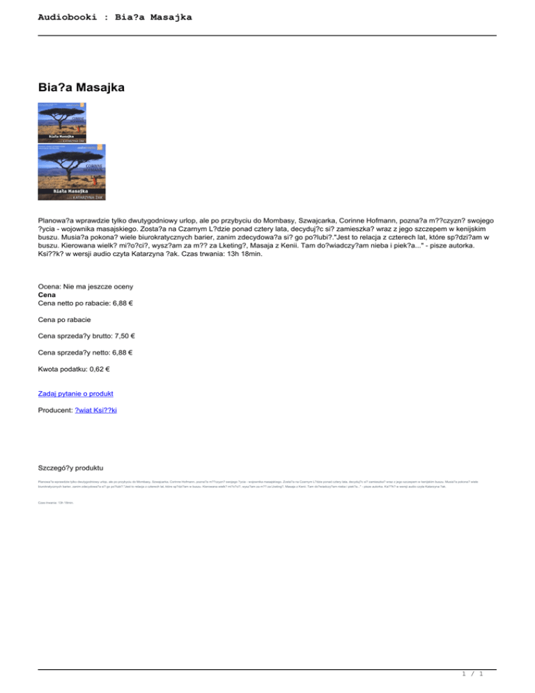 Audiobooki : Bia?a Masajka Bia?a Masajka Planowa?a wprawdzie tylko dwutygodniowy urlop, ale po przybyciu do Mombasy, Szwajcarka, Corinne Hofmann, pozna?a m??czyzn? swojego ?ycia - wojownika masajskiego. Zosta?a na Czarnym L?dzie ponad cztery lata, decyduj?c si? zamieszka? wraz z jego szczepem w kenijskim buszu. Musia?a pokona? wiele biurokratycznych barier, zanim zdecydowa?a si? go po?lubi?."Jest to relacja z czterech lat, które sp?dzi?am w buszu. Kierowana wielk? mi?o?ci?, wysz?am za m?? za Lketing?, Masaja z Kenii. Tam do?wiadczy?am nieba i piek?a..." - pisze autorka. Ksi??k? w wersji audio czyta Katarzyna ?ak. Czas trwania: 13h 18min. Ocena: Nie ma jeszcze oceny Cena Cena netto po rabacie: 6,88 € Cena po rabacie Cena sprzeda?y brutto: 7,50 € Cena sprzeda?y netto: 6,88 € Kwota podatku: 0,62 € Zadaj pytanie o produkt Producent: ?wiat Ksi??ki Szczegó?y produktu Planowa?a wprawdzie tylko dwutygodniowy urlop, ale po przybyciu do Mombasy, Szwajcarka, Corinne Hofmann, pozna?a m??czyzn? swojego ?ycia - wojownika masajskiego. Zosta?a na Czarnym L?dzie ponad cztery lata, decyduj?c si? zamieszka? wraz z jego szczepem w kenijskim buszu. Musia?a pokona? wiele biurokratycznych barier, zanim zdecydowa?a si? go po?lubi?."Jest to relacja z czterech lat, które sp?dzi?am w buszu. Kierowana wielk? mi?o?ci?, wysz?am za m?? za Lketing?, Masaja z Kenii. Tam do?wiadczy?am nieba i piek?a..." - pisze autorka. Ksi??k? w wersji audio czyta Katarzyna ?ak. Czas trwania: 13h 18min. 1 / 1 Powered by TCPDF (www.tcpdf.org)