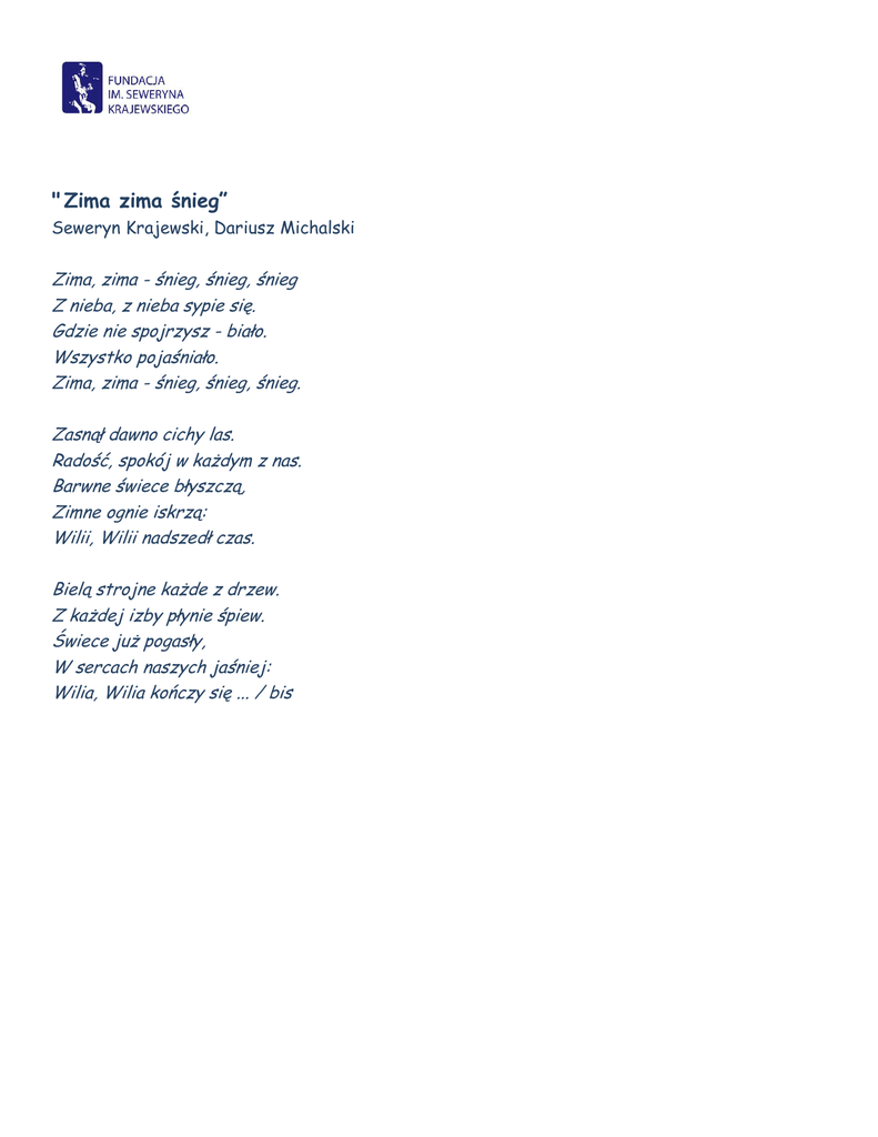 " Zima zima śnieg” Seweryn Krajewski, Dariusz Michalski Zima, zima - śnieg, śnieg, śnieg Z nieba, z nieba sypie się. Gdzie nie spojrzysz - biało. Wszystko pojaśniało. Zima, zima - śnieg, śnieg, śnieg. Zasnął dawno cichy las. Radość, spokój w każdym z nas. Barwne świece błyszczą, Zimne ognie iskrzą: Wilii, Wilii nadszedł czas. Bielą strojne każde z drzew. Z każdej izby płynie śpiew. Świece już pogasły, W sercach naszych jaśniej: Wilia, Wilia kończy się ... / bis