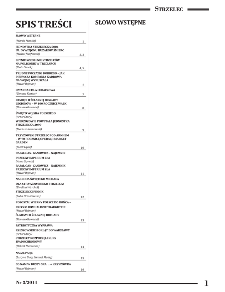 STRZELEC SPIS TREŚCI SŁOWO WSTĘPNE SŁOWO WSTĘPNE (Marek Matuła) JEDNOSTKA STRZELECKA 5001 IM. DYWIZJONU HUZARÓW ŚMIERC (Michał Józefowski) LETNIE SZKOLENIE STRZELCÓW NA POLIGONIE W TRZCIAŃCU (Piotr Panek) TRUDNE POCZĄTKI DOBREGO – JAK PIERWSZA KOMPANIA KADROWA NA WOJNĘ WYRUSZAŁA (Paweł Rejman) SZTANDAR DLA LUBACZOWA (Tomasz Kantor) PAMIĘCI II ŻELAZNEJ BRYGADY LEGIONÓW – W 100 ROCZNICĘ WALK (Roman Głowacki) ŚWIĘTO WOJSKA POLSKIEGO (Artur Szary) W BRZOZOWIE POWSTAŁA JEDNOSTKA STRZELECKA 2090 (Mariusz Kaznowski) TRZYŻOWSKI STRZELEC POD ARNHEM – W 70 ROCZNICĘ OPERACJI MARKET GARDEN (Jacek Łącki) RAFAŁ GAN- GANOWICZ – NAJEMNIK PRZECIW IMPERIUM ZŁA (Anna Styrnik) RAFAŁ GAN- GANOWICZ – NAJEMNIK PRZECIW IMPERIUM ZŁA (Paweł Rejman) NAGRODA ŚWIĘTEGO MICHAŁA DLA STRZYŻOWSKIEGO STRZELCA! (Ewelina Warchoł) STRZELECKI PIKNIK (Lidia Brzostowska) POZOSTAŁ WIERNY POLSCE DO KOŃCA – RZECZ O ROMUALDZIE TRAUGUTCIE (Paweł Rejman) ŚLADAMI II ŻELAZNEJ BRYGADY (Roman Głowacki) PATRIOTYCZNA WYPRAWA RZESZOWSKICH ORLĄT DO WARSZAWY (Artur Szary) STRZELCY ROZPOCZĘLI KURS SPADOCHRONOWY (Robert Pieczonka) NASZE PASJE (Justyna Bury, Samuel Madej) CO NAM W DUSZY GRA …+ KRZYŻÓWKA (Paweł Rejman) Nr 3/2014 1 2, 3 4, 5 6 7 8 9 10 11 12 13 14 15 16 1 STRZELEC JEDNOSTKA STRZELECKA 5001 IM. DYWIZJONU HUZARÓW ŚMIERCI. Jednostka powstała w sierpniu 2013r. na terytorium Warszawy. W jej skład weszli strzelcy wydzieleni z JS 1003 z misją utworzenia nowej jednostki strzeleckiej. W marcu tego roku JS 5001 przystąpiła do Związku Strzeleckiego „STRZELEC” Józefa Piłsudskiego. W trakcie działalności jednostka dokonała wyboru swojego patrona. 2 sierpnia 2014 w Prostyni jednostce oficjalnie zostało nadane imię „Dywizjonu Huzarów Śmierci”. Uroczystości odbyły się nie bez powodu w Prostyni - to właśnie tam 94 lata temu został zaprzysiężony Dywizjon Huzarów Śmierci. Pomysł na patrona narodził się w trakcie działalności jednostki na terenie gdzie dywizjon został uformowany i prowadził swoje działania. Losy wojenne Huzarów były skomplikowane. Do dziś wiele jest pozytywnych jak i negatywnych opinii na temat sposobu działania, metod i środków walki. Jednak odwaga i dokonania wojenne dywizjonu warte są uhonorowania. I właśnie stąd pomysł na patrona strzelców- jednostki, która nie przegrała żadnej bitwy. Jednostki której żołnierze wyznawali zasadę zwycięstwo albo śmierć. Dywizjon stoczył wiele bitew. Do jednej z najważniejszych należy batalia stoczona dnia 24 sierpnia 1920 roku pod Myszyńcem, gdzie z wielogodzinnej walki z liczniejszym i uzbrojonym w silną artylerię wrogiem Dywizjon Huzarów Śmierci wyszedł zwycięsko. O wyniku bitwy przesądziła szarża przeprowadzona przez główne siły dywizjonu pod przewodnictwem samego dowódcy por. Siły-Nowickiego. Atak huzarów na piechotę nieprzyjacielską, zdezorganizował obronę i zmusił sowietów do ucieczki. W wyniku walk dywizjon zdobył 9 armat i tabory z różnorodnym zaopatrzeniem. Równolegle podjazd huzarski, wydzielony z 3 szwadronu, zniósł brawurową szarżą inną kolumnę nieprzyjacielską, zdobywając dwa działa i 10 karabinów maszynowych. Inne patrole huzarskie zagarnęły kolejne 4 armaty i 5 kaemów. Oprócz tego dywizjon zdobył około 200 koni. Bazując na wiedzy historycznej JS 5001 dąży do poszerzenia swoich działań o tereny, które mają bezpo- 2 średni związek z Dywizjonem Huzarów Śmierci. Jednostka działa już w takich miejscowościach jak Sadowne, Prostyń, Kołodziąż i w swoich planach ma utworzenie kolejnych drużyn w Stoczku i Łochowie. Celem tych działań jest utworzenie oddziałów i pododdziałów Strzelców i Orląt na trakcie Warszawa- Małkinia. Jednostka w dalszym ciągu funkcjonuje również na swoim pierwotnym terenie, czyli w Warszawie. W tym roku planuje utworzenie drużyn strzeleckich oraz orlęcych w oparciu o dzielnice Warszawy. Jednostka podejmuje w tym zakresie współpracę ze szkołami. Zyskała również przychylność prasy, która w znacznym stopniu pomaga przy rozpowszechnianiu wiedzy na temat jednostki oraz propagowaniu jej ideałów, zachęcając tym samym do wstąpienia w jej szeregi. Jednostka, starając się wypełniać zapisy statutowe dotyczące obrony cywilnej bierze czynny udział w udzielaniu pomocy mieszkańcom gminy Sadowne podczas lokalnych podtopień. Strzelcy pomagają w udrażnianiu przepływów, dzięki czemu zapobiegają zalewaniu domów i gospodarstw. Jednostka na stałe chce wpisać się w obronę terytorialną kraju szkoląc strzelców na podobieństwo żołnierzy, zapewniając tym samym nienaruszalność granic Państwa Polskiego. Jednostkę Strzelecką 5001 im. Dywizjonu Huzarów Śmierci tworzą ludzie młodzi, głównie uczniowie szkół śred- nich, gimnazjalnych i podstawowych. Jednostka cały czas przeprowadza rekrutację i poszerza swoje szeregi o nowych rekrutów. Kadra JS 5001 im. Dywizjonu Huzarów Śmierci to: Sierżant ZS Michał Józefowski – dowódca jednostki strzeleckiej 5001 im. Dywizjonu Huzarów Śmierci. W Strzelcu działa od 4 lat. Wiek 28 lat. Drużynowy ZS Łukasz Gembala – zastępca dowódcy ds. logistyki i szkolenia. W Strzelcu działa od 3 lat. Wiek 32 lata. Starszy Strzelec ZS Agata Gałązka – pisarz JS 5001 im. Dywizjonu Huzarów Śmierci. W Strzelcu działa od roku. Wiek 24 lata. Sekcyjny ZS Eryk Kościelniak – dowódca 1 drużyny 1 plutonu. Jest uczniem 3 klasy liceum, ma 18 lat. Straszy Strzelec ZS Marcin Szczodrowski – dowódca 3 drużyny 1 plutonu. Jest uczniem II klasy liceum, ma 17 lat. Starszy Strzelec ZS Damian Jóźwik - dowódca 2 drużyny 1 plutonu. Jest uczniem II klasy liceum, ma 17 lat. Strzelec ZS Jakub Klimek – dowódca 1 drużyny 3 plutonu „Sadowne”. Jest uczniem III klasy liceum, ma 18 lat. Uroczystości w Prostyni 2 sierpnia 2014 w bazylice mniejszej w Prostyni, odbyły się uroczystości z okazji nadania JS 5001 imi