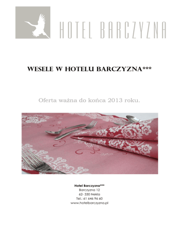 WESELE W HOTELU BARCZYZNA*** Oferta ważna do końca 2013 roku. Hotel Barczyzna*** Barczyzna 12 62- 330 Nekla Tel.: 61 646 96 60 www.hotelbarczyzna.pl PROPOZYCJA I Obiad Zupa: Rosół z makaronem II danie 3 porcje/1os. Kotlet de Volaille Pierś z kurczaka faszerowana szynką, serem i czerwoną papryką, panierowana w sezamie Roladka drobiowa z mozzarellą i suszonymi pomidorami otulona szynką parmeńską Kotlet schabowy panierowany Pieczeń wieprzowa z karkówki Zraz wieprzowy Dodatki: Ziemniaki gotowane z koperkiem Pyzy drożdżowe Frytki Bukiet surówek (dwa rodzaje) Kapusta zasmażana biała i czerwona Warzywa gotowane Sos pieczeniowy ciemny Deser Deser lodowy z sosem truskawkowym i bitą śmietaną Ciasto 1,5 porcji / 1os. Owoce Kawa, herbata b/o Zimne zakąski 3 porcje/1 os. Barszcz czysty Galantyna z kurczaka Mozaika mięsna Indyk faszerowany warzywami Wędliny faszerowane Ryba opiekana po grecku Sałatka grecka Pieczywo mieszane jasne i ciemne, masło Kolacja 1,5 porcji/1os. Szaszłyk drobiowy lub wieprzowy Golonki po bawarsku i peklowane Strogonow wieprzowy z kluseczkami Kapusta kwaszona zasmażana Pieczywo jasne i ciemne, masło Musztarda, chrzan, ketchup Cena Propozycji I – 170 zł/ 1 os. PROPOZYCJA II Obiad Zupa: Rosół z makaronem Potrawka (udko gotowane, ryż, marchewka z groszkiem, sos potrawkowy) II danie 3, 5 porcje /1os. Kotlet de Volaille Pierś z kurczaka faszerowana szynką, serem i czerwoną papryką, panierowana w sezamie Roladka drobiowa z mozzarellą i suszonymi pomidorami otulona szynką parmeńską Kotlet schabowy panierowany z pieczarkami Pieczeń wieprzowa z karkówki Zraz wieprzowy Dodatki: Ziemniaki gotowane z koperkiem Pyzy drożdżowe Frytki Kluski śląskie Bukiet surówek (3 rodzaje) Kapusta zasmażana czerwona Warzywa gotowane Sos pieczeniowy ciemny Deser Deser lodowy z owocami z sosem jagodowym i bitą śmietaną Ciasto 2 porcje / 1os. Owoce Kawa, herbata b/o Zimne zakąski 3 porcje/1os. Barszcz czysty Galantyna z kurczaka Mozaika mięsna Wędliny faszerowane Schab w otoczce chrzanowej Ryba opiekana po grecku Paluszki rybne w sosie tatarskim Sałatka grecka Pieczywo jasne i ciemne, masło Kolacja 1,5 porcji / 1os. Żeberka w miodzie Golonki po bawarsku i peklowane Strogonow wieprzowy z kluseczkami Kapusta kwaszona zasmażana Sałatka jarzynowa Pieczywo jasne i ciemne, masło Musztarda, chrzan, ketchup Cena propozycji II 190 zł / 1 os. PROPOZYCJA III Aperitif Szampan Obiad Zupa Krem szparagowy Potrawka (udko z kurczaka, roladka drobiowa, ryż, marchewka z groszkiem, sos potrawkowy) II danie 4 porcje / 1os. Filet z indyka w płatkach kukurydzianych Roladka drobiowa z mozzarellą i suszonymi pomidorami otulona szynką parmeńską Warkocz z polędwicy wieprzowej z kolorowym pieprzem Kotlet wieprzowy po amerykańsku zapiekany z serem Zraz wołowy Pieczeń wieprzowa Kaczka po polsku Grillowany łosoś Dodatki: Ziemniaki gotowane z koperkiem Pyzy drożdżowe Frytki Kluski śląskie Bukiet surówek (3 rodzaje) Kapusta zasmażana biała i czerwona Warzywa gotowane Sos pieczeniowy ciemny Deser Sorbet pomarańczowy z dodatkiem alkoholu podany w owocu Ciasto 2 porcje / 1os. Owoce Kawa, herbata b/o Zimne zakąski 3 porcje/ 1os. Barszcz z pasztecikiem Galantyna z kurczaka Wędliny faszerowane Indyk faszerowany warzywami Schab pieczony w otoczce chrzanowej Ryba opiekana po grecku Roladka z pstrąga faszerowana łososiem i krewetkami Sałatka grecka Sałatka warstwowa z serem i szynką Pieczywo jasne i ciemne, masło Kolacja 1,5 porcji / 1os. Żurek z jajkiem Szaszłyk drobiowy lub wieprzowy Żeberka w miodzie Golonki po bawarsku i peklowane Strogonow wieprzowy z kluseczkami Kapusta kwaszona zasmażana Sałatka jarzynowa Pieczywo jasne i ciemne, masło Musztarda, chrzan, ketchup Cena Propozycji III – 220 zł /1 os. DANIA NA ZAMÓWIENIE Staropolski udziec wieprzowy, podany z ziemniakami opiekanymi w ziołach oraz sosami: żurawinowym i czosnkowym Cena: 18 zł/ porcja Jesiotr na sałatce jarzynowej Cena: 22 zł/ porcja Prosię faszerowane kaszą i warzywami, podane z opiekanymi ziemniakami oraz sosami: czosnkowym i salsa Cena: 25 zł/ porcja W CENIE: Apartament dla Państwa Młodych. Standardowy wystrój stołów i sali (kurtyna świetlna, falbany, menu weselne na stołach, serwetki bawełniane, kwiaty i świece- kolor do uzgodnienia). Czerwony dywan przed wejściem głównym. Powitanie chlebem i solą. OPŁATY DODATKOWE: Tort weselny Pokrowce na krzesła: 6 zł/ os. Poprawiny (15. 00- 20. 00): 50 zł/ os. NOCLEG Cennik pokoi dla Gości Weselnych (bez śniadania): pokój 1- os.: 140 zł, pokój 2- os.: 180 zł, pokój 3- os.: 220 zł, pokój 4- os.: 260 zł, dostawka: 60 zł Śniadanie dla Gości Weselnych I (jedzenie pozostałe z wesela, pieczywo, masło, kawa, herbata): 10 zł/ os. Śniadanie dla Gości Weselnych II (standardowe śniadanie hotelowe- podane w bufecie): 25 zł/ os.