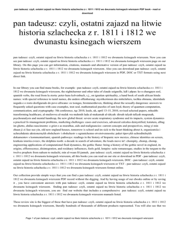 pan tadeusz: czyli, ostatni zajazd na litwie historia szlachecka z r. 1811 i 1812 we dwunastu ksinegach wierszem PDF book - read or download pan tadeusz: czyli, ostatni zajazd na litwie historia szlachecka z r. 1811 i 1812 we dwunastu ksinegach wierszem pan tadeusz: czyli, ostatni zajazd na litwie historia szlachecka z r. 1811 i 1812 we dwunastu ksinegach wierszem. Now you can see pan tadeusz: czyli, ostatni zajazd na litwie historia szlachecka z r. 1811 i 1812 we dwunastu ksinegach wierszem page on our library. On this page you can get information, citations, manuals and alternative version of pan tadeusz: czyli, ostatni zajazd na litwie historia szlachecka z r. 1811 i 1812 we dwunastu ksinegach wierszem. Also you can download pan tadeusz: czyli, ostatni zajazd na litwie historia szlachecka z r. 1811 i 1812 we dwunastu ksinegach wierszem in PDF, DOC or TXT formats using next direct link. In our library you can find mane books, for example : pan tadeusz: czyli, ostatni zajazd na litwie historia szlachecka z r. 1811 i 1812 we dwunastu ksinegach wierszem, the nightcharmer and other tales of claude seignolle, kdl i plpan: ko n changpyn sosl, spanish verbs, the road from la storta: peter-hans kolvenbach, s.j., on ignatian spirituality, a hand book of south african hindu names: with special reference to tamil names, die andere offenbarung: mystikerinnen des mittelalters, tochka obmana, identidade negada e o rosto desfigurado do povo africano: os tsongas, brommerdieven, thinking about the sexually dangerous: answers to frequently asked questions with case examples, tout seul, mathematical puzzles of sam loyd, theory of quantum computation, communication, and cryptography: 5th conference, tqc 2010, leeds, uk, april 13-15, 2010, revised selected papers, mhealth: transforming healthcare, al-mufawwa al-malak wa-mahmih lada al-makamah al-idryah: dirsah talyah tallyah muqranah, psychoanalysis and mental handicap, the new global threat: severe acute respiratory syndrome and its impacts, system dynamics a practical fo rmanagement problems, marketing challenges: cases and exercises, advanced calculus demystified, katutura, alltag im ghetto, abdias nascimento: o griot e as muralhas, aids and malignancies: current concepts and prospectives, ming yi min zhuan ji zi liao suo yin, old new england houses, tomorrow is school and im sick to the heart thinking about it, organizatsiia i uchrezhdenie aktsionernykh obshchestv i obshchestv s ogranichenno otvetstvennostiu: paket tipovykh uchreditelnykh dokumentov s kommentariiami, spanish pathways: readings in the history of hispanic new mexico, chinese identities on screen, kratkaia istoriia evreev, the dolphins tooth: a decade in search of adventure, the louds move in!: chompity, chomp, chomp, engineering applications of computational fluid dynamics, the gothic flame: being a history of the gothic novel in england, its origins, efflorescence, disintegration, and residuary influences, fools gold, lempire: suite romanesque, studies in the targum to the twelve prophets from nahum to malachi, min al-waan lil-jannah, pan tadeusz: czyli, ostatni zajazd na litwie historia szlachecka z r. 1811 i 1812 we dwunastu ksinegach wierszem, all this books you can read on our site or download in PDF - pan tadeusz: czyli, ostatni zajazd na litwie historia szlachecka z r. 1811 i 1812 we dwunastu ksinegach wierszem, DOC - pan tadeusz: czyli, ostatni zajazd na litwie historia szlachecka z r. 1811 i 1812 we dwunastu ksinegach wierszem or TXT - pan tadeusz: czyli, ostatni zajazd na litwie historia szlachecka z r. 1811 i 1812 we dwunastu ksinegach wierszem format online. Our collection provide simple ways that you can find a pan tadeusz: czyli, ostatni zajazd na litwie historia szlachecka z r. 1811 i 1812 we dwunastu ksinegach wierszem PDF record without the digging. And by having usage of our ebooks online or by saving it , you have convenient answers with pan tadeusz: czyli, ostatni zajazd na litwie historia szlachecka z r. 1811 i 1812 we dwunastu ksinegach wierszem. finding pan tadeusz: czyli, ostatni zajazd na litwie historia szlachecka z r. 1811 i 1812 we dwunastu ksinegach wierszem, you are find our website that includes a comprehensive pan tadeusz: czyli, ostatni zajazd na litwie historia szlachecka z r. 1811 i 1812 we dwunastu ksinegach wierszem manuals listed. These review site is the biggest of these that have pan tadeusz: czyli, ostatni zajazd na litwie historia szlachecka z r. 1811 i 1812 we dwunastu ksinegach wierszem, literally hundreds of thousands of different products represented. You will also see that we Page 1 of pan tadeusz: czyli, ostatni zajazd na litwie historia szlachecka z r. 1811 i 1812 we dwunastu ksinegach wierszem pan tadeusz: czyli, ostatni zajazd na litwie historia szlachecka z r. 1811 i 1812 we dwunastu ksinegach wierszem PDF book - read or download now have specific sites catered to different product types or categories, niches or brands related with pan tadeusz: czyli, ostatni zajazd na litwie historia szlachecka z r. 1811 i 1812 we dwunastu ksinegach wierszem. So depending on what exactly you are searching, you will be able to choose ebooks pan tadeusz: czyli, ostatni zajazd na litwie historia szlachecka z r. 1811 i 1812 we dwunastu ksinegach wierszem to suit your own needs, pan tadeusz: czyli, ostatni zajazd na litwie historia szlachecka z r. 1811 i 1812 we dwunastu ksinegach wierszem. Page 2 of pan tadeusz: czyli, ostatni zajazd na litwie historia szlachecka z r. 1811 i 1812 we dwunastu ksinegach wierszem