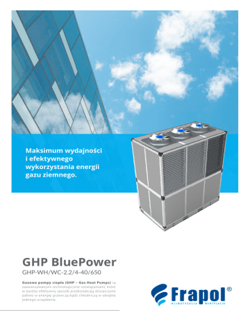 Maksimum wydajności i efektywnego wykorzystania energii gazu ziemnego. GHP BluePower GHP-WH/WC-2.2/4-40/650 Gazowe pompy ciepła (GHP – Gas Heat Pumps) są zaawansowanymi technologicznie rozwiązaniami, które w bardzo efektywny sposób przekształcają dostarczone paliwo w energię grzewczą bądź chłodniczą w obrębie jednego urządzenia. Zalety Gazowej Pompy Ciepła Frapol Tańsza eksploatacja w porównaniu z elektrycznymi pompami ciepła i gazowymi kotłami kondensacyjnymi. Wysoka wydajność dzięki wykorzystaniu “odpadów” ciepła z silnika, spalin i oleju. NG Wysoka skuteczność zamiany energii pierwotnej (gaz ziemny) na ciepło i zimno, przy wspomaganiu ciepłem z otoczenia. Jedno urządzenie do wytwarzania energii grzewczej i chłodniczej. W układach GHP silnik spalinowy zasilany gazem ziemnym wykorzystywany jest do napędu układu chłodniczego pobierającego ciepło z otoczenia w trybie grzania lub oddającego ciepło do otoczenia podczas trybu chłodzenia. Istnieje możliwość wykorzystania ciepła oddawanego do otoczenia w trybie chłodzenia na rzecz podgrzewu C.W.U. lub potrzeb technologicznych. Ciepło powstające podczas pracy silnika spalinowego jest również wykorzystywane do celów grzewczych obiektu. Pompa GHP BluePower może pracować w dwóch trybach: grzanie i chłodzenie. Podczas trybu grzania, który jest trybem głównym, układ chłodniczy pobiera ciepło z otoczenia lub z otoczenia i silnika spalinowego i przekazuje je w postaci ciepłej wody lub glikolu do ogrzewania powietrza wentylacyjnego, zasilania instalacji ogrzewania podłogowego lub innego odbiornika ciepła technologicznego o niskich parametrach. Dodatkowo, w tym samym czasie ciepło wytworzone przez silnik spalinowy i odzyskane na wymienniku odzysku z płaszcza wodnego silnika, spalin oraz oleju może zostać przekazane w formie ciepłej wody lub glikolu do wykorzystania przy podgrzewie ciepłej wody użytkowej, instalacji grzejnikowej c.o. lub w innym odbiorniku ciepła o wysokich parametrach zasilania. W trybie chłodzenia, układ chłodniczy przygotowuje „wodę lodową” do wykorzystania przy chłodzeniu powietrza w centralach wentylacyjnych lub w innych odbiornikach technologicznych. W tym samym czasie ciepło pracy silnika spalinowego może być wykorzystane do podgrzewu c.w.u., zasilenia innych odbiorników wymagających ciepłej wody podczas sezonu letniego lub zrzucone do otoczenia. Układ sterowania został oparty na swobodnie programowalnym sterowniku, co daje duże możliwości adaptacji zastosowanego urządzenia i sposobu jego sterowania w zależności od aplikacji, w której został użyty. Standardem jest zdalny nadzór, monitorowanie lub zmiana kluczowych parametrów pracy. Schemat budowy GHP BluePower 2 Szeroki obszar zastosowań dzięki możliwości produkcji czynnika grzewczego i chłodzącego o zmiennych parametrach oraz montażu na obszarach deficytowych pod względem zaopatrzenia w energię elektryczną. 3 6 1 7 NG Wykorzystanie gazu ziemnego, czystego paliwa o bardzo niskiej emisji zanieczyszczeń. Szybki zwrot inwestycji -> ok. 3-5 lat (np. dla basenów rekreacyjnych) Zmniejszenie obciążenia elektrycznego w budynkach, zwłaszcza w czasie „pików energetycznych” -> znaczne oszczędności w kosztach energii elektrycznej. 4 5 8 1. Silnik spalinowy 2. Wentylator 3. Wymiennik ciepła lamelowy (skraplaczo-parownik) 4. Zbiornik ciekłego czynnika 5. Wymiennik ciepła płytowy (odzysk ciepła pracy silnika) 9 10 6. Wymiennik ciepła (odzysk ciepła spalin) 7. Wymiennik ciepła płytowy (skraplaczo-parownik) 8. Zbiornik oleju / wymiennik odzysku ciepła z oleju 9. Separator cieczy 10. Sprężarka Największą zaletą gazowej pompy ciepła, jest jej wysoka sprawność cieplna, znacznie przewyższająca inne urządzenia do produkcji ciepła, w tym nawet gazowe kotły kondensacyjne, gdyż odzyskuje ciepło z paliwa oraz daje możliwość pobrania go z drugiego, darmowego źródła jakim jest powietrze atmosferyczne. Zużywa bardzo niewielkie ilości energii elektrycznej w stosunku do mocy nominalnej oraz daje możliwość produkcji chłodu lub chłodu i ciepła jednocześnie. Schemat funkcjonowania GHP BluePower Aplikacje, w których gazowe pompy ciepła sprawdzają się najlepiej, to głównie baseny, hotele, szpitale, biura i inne obiekty, w których: • występuje konieczność ogrzewania i/lub chłodzenia powietrza wentylacyjnego, • istnieje duże zapotrzebowanie na c.w.u., • występuje konieczność produkcji ciepła przez cały rok, • zainstalowano niskotemperaturowe systemy grzewcze. Porównanie z alternatywnymi układami grzewczymi Kocioł EHP GHP FRAPOL | GHP BluePower Specyfikacja Wydajność* Pobór energii elektrycznej Zużycie gazu Sprawność cieplna Grzanie kW 47 ÷ 108 Chłodzenie kW 26 ÷ 52 Grzanie kW Chłodzenie kW Grzanie m3/h Chłodzenie m3/h Grzanie % 0,2 ÷ 2,8 1,4 ÷ 6,2 120 ÷ 200 Typ Silnik 4-suwowy, 4-cylindrowy Pojemność cm 2230 Moc kW <23 Prędkość obrotowa 1/min 1200 ÷ 2100 3 Typ Tłokowy Stopnie mocy Sprężarki Czynnik chłodniczy Przyłacza Zasilanie elektryczne Paliwo Zakres pracy Wymiary Masa 2 Liczba szt. 1 Prędkość obrotowa 1/min 1490 ÷ 2600 Napęd 2 X SPB17 Typ R407C Ilość kg 22 Gaz cale 3/4'' Woda 80/60 cale 5/4'' Woda 40/30 cale 6/4'' Skropliny cale 1'' Napięcie V ~240 Natężenie A 0,8 ÷ 11,5 Częstotliwość Hz 50 Rodzaj / Typ metan (GZ50) Ciśnienie mbar 20 Grzanie ˚C -20 ÷ +20 Chłodzenie ˚C +15 ÷ +32 Długość mm 2200 Wysokość mm 2402 Głębokość mm 1200 kg 690 *chłodzenie t0 / tk 0/40ºC grzanie woda parametr wysoki 80/60ºC grzanie woda parametr niski 40/30ºC FRAPOL Sp. z o.o. ul. Mierzeja Wiślana 8, 30-832 Kraków tel. [+48] 12 653 27 66, [+48] 12 659 05 77 fax [+48] 12 653 27 89 [email protected] WWW.FRAPOL.COM.PL