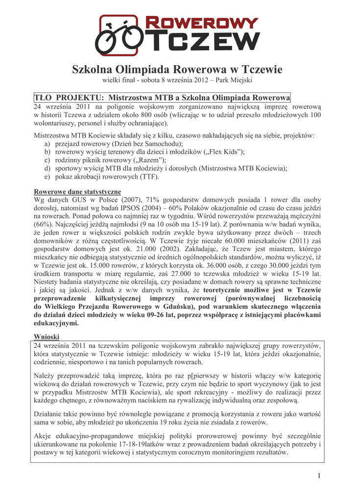 Szkolna Olimpiada Rowerowa w Tczewie wielki finał - sobota 8 września 2012 – Park Miejski TŁO PROJEKTU: Mistrzostwa MTB a Szkolna Olimpiada Rowerowa 24 września 2011 na poligonie wojskowym zorganizowano największą imprezę rowerową w historii Tczewa z udziałem około 800 osób (wliczając w to udział przeszło młodzieŜowych 100 wolontariuszy, personel i słuŜby ochraniające). Mistrzostwa MTB Kociewie składały się z kilku, czasowo nakładających się na siebie, projektów: a) przejazd rowerowy (Dzień bez Samochodu); b) rowerowy wyścig terenowy dla dzieci i młodzików („Flex Kids”); c) rodzinny piknik rowerowy („Razem”); d) sportowy wyścig MTB dla młodzieŜy i dorosłych (Mistrzostwa MTB Kociewia); e) pokaz akrobacji rowerowych (TTF). Rowerowe dane statystyczne Wg danych GUS w Polsce (2007), 71% gospodarstw domowych posiada 1 rower dla osoby dorosłej, natomiast wg badań IPSOS (2004) – 60% Polaków okazjonalnie od czasu do czasu jeździ na rowerach. Ponad połowa co najmniej raz w tygodniu. Wśród rowerzystów przewaŜają męŜczyźni (66%). Najczęściej jeŜdŜą najmłodsi (9 na 10 osób ma 15-19 lat). Z porównania w/w badań wynika, Ŝe jeden rower u większości polskich rodzin zwykle bywa uŜytkowany przez dwóch – trzech domowników z róŜną częstotliwością. W Tczewie Ŝyje niecałe 60.000 mieszkańców (2011) zaś gospodarstw domowych jest ok. 21.000 (2002). Zakładając, Ŝe Tczew jest miastem, którego mieszkańcy nie odbiegają statystycznie od średnich ogólnopolskich standardów, moŜna wyliczyć, iŜ w Tczewie jest ok. 15.000 rowerów, z których korzysta ok. 36.000 osób, z czego 30.000 jeździ tym środkiem transportu w miarę regularnie, zaś 27.000 to tczewska młodzieŜ w wieku 15-19 lat. Niestety badania statystyczne nie określają, czy posiadane w domach rowery są sprawne techniczne i jakiej są jakości. Jednak z w/w danych wynika, Ŝe teoretycznie moŜliwe jest w Tczewie przeprowadzenie kilkutysięcznej imprezy rowerowej (porównywalnej liczebnością do Wielkiego Przejazdu Rowerowego w Gdańsku), pod warunkiem skutecznego włączenia do działań dzieci młodzieŜy w wieku 09-26 lat, poprzez współpracę z istniejącymi placówkami edukacyjnymi. Wnioski 24 września 2011 na tczewskim poligonie wojskowym zabrakło największej grupy rowerzystów, która statystycznie w Tczewie istnieje: młodzieŜy w wieku 15-19 lat, która jeździ okazjonalnie, codziennie, niesportowo i na tanich popularnych rowerach. NaleŜy przeprowadzić taką imprezę, która po raz p[pierwszy w historii włączy w/w kategorię wiekową do działań rowerowych w Tczewie, przy czym nie będzie to sport wyczynowy (jak to jest w przypadku Mistrzostw MTB Kociewia), ale sport rekreacyjny - moŜliwy do realizacji przez kaŜdego chętnego, z równowaŜnym naciskiem na rywalizację indywidualną oraz zespołową. Działanie takie powinno być równolegle powiązane z promocją korzystania z roweru jako wartość sama w sobie, aby młodzieŜ po ukończeniu 19 roku Ŝycia nie zsiadała z rowerów. Akcje edukacyjno-propagandowe miejskiej polityki prorowerowej powinny być szczególnie ukierunkowane na pokolenie 17-18-19latków wraz z prowadzeniem badań określających potrzeby i postawy w tej kategorii wiekowej i statystycznym corocznym monitoringiem rezultatów. 1 Powstanie spójnego, wieloletniego młodzieŜowego edukacyjnego programu prorowerowego, dopasowanego do tczewskich realiów, tj. konkretnych instytucji i organizacji, wymagałoby minimum jednorocznej dyskusji róŜnych tczewskich gremiów i podmiotów organizacyjnych, włączając to takŜe Flextronics (program: bezpieczna droga do szkoły). Jako koło zamachowe otwierające działania do realizacji młodzieŜowej bezpiecznej i zdrowej edukacji prorowerowej (rozumianej jako promowanie codziennego korzystania z roweru przez całe Ŝycie) proponuję zorganizowanie i przeprowadzenie Międzyszkolnej Olimpiady Rowerowej 2012 CEL OGÓLNY Promocja korzystania z roweru wśród młodzieŜy (a zwłaszcza wśród dziewcząt), tuŜ przed osiągnięciem wieku 19 lat, w którym zwyczaj korzystania z roweru w Polsce gwałtownie spada. Uzasadnienia projektu: aksjologiczne, edukacyjne, ekologiczne, zdrowotne i komunikacyjne. CEL SZCZEGÓŁOWY Zorganizowanie dwustopniowej Międzyszkolnej Olimpiady Rowerowej w roku 2012, obejmującej: 1 stopień – eliminacje szkolne (wpierw wewnątrzklasowe, potem ogólnoszkolne) np. wokół szkolnych boisk (na ŜuŜlu) lub pobliskich terenach zielonych, w okresie po wystawieniu ocen a jeszcze przed wakacjami; 2 stopień – pojedynek między szkołami na łatwej ale urozmaiconej trasie w parku miejskim, po wakacjach, pod nazwą Międzyszkolna Olimpiada Rowerowa, na tydzień przed Mistrzostwami Kociewia. Zwycięzcom proponowałoby się start w Mistrzostwach, na łatwej trasie amatorskiej. Umiejscowienie imprezy w Parku Miejskim stworzy moŜliwość: 1) łatwego dotarcia na Olimpiadę kibicom bez rowerów, ze względu na dobre skomunikowanie centrum miasta z peryferiami, co moŜe znacząco zwiększyć ich udział, takŜe ze względu na bliskie sąsiedztwo kilku szkół w okolicy; 2) wytyczenie trasy, która byłaby widoczna dla widzów w 50-70% długości (poligon nie daje tej moŜliwości), co wpłynie na atrakcyjność i widowiskowość imprezy, i podniesie bezpieczeństwo startujących, poniewaŜ organizatorzy będą widzieć całą trasę. Terminowo moŜliwy jest teŜ wariant, Ŝe Olimpiada w całości odbyłaby się przed wakacjami. Olimpiada Rowerowa musiałaby być równolegle realizowana z tworzeniem bezpiecznych (m.in. monitorowanych) parkingów rowerowych dla uczniów, wraz z analizą układu dróg osiedlowych wokół kaŜdej szkoły pod kątem bezpiecznego dojazdu z domu do szkoły oraz przemieszczaniem patroli policji drogowej i straŜy miejskiej w pobliŜe szkół w godzinach najwyŜszego nasilenia ruchu rowerowego ze strony uczniów. PARTNERZY Urząd Miasta Tczewa, T