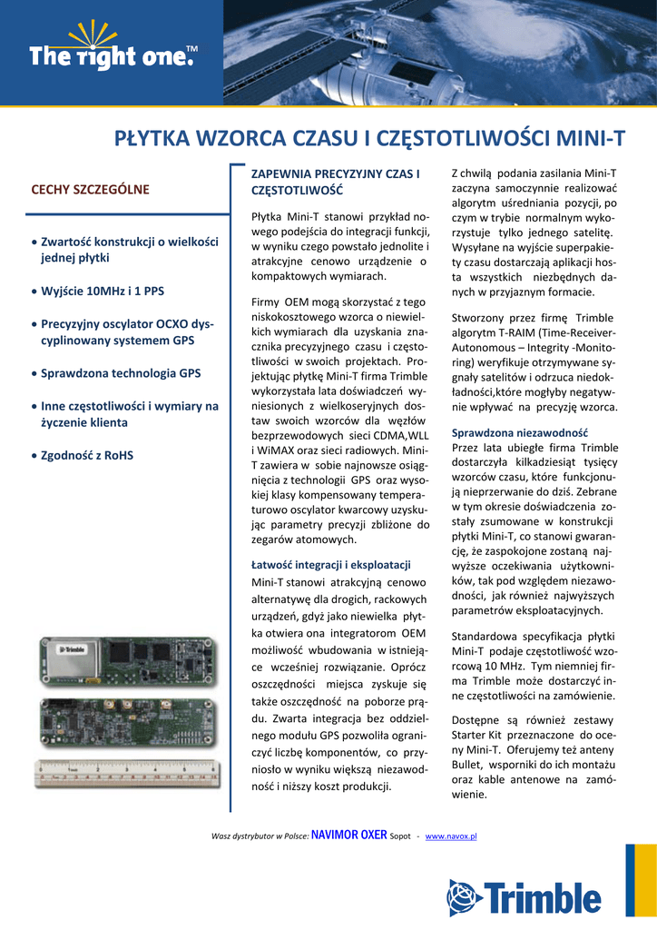 TM PŁYTKA WZORCA CZASU I CZĘSTOTLIWOŚCI MINI‐T CECHY SZCZEGÓLNE ZAPEWNIA PRECYZYJNY CZAS I CZĘSTOTLIWOŚĆ Płytka Mini‐T stanowi przykład no‐ wego podejścia do integracji funkcji, w wyniku czego powstało jednolite i atrakcyjne cenowo urządzenie o kompaktowych wymiarach. • Zwartość konstrukcji o wielkości jednej płytki • Wyjście 10MHz i 1 PPS • Precyzyjny oscylator OCXO dys‐ cyplinowany systemem GPS • Sprawdzona technologia GPS • Inne częstotliwości i wymiary na życzenie klienta • Zgodność z RoHS Firmy OEM mogą skorzystać z tego niskokosztowego wzorca o niewiel‐ kich wymiarach dla uzyskania zna‐ cznika precyzyjnego czasu i często‐ tliwości w swoich projektach. Pro‐ jektując płytkę Mini‐T firma Trimble wykorzystała lata doświadczeń wy‐ niesionych z wielkoseryjnych dos‐ taw swoich wzorców dla węzłów bezprzewodowych sieci CDMA,WLL i WiMAX oraz sieci radiowych. Mini‐ T zawiera w sobie najnowsze osiąg‐ nięcia z technologii GPS oraz wyso‐ kiej klasy kompensowany tempera‐ turowo oscylator kwarcowy uzysku‐ jąc parametry precyzji zbliżone do zegarów atomowych. Łatwość integracji i eksploatacji Mini‐T stanowi atrakcyjną cenowo alternatywę dla drogich, rackowych urządzeń, gdyż jako niewielka płyt‐ ka otwiera ona integratorom OEM możliwość wbudowania w istnieją‐ ce wcześniej rozwiązanie. Oprócz oszczędności miejsca zyskuje się także oszczędność na poborze prą‐ du. Zwarta integracja bez oddziel‐ nego modułu GPS pozwoliła ograni‐ czyć liczbę komponentów, co przy‐ niosło w wyniku większą niezawod‐ ność i niższy koszt produkcji. Z chwilą podania zasilania Mini‐T zaczyna samoczynnie realizować algorytm uśredniania pozycji, po czym w trybie normalnym wyko‐ rzystuje tylko jednego satelitę. Wysyłane na wyjście superpakie‐ ty czasu dostarczają aplikacji hos‐ ta wszystkich niezbędnych da‐ nych w przyjaznym formacie. Stworzony przez firmę Trimble algorytm T‐RAIM (Time‐Receiver‐ Autonomous – Integrity ‐Monito‐ ring) weryfikuje otrzymywane sy‐ gnały satelitów i odrzuca niedok‐ ładności,które mogłyby negatyw‐ nie wpływać na precyzję wzorca. Sprawdzona niezawodność Przez lata ubiegłe firma Trimble dostarczyła kilkadziesiąt tysięcy wzorców czasu, które funkcjonu‐ ją nieprzerwanie do dziś. Zebrane w tym okresie doświadczenia zo‐ stały zsumowane w konstrukcji płytki Mini‐T, co stanowi gwaran‐ cję, że zaspokojone zostaną naj‐ wyższe oczekiwania użytkowni‐ ków, tak pod względem niezawo‐ dności, jak również najwyższych parametrów eksploatacyjnych. Standardowa specyfikacja płytki Mini‐T podaje częstotliwość wzo‐ rcową 10 MHz. Tym niemniej fir‐ ma Trimble może dostarczyć in‐ ne częstotliwości na zamówienie. Dostępne są również zestawy Starter Kit przeznaczone do oce‐ ny Mini‐T. Oferujemy też anteny Bullet, wsporniki do ich montażu oraz kable antenowe na zamó‐ wienie. Wasz dystrybutor w Polsce: NAVIMOR OXER Sopot ‐ www.navox.pl PŁYTKA WZORCA CZASU I CZĘSTOTLIWOŚCI MINI‐T OGRANICZENIA ŚRODOWISKA PARAMETRY PRACY Temperatura pracy………........................................…..…..0°C do +60°C Temperatury składowania…….................................... ‐ 40°C do +85°C Wilgotność pracy…...................................5% do 95% bez kondensacji Ogólnie………odbiornik śledzący ciągle częstotliwość L1, kod CA (SPS), 12 kanałów Częstość odświeżania……….............................................…………….1 Hz Dokładność PPS…...................................................…15 nsek (1sigma) Częstotliwość wzorcowa………........................................……….10 MHz Szumy fazowe……………...............................................10 Hz ‐120 dBc 100 Hz ‐135 dBc 1 kHz ‐135 dBc 10 kHz ‐145 dBc 100 kHz ‐145 dBc Parametry częstotliwości 10 MHz Postać fali…...............................................……………………..sinusoidalna Oporność źródła……….......................................................…………...50Ω Amplituda……..............................................……5 dBm ± 2.5 dB w 50Ω Harmoniczne…………….............................................……….……<‐30 dBc Niepożądane….……….........................................................…..<‐70 dBc ‐12 Dokładność…….................................…..1,16 x 10 (średnia dobowa) CHARAKTERYSTYKA INTERFEJSU Interfejs 1 PPS • SMAf, poziomy TTL, 50Ω, puls o szerokości 10 mikrosek ze zbo‐ czem narastającym zsynchronizowanym z GPS lepiej niż 15 nsek (1 sigma) w trybie statycznym • Czas narastania trwa < 20 nsek, na kształt pulsu wpływ ma rozłożona pojemność kabla/obwodu interfejsu 10 MHz…..............................................………………….……...…........ SMAf Złącze antenowe….............................................….…………………… SMAf Złącze zasilające i I/O…........................................…………….6‐pin Molex Pin 1……………..........................................……………............NC Pin 2…................................…..GPS TXD 3.3V, poziom CMOS Pin 3…....................................GPS RXD 3.3V, poziom CMOS (dopuszczalne 5V), podciągnięty do 3.3V przez opornik 10 kΩ Pin 4………………………………………………………………………….masa Pin 5……………………….....................................……antena +3V Współpracuje z 2.7V do 5.5V @ maks 100 mA Pin 6…....…+5V±0.25V@<750mA(zimny) i <350 mA (ciepły) Wykres wariancji Allan’a dla zmian stabilności Protokół szeregowy…..........binarny TSIP (Trimble Standard Interface Protocol) @9600, 8‐None‐1 MONTOWANIE Otwory montażowe.................
