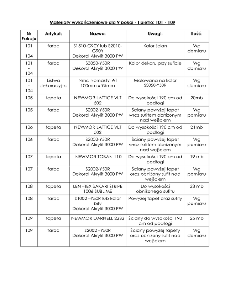 Materiały wykończeniowe dla 9 pokoi - I piętro: 101 - 109 Nr Pokoju Artykuł: Nazwa: Uwagi: Ilość: 101 104 farba S1510-G90Y lub S2010G90Y Dekoral Akrylit 3000 PW Kolor ścian Wg obmiaru 101 104 farba S3050-Y50R Dekoral Akrylit 3000 PW Kolor dekoru przy suficie Wg obmiaru 101 104 Listwa dekoracyjna Nmc Nomastyl AT 100mm x 95mm Malowana na kolor Wg obmiaru 105 tapeta NEWMOR LATTICE VLT 502 Do wysokości 190 cm od podłogi 20mb 105 farba S2002-Y50R Dekoral Akrylit 3000 PW Ściany powyżej tapet wraz sufitem obniżonym nad wejściem Wg pomiaru 106 tapeta NEWMOR LATTICE VLT 502 Do wysokości 190 cm od podłogi 21mb 106 farba S2002-Y50R Dekoral Akrylit 3000 PW Ściany powyżej tapet wraz sufitem obniżonym nad wejściem Wg pomiaru 107 tapeta NEWMOR TOBAN 110 Do wysokości 190 cm od podłogi 19 mb 107 farba S2002-Y50R Dekoral Akrylit 3000 PW Ściany powyżej tapet oraz obniżony sufit nad wejściem Wg pomiaru 108 tapeta LEN –TEX SAKARI STRIPE 1006 SUBLIME Do wysokości obniżonego sufitu 33 mb 108 farba S1002 –Y50R lub kolor biły Dekoral Akrylit 3000 PW Powyżej tapet oraz sufity Wg pomiaru 109 tapeta 109 farba S3050-Y50R NEWMOR DARNELL 2232 Ściany do wysokości 190 cm od podłogi S2002 –Y50R Dekoral Akrylit 3000 PW Ściany powyżej tapety oraz obniżony sufit nad wejściem 25 mb Wg obmiaru Kolor ścian wg NCS Tapety Newmor i Len-tex Nr pokoju S1510G90Y LATTICE VLT 502 TOBAN S.STRIPE DARNELL 110 1006 2232 101 TAK 102 TAK 103 TAK - - - - 104 TAK - - - - 105 - 20 - - - 106 - 21 - - - 107 - - 19 - - 108 - - - 33 - 109 - - - - 25 41 mb 19 mb 33 mb 25 mb Dodatkowe oświetlenie i osprzęt elektryczny Artykuł: Kinkiet Osprzęt elektryczny Nazwa: Alfa Roksana 16070 http://www.lampyalfa.pl/index.php?name=produkt&subn ame=6208&value=0 Uwagi: Ilość: Nad lustrem 2 szt. Kinkiet dostarczy Zamawiający. Kos Vena w kolorze patyna i krem Patyna - na panelach meblowych pod lustrami, na zagłówkach na panelach przy drzwiach do pokoju i łazienki Wg zestawienia Kos Vena w kolorze kremowym Biały - na ścinach Wg zestawienia