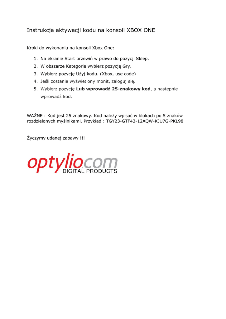 Instrukcja aktywacji kodu na konsoli XBOX ONE Kroki do wykonania na konsoli Xbox One: 1. Na ekranie Start przewiń w prawo do pozycji Sklep. 2. W obszarze Kategorie wybierz pozycję Gry. 3. Wybierz pozycję Użyj kodu. (Xbox, use code) 4. Jeśli zostanie wyświetlony monit, zaloguj się. 5. Wybierz pozycję Lub wprowadź 25-znakowy kod, a następnie wprowadź kod. WAŻNE : Kod jest 25 znakowy. Kod należy wpisać w blokach po 5 znaków rozdzielonych myślnikami. Przykład : TGY23-GTF43-12AQW-KJU7G-PKL98 Życzymy udanej zabawy !!!