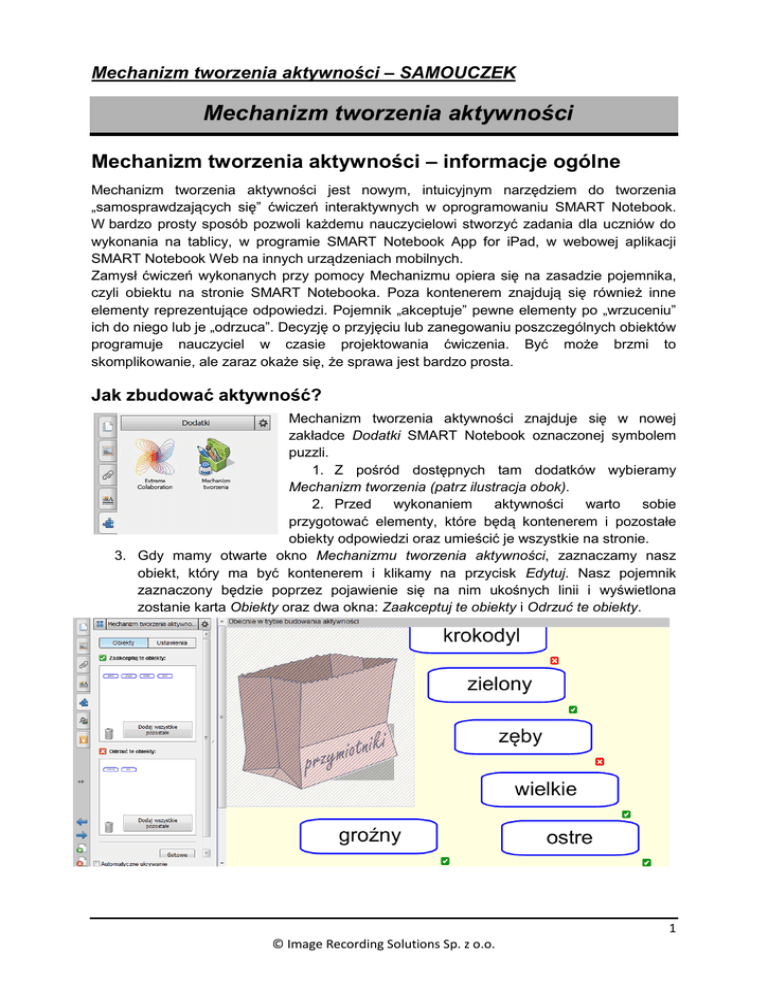 Mechanizm tworzenia aktywności – SAMOUCZEK Mechanizm tworzenia aktywności Mechanizm tworzenia aktywności – informacje ogólne Mechanizm tworzenia aktywności jest nowym, intuicyjnym narzędziem do tworzenia „samosprawdzających się” ćwiczeń interaktywnych w oprogramowaniu SMART Notebook. W bardzo prosty sposób pozwoli każdemu nauczycielowi stworzyć zadania dla uczniów do wykonania na tablicy, w programie SMART Notebook App for iPad, w webowej aplikacji SMART Notebook Web na innych urządzeniach mobilnych. Zamysł ćwiczeń wykonanych przy pomocy Mechanizmu opiera się na zasadzie pojemnika, czyli obiektu na stronie SMART Notebooka. Poza kontenerem znajdują się również inne elementy reprezentujące odpowiedzi. Pojemnik „akceptuje” pewne elementy po „wrzuceniu” ich do niego lub je „odrzuca”. Decyzję o przyjęciu lub zanegowaniu poszczególnych obiektów programuje nauczyciel w czasie projektowania ćwiczenia. Być może brzmi to skomplikowanie, ale zaraz okaże się, że sprawa jest bardzo prosta. Jak zbudować aktywność? Mechanizm tworzenia aktywności znajduje się w nowej zakładce Dodatki SMART Notebook oznaczonej symbolem puzzli. 1. Z pośród dostępnych tam dodatków wybieramy Mechanizm tworzenia (patrz ilustracja obok). 2. Przed wykonaniem aktywności warto sobie przygotować elementy, które będą kontenerem i pozostałe obiekty odpowiedzi oraz umieścić je wszystkie na stronie. 3. Gdy mamy otwarte okno Mechanizmu tworzenia aktywności, zaznaczamy nasz obiekt, który ma być kontenerem i klikamy na przycisk Edytuj. Nasz pojemnik zaznaczony będzie poprzez pojawienie się na nim ukośnych linii i wyświetlona zostanie karta Obiekty oraz dwa okna: Zaakceptuj te obiekty i Odrzuć te obiekty. 1 © Image Recording Solutions Sp. z o.o. Mechanizm tworzenia aktywności – SAMOUCZEK 4. Teraz przeciągamy do odpowiednich okien poszczególne elementy zgodnie z naszym pomysłem. Obiekty akceptowane zaznaczone zostaną zieloną krokiewką, a odrzucane czerwonym iksem. 5. W zakładce Ustawienia wybieramy rodzaj animacji dla poszczególnych grup elementów (wszystkie dostępne opcje opisane są w niżej zamieszczonej tabeli). 6. Po ustawieniu naszych preferencji naciskamy przycisk Gotowe i sprawdzamy, nasze ćwiczenie. Jeżeli wszystko działa przygotowaliśmy swoją pierwszą aktywność. WSKAZÓWKA: Jeżeli umieścimy już wszystkie obiekty w jednym oknie (akceptacji lub odrzucenia), to nie musimy pojedynczo umieszczać ich w drugim. Wystarczy kliknąć przycisk Dodaj wszystkie pozostałe, który automatycznie umieści wszelkie inne obiekty w oknie gdzie nacisnęliśmy ten przycisk. Ta opcja zaoszczędzi nam na pewno sporo czasu. Ustawienia dla obiektów Możliwe opcje wyboru zachowania się elementów po przesunięciu ich na kontener Gdy zostanie zaakceptowany, obiekt: Brak – brak animacji Znikanie na zewnątrz – obiekt znika (opcja domyślna) Wylot – element ucieka poza obrys okna i znika Przesuń do środka – przedmiot zostanie ustawiony na środku kontenera Obrót –przedmiot obraca się kilkakrotnie wokół swojego środka Gdy zostanie odrzucony obiekt: Brak – brak animacji Odbij – obiekt powraca na swoje pierwotne miejsce (opcja domyślna) Odtwórz także dźwięk obiektu Zaznaczenie tego pola wyboru spowoduje odtworzenie przypisanego do obiektu po przeniesieniu na pojemnik. dźwięku WSKAZÓWKA METODYCZNA: Zgodnie z zasadami ćwiczenie powinno być skonstruowane tak, aby uczniowie jak najdłużej mogli widzieć na tablicy poprawne odpowiedzi, a błędne jak najkrócej, po to aby utrwalać wiedzę przekazywaną przez aktywność. Z opisanych w powyższej tabeli animacji należy wybierać, te które po przesunięciu poprawnej odpowiedzi na kontener cały czas ją będą prezentowały, a unikać raczej tych gdzie poprawna odpowiedź gdzieś znika. Jako przykład dobrego rozwiązania można podać animację Odbij, która niepoprawną odpowiedź od razu cofa na swoje poprzednie miejsce i dzięki temu uczniowie nie utrwalają sobie błędnych informacji, a sama animacja daje jednoznaczny przekaz słuchaczom, że ten element tu nie pasuje. Pozostałe opcje w Mechanizmie tworzenia aktywności Zerowanie lub Resetuj wszystko Co zrobić, aby przygotowana przez nas aktywność po wykonaniu jej przez uczniów powróciła do stanu z przed jej rozwiązania? W tym celu w zakładce Mechanizmu tworzenia aktywności wystarczy nacisnąć opcję Resetuj wszystko lub Zerowanie. Obie opisane funkcje mają takie samo działanie. Ikona kosza Co zrobić, gdy pomylimy się i dodamy do listy akceptowanych lub odrzucanych obiektów zły przedmiot. Wystarczy przeciągnąć taki element na ikonę kosza znajdującego się w danym oknie, aby go usunąć z tej grupy. Identyfikuj 2 © Image Recording Solutions Sp. z o.o. Mechanizm tworzenia aktywności – SAMOUCZEK Czasami widzimy ćwiczenie, które nie jest przez nas przygotowane i na pierwszy rzut oka nie bardzo wiemy jak powinno działać, gdzie na stronie są kontenery, a gdzie odpowiedzi. W takim przypadku niezbędna będzie funkcja Identyfikuj, która pokazuje pojemniki poprzez wyświetlenie na nich ukośnych linii przez czas 3 sekund. Edycja Już przygotowane ćwiczenia zawsze możemy modyfikować dzięki funkcji Edytuj, która otworzy w zakładce Mechanizmu zakładki Obiekty i Ustawienia. Tam możemy w dowolny sposób zmieniać wszystkie dostępne parametry przygotowanej przez nas aktywności. Wyczyść właściwości Jeżeli potrzebujemy wyczyścić zawartość obu okien (akceptacji i odrzucenia) poprzez jedno kliknięcie, bez usuwania kontenerów, to musimy skorzystać z funkcji Wyczyść właściwości. Po jej zastosowaniu możemy od nowa układać elementy na obu listach. Pomysły na ćwiczenia W ilustracji pokazanej na ilustracji ze strony pierwszej mamy tylko jeden kontener, ale można przecież umieścić ich dwa lub więcej. Pozwala to na przygotowanie wielu aktywności, gdzie wykorzystujemy sortowanie