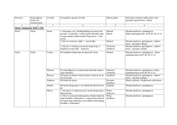 Dorzecze Rzeka główna krainy ryb łososiowatych 1 2 Okręg Nadnotecki PZW w Pile Łowisko Warta Gwda Noteć Noteć Gwda 3 Szczegółowe granice łowiska Miasto gmina 4 5 Dozwolone metoda wędkowania i inne specjalne ograniczenia i zakazy 6 1. Od granicy woj. Wielkopolskiego do mostu drogowego w Lędyczku z wyłączeniem zbiornika zaporowego między elektrowniami Węgorzewo – Łomczewo. 2. Od w/w mostu do „dębu” – trzecia łąka. Okonek Złotów Metoda muchowa i spinningowa Zakaz spinningowania od 01.09. do 31.12. Okonek 3. Od jazu w Tarnówce do mostu drogowego w Krępsku na trasie Piła – Jastrowie. Tarnówka Szydłowo Metoda muchowa, spinningowa i spławikowa – przynęty roślinne. Metoda muchowa, spinningowa i spławikowa – przynęty roślinne Czarna Od wiaduktu kolejowego do ujścia do Gwdy. Okonek Metoda muchowa i spinningowa. Zakaz spinningowania od 01.09. do 31.12. Płytnica Na całej długości (z wyłączeniem zbiornika zaporowego Smolary). Od mostu na drodze leśnej Smolary-Tarnowo do ujścia do Gwdy. Od źródeł do ujścia. Jastrowie Tarnówka Szydłowo Metoda muchowa i spinningowa. Zakaz spinningowania od 01.09. do 31.12. Metoda muchowa, spinningowa i spławikowa – przynęty roślinne Obręb ochronny. Wędkowanie zabronione Rurzyca Pankawa Głomia Piława Od mostu drogowego w m. Dolnik do ujścia do Gwdy. 1. Od zapory w Nadarzycach do mostu drogowego w Głowaczewie. 2. Od w/w mostu do dolnej granicy obrębu hodowlanego Ośrodka w Zabrodziu ( z wyłączeniem zbiornika zaporowego Zabrodzie oraz obrębu hodowlanego Ośrodka w Zabrodziu) Plecemin Szydłowo Krajenka Wałcz Jastrowie Wałcz Szydłowo Metoda muchowa i spinningowa. Metoda muchowa i spinningowa. Metoda muchowa i spinningowa. 3. Od dolnej granicy obrębu hodowlanego Ośrodka w Zabrodziu do mostu drogowego Stara Łubianka Krępsko Szydłowo 4. Od mostu drogowego Stara ŁubiankaKrępsko Szydłowo do pierwszego gospodarstwa rolnego m. Dobrzyca. 5.Od w/w gospodarstwa do mostu betonowego w m. Szydłowo Dobrzyca. Gwda Noteć Piława Drawa Dobrzyca Płociczna Łowisko ochronne „Połączone” Metoda muchowa i spinningowa (haczyki i kotwiczki bezzadziorowe). Zakaz spinningowania od 01.09 do 31.01. Zakaz brodzenia na odcinku od dolnej granicy obrębu hodowlanego do połączenia z rzeką Dobrzyca od 01.10 do 30.06. Całkowity zakaz zabierania pstrąga potokowego i lipienia. Regulamin łowiska zamieszczony na stronie www.pzw.org.pl/pila Metoda muchowa i spinningowa. Metoda muchowa, spinningowa i spławikowa – przynęty roślinne. 1. Od wypływu z jeziora Machliny do mostu drogowego powyŜej I Ośrodka Pstrągowego w Tarnowie. Wałcz Szydłowo Metoda muchowa i spinningowa. Zakaz spinningowania od 01.09. do 31.12. 2. Od w/w mostu drogowego do mostu drogowego poniŜej drugiego Ośrodka Pstrągowego w Tarnowie z wyłączeniem obrębów hodowlanych przy ośrodkach pstrągowych (w ośrodku „Pstrąg Tarnowo” – prawy brzeg w obrębie hodowlanym udostępniony dla wędkarzy). 3.Od mostu drogowego poniŜej drugiego Ośrodka Pstrągowego w Tarnowie do połączenia z Piławą Szydłowo Metoda muchowa i spinningowa. Szydłowo Od źródeł do granicy Drawieńskiego Parku Narodowego. Tuczno Łowisko ochronne „Połączone” Metoda muchowa i spinningowa (haczyki i kotwiczki bezzadziorowe). Zakaz spinningowania od 01.09 do 31.01. Całkowity zakaz zabierania pstrąga potokowego i lipienia. Regulamin łowiska zamieszczony na stronie www.pzw.org.pl/pila Metoda muchowa i spinningowa. Drawa Płociczna Runica Od wypływu z jeziora Tuczno do granicy Drawieńskiego Parku Narodowego. Tuczno Metoda muchowa i spinningowa. Zakaz spinningowania od 01.09. do 31.12. Cieszynka 1. Od źródeł do jeziora Staw Młyński. Człopa 2. Od wypływu z jeziora Dubie do granicy Drawieńskiego Parku Narodowego. Od spiętrzenia w Rychlickim Młynie do mostu kolejowego w m. Herburtowo Od źródeł do ujścia do Bukówki Od źródeł do ujścia do Bukówki Od źródeł do ujścia do Bukówki Człopa Metoda muchowa i spinningowa. Zakaz spinningowania od 01.09. do 31.12. Metoda muchowa i spinningowa. Zakaz spinningowania od 01.09. do 31.12. Metoda muchowa i spinningowa. Zakaz spinningowania od 01.09. do 31.12. Obręb ochronny. Wędkowanie zabronione Obręb ochronny. Wędkowanie zabronione Obręb ochronny. Wędkowanie zabronione Warta Noteć Bukówka Noteć Bukówka Mokrzyca DzierŜąŜna Zbrzyca Uwaga !!! Adres biura ON PZW ul. Śniadeckich 136/4, 64-920 PIŁA. Wieleń KrzyŜ Trzcianka Wieleń Wieleń Załącznik do uchwała nr 14/Z/2011 Zarządu ON PZW w Pile z dnia 20.06.2011 r.