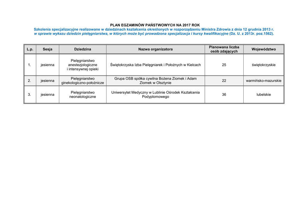 PLAN EGZAMINÓW PAŃSTWOWYCH NA 2017 ROK Szkolenia specjalizacyjne realizowane w dziedzinach kształcenia określonych w rozporządzeniu Ministra Zdrowia z dnia 12 grudnia 2013 r. w sprawie wykazu dziedzin pielęgniarstwa, w których może być prowadzona specjalizacja i kursy kwalifikacyjne (Dz. U. z 2013r. poz.1562). L.p. Sesja Dziedzina Nazwa organizatora Planowana liczba osób zdających Województwo 1. jesienna Pielęgniarstwo anestezjologiczne i intensywnej opieki Świętokrzyska Izba Pielęgniarek i Położnych w Kielcach 25 świętokrzyskie 2. jesienna Pielęgniarstwo ginekologiczno-położnicze Grupa OSB spółka cywilna Bożena Ziomek i Adam Ziomek w Olsztynie 22 warmińsko-mazurskie 3. jesienna Pielęgniarstwo neonatologiczne Uniwersytet Medyczny w Lublinie Ośrodek Kształcenia Podyplomowego 36 lubelskie
