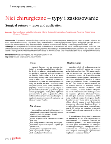 Chirurgia jamy ustnej _ Nici Nici chirurgiczne – typy i zastosowanie Surgical sutures – types and application Autorzy_Szymon Frank, Maja Chmielewska, Michał Dudziński, Magdalena Rączkiewicz, Adrianna Rosochacka i Andrzej Wojtowicz Streszczenie: Przy szerokiej dostępności różnych nici chirurgicznych trudno zdecydować, która będzie w danym przypadku najlepsza. Nici różnią się materiałem i strukturą, połączeniem z igłą, resorbowalnością, charakterystyką mechaniczną oraz reakcją wywoływaną w tkankach. Dotychczas, pomimo szerokiej gamy materiałów i metod produkcji, nie stworzono nici idealnej. Każda z dostępnych ma wady i zalety. Summary: With a large selection of available sutures it can be dificult to decide which one will be the most appropriate in a particular case. Differences include material, structure and mechanic properties of a thread, type of needle and their junction, absorption rate and tissue reaction. Despite a broad spectrum of materials and fabrication methods, no ideal suture exists. Every considerable option has its’ strengths and weaknesses. Słowa kluczowe: szwy chirurgiczne, nici chirurgiczne, gojenie się ran. Key words: sutures, surgical sutures, wound healing. _Wstęp _Struktura nici Łączenie brzegów ran za pomocą „igły i nitki” to technika znana ludzkości od tysięcy lat. Szycie ran lnianymi nićmi udokumentowane zostało na egipskich papirusach mających ok. 5000 lat. Galen, żyjący w II w. n.e. wprowadził szwy wykonywane z wnętrzności zwierzęcych.1 Przez wieki zmieniały się materiały używane do wyrobu nici chirurgicznych: od trawy, lnu, konopi, ludzkich i zwierzęcych włosów przez jedwab, złoto, srebro, stalowe linki, preparaty z tkanek zwierzęcych (np. catgut) aż po materiały syntetyczne, tj.: poliamid, poliester czy polipropylen.1 Nadal jednak wybór nie jest oczywisty, a opinie są podzielone. Duża rozbieżność materiałów zmusza chirurgów do zgłębiania charakterystycznych cech danej nici i dokonywania wyborów. Materiały, z których wykonywane są nici chirurgiczne podzielić można na resorbowalne i nieresorbowalne. Obie grupy zawierają nici syntetyczne i naturalne, o strukturze zarówno mono-, jak i multiilamentów. Monoilamenty powstają przez specjalne wytłaczanie z upłynnionego plastiku. W efekcie powstaje jednorodna, trwała i bardzo gładka nić. Taka struktura zarezerwowana jest dla cienkich włókien. Ze wzrostem średnicy monoilamentu wzrasta sztywność i trudność wiązania, a także trudność utrzymania węzła.6 Multiilamenty można podzielić na skręcane i plecione. Charakterystyczna dla nich jest nierówna powierzchnia, która może utrudniać przechodzenie przez tkanki. Dodatkowo szwy takie łatwo nasiąkają (capillary effect) i ulegają inwazji bakteryjnej, co pogarsza odpowiedź tkankową. Efekty te częściowo korygowane są za pomocą impregnacji. Ich zaletą jest mniejsza sztywność, łatwość wiązania oraz odporność węzła na rozwiązanie. _Nić idealna Najważniejsze cechy nici chirurgicznej1,4 to: _odpowiednia elastyczność i łatwość wiązania, _gładkie przechodzenie przez tkanki, _odporność na rozwiązanie, _pomoc w optymalnym zabezpieczeniu brzegów rany, _brak nasiąkania nici i iniltracji bakteryjnej, _minimalna odpowiedź zapalna i szybkie gojenie tkanek, _resorpcja nici w pożądanym czasie, _brak wywoływania alergii, _brak indukcji nowotworzenia. 26 implants 4_2014 W poszukiwaniu złotego środka stworzono nić powlekaną. Ma ona strukturę wewnętrzną multiilamentu, a z zewnątrz otoczona jest jednorodną powłoką. Taka budowa zabezpiecza szew przed nasiąkaniem, co zmniejsza kolonizację bakteryjną. Zewnętrzna osłonka wzmacnia nić i wyrównuje jej grubość na całej długości, zapobiegając segmentowemu rozplataniu i szarpaniu tkanek.6 Chirurgia jamy ustnej _ Nici _Materiały resorbowalne i resorbowalne Od wieków w chirurgii wykorzystywane są szwy jedwabne. Są one naturalne i łatwe do zawiązania, a węzły są małe, miękkie i wytrzymałe na rozciąganie.2 Jednak ze względu na plecioną lub skręcaną strukturę, nie są one optymalnym wyborem w środowisku jamy ustnej. Liczne badania wykazały, że użycie szwów jedwabnych oznacza większą penetrację bakterii w głąb rany, a przez to zwiększoną reakcję zapalną i opóźnione gojenie otaczających tkanek.1-5 W badaniach własnych przy użyciu nici jedwabnych (Silk, Resorba; Seralex, Serag-Wiessner) wykazano tendencję do strzępienia i pozostawania ich fragmentów w tkankach. Syntetyczną alternatywą jedwabiu są nieresorbowalne szwy poliestrowe, powlekane (np. Terylene, SeragWiessner; Supolene, Resorba) lub niepowlekane (Polyester, Resorba). Nici te są elastyczne i względnie łatwe do zawiązania. Powlekane charakteryzują się m.in. zwiększoną względem jedwabiu gładkością i łatwością przechodzenia przez tkanki. Monolifamenty nieulegające degradacji tkankowej wykonywane są np. z poliamidu, polipropylenu lub luorku poliwinylidenu (PVDF). Są to materiały o bardzo dużej gładkości, mało traumatyzujące dla tkanek.6 Przy użyciu takich nici poszarpanie tkanek jest minimalne (np. Seralene, Serag-Wiessner; Resolon, Resorba). Materiały resorbowalne to takie, które w określonym czasie od wprowadzenia tracą w tkanki odporność na rozciąganie w wyniku degradacji tkankowej i są wchłaniane.6 Do prekursorów tej grupy można zaliczyć catgut, wprowadzone przez Josepha Listera w XIX w. Są to naturalne materiały kolagenowe, monoilamentowe lub skręcane, najczęściej pochodzenia wołowego. Charakterystyczny jest szybka utrata wytrzymałości na rozciąganie (tensile strenght), opisywana na poziomie od kilku do kilkudziesięciu dni (istnieją duże rozbieżności podawanych parametrów pomiędzy producentami a wynikami badań). Catgut występuje w wersji klasycznej (np. Resocat Plain, Resorba; Plain Catgut, Aspide Sutures) oraz chromowanej o przedłużo