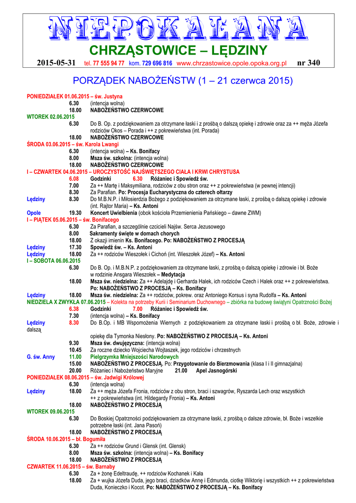 NIEPOKALANA CHRZĄSTOWICE – LĘDZINY 2015-05-31 tel. 77 555 94 77 kom. 729 696 816 www.chrzastowice.opole.opoka.org.pl nr 340 PORZĄDEK NABOŻEŃSTW (1 – 21 czerwca 2015) PONIEDZIAŁEK 01.06.2015 – św. Justyna 6.30 (intencja wolna) 18.00 NABOŻEŃSTWO CZERWCOWE WTOREK 02.06.2015 6.30 Do B. Op. z podziękowaniem za otrzymane łaski i z prośbą o dalszą opiekę i zdrowie oraz za ++ męża Józefa rodziców Okos – Porada i ++ z pokrewieństwa (int. Porada) 18.00 NABOŻEŃSTWO CZERWCOWE ŚRODA 03.06.2015 – św. Karola Lwangi 6.30 (intencja wolna) – Ks. Bonifacy 8.00 Msza św. szkolna: (intencja wolna) 18.00 NABOŻEŃSTWO CZERWCOWE I – CZWARTEK 04.06.2015 – UROCZYSTOŚĆ NAJŚWIĘTSZEGO CIAŁA I KRWI CHRYSTUSA 6.08 Godzinki 6.30 Różaniec i Spowiedź św. 7.00 Za ++ Martę i Maksymiliana, rodziców z obu stron oraz ++ z pokrewieństwa (w pewnej intencji) 8.30 Za Parafian. Po: Procesja Eucharystyczna do czterech ołtarzy Lędziny 8.30 Do M.B.N.P. i Miłosierdzia Bożego z podziękowaniem za otrzymane łaski, z prośbą o dalszą opiekę i zdrowie (int. Rajtor Maria) – Ks. Antoni Opole 19.30 Koncert Uwielbienia (obok kościoła Przemienienia Pańskiego – dawne ZWM) I – PIĄTEK 05.06.2015 – św. Bonifacego 6.30 Za Parafian, a szczególnie czcicieli Najśw. Serca Jezusowego 8.00 Sakramenty święte w domach chorych 18.00 Z okazji imienin Ks. Bonifacego. Po: NABOŻEŃSTWO Z PROCESJĄ Lędziny 17.30 Spowiedź św. – Ks. Antoni Lędziny 18.00 Za ++ rodziców Wieszołek i Cichoń (int. Wieszołek Józef) – Ks. Antoni I – SOBOTA 06.06.2015 6.30 Do B. Op. i M.B.N.P. z podziękowaniem za otrzymane łaski, z prośbą o dalszą opiekę i zdrowie i bł. Boże w rodzinie Ansgara Wieszołek – Medytacja 18.00 Msza św. niedzielna: Za ++ Adelajdę i Gerharda Halek, ich rodziców Czech i Halek oraz ++ z pokrewieństwa. Po: NABOŻEŃSTWO Z PROCESJĄ – Ks. Bonifacy Lędziny 18.00 Msza św. niedzielna: Za ++ rodziców, pokrew. oraz Antoniego Korsus i syna Rudolfa – Ks. Antoni NIEDZIELA X ZWYKŁA 07.06.2015 – Kolekta na potrzeby Kurii i Seminarium Duchownego – zbiórka na budowę świątyni Opatrzności Bożej 6.38 Godzinki 7.00 Różaniec i Spowiedź św. 7.30 (intencja wolna) – Ks. Bonifacy Lędziny 8.30 Do B.Op. i MB Wspomożenia Wiernych z podziękowaniem za otrzymane łaski i prośbą o bł. Boże, zdrowie i dalszą opiekę dla Tymonka Niesłony. Po: NABOŻEŃSTWO Z PROCESJĄ – Ks. Antoni 9.30 Msza św. dwujęzyczna: (intencja wolna) 10.45 Za roczne dziecko Wojciecha Wojtaszek, jego rodziców i chrzestnych G. św. Anny 11.00 Pielgrzymka Mniejszości Narodowych 15.00 NABOŻEŃSTWO Z PROCESJĄ. Po: Przygotowanie do Bierzmowania (klasa I i II gimnazjalna) 20.00 Różaniec i Nabożeństwo Maryjne 21.00 Apel Jasnogórski PONIEDZIAŁEK 08.06.2015 – św. Jadwigi Królowej 6.30 (intencja wolna) Lędziny 18.00 Za ++ męża Józefa Fronia, rodziców z obu stron, braci i szwagrów, Ryszarda Lech oraz wszystkich ++ z pokrewieństwa (int. Hildegardy Fronia) – Ks. Antoni 18.00 NABOŻEŃSTWO Z PROCESJĄ WTOREK 09.06.2015 6.30 Do Boskiej Opatrzności podziękowaniem za otrzymane łaski, z prośbą o dalsze zdrowie, bł. Boże i wszelkie potrzebne łaski (int. Jana Pasoń) 18.00 NABOŻEŃSTWO Z PROCESJĄ ŚRODA 10.06.2015 – bł. Bogumiła 6.30 Za ++ rodziców Grund i Glensk (int. Glensk) 8.00 Msza św. szkolna: (intencja wolna) – Ks. Bonifacy 18.00 NABOŻEŃSTWO Z PROCESJĄ CZWARTEK 11.06.2015 – św. Barnaby 6.30 Za + żonę Edeltraudę, ++ rodziców Kochanek i Kała 18.00 Za + wujka Józefa Duda, jego braci, dziadków Annę i Edmunda, ciotkę Wiktorię i wszystkich ++ z pokrewieństwa Duda, Konieczko i Kocot. Po: NABOŻEŃSTWO Z PROCESJĄ – Ks. Bonifacy PIĄTEK 12.06.2015 – Uroczystość Najświętszego Serca Pana Jezusa 6.30 Do B. Op. i M.B.N.P. o zdrowie i bł. Boże w rodzinie w intencji Krystyny Halupczok z okazji 60 rocznicy urodzin 18.00 (intencja wolna) – Ks. Bonifacy. NABOŻEŃSTWO CZERWCOWE SOBOTA 13.06.2015 – Wspomnienie Niepokalanego Serca NMP 6.30 Za ++ męża Józefa Loch, rodziców Loch i Krancioch oraz ++ z pokrewieństwa (int. Łucji Loch) – Ks. Krzysztof 11.00 Msza św. ślubna: W intencji Bartłomieja Szkoda i Marioli Gobel 13.00 Msza św. ślubna: W intencji Mirosława Grzesik i Justyny Joniec 18.00 Za + Piotra Panek. NABOŻEŃSTWO CZERWCOWE – Ks. Bonifacy Lędziny 18.00 Msza św. niedzielna: Za ++ rodziców Alberta i Marię Kiwus, siostrę Agnieszkę, matkę Annę Elis i brata Reinharda – Ks. Antoni NIEDZIELA XI ZWYKŁA 14.06.2015 – OFIARA DO PUSZEK NA OGRZEWANIE KOŚCIOŁA 6.38 Godzinki 7.00 Różaniec i Spowiedź św. 7.30 Za ++ rodziców Wocka i Bronder oraz ++ z pokrewieństwa (int. Bronder) Lędziny 8.30 Za ++ męża Leona, córkę Stefanię, rodziców z obu stron i szwagrów (int. Duda Elfryda). Po: NABOŻEŃSTWO – Ks. Antoni 9.30 Msza św. dwujęzyczna: Za ++ żonę Anielę Orlik oraz Matyldę Golomb, rodziców i ++ z pokrewieństwa (int. Ewalda Orlik) – Ks. Bonifacy 10.45 Za roczne dziecko Antoniego Bednorz, jego rodziców i chrzestnych 15.00 NABOŻEŃSTWO CZERWCOWE. Po: Przygotowanie do Bierzmowania (klasa I i II) PONIEDZIAŁEK 15.06.2015 – bł. Jolanty 6.30 Za + Ks. Prałata Ernesta Kubonia w II r. św. 18.00 Za ++ rodziców Palmer i Brol, ++ starzyków, synową Teresę oraz wnuka Henryka (int. Brol). Po: NABOŻEŃSTWO CZERWCOWE Lędziny 18.00 Za + Ks. Prałata Ernesta Kubonia w II r. św. – Ks. Antoni WTOREK 16.06.2015 6.30 Do B. Op. z podziękowaniem i z prośbą oraz za + matkę Marię Loch 18.00 NABOŻEŃSTWO CZERWCOWE ŚRODA 17.06.2015 – św. Brata Alberta Chmielowskiego 6.30 Za ++ męża Józefa Wyrwoł, rodziców Fikus i Wyrwoł, siostry i szwagrów oraz dusze w czyśćcu cierpiące 8.00 Msza św. szkolna: (intencja wolna) – Ks. Bonifacy 18.00 NABOŻEŃSTWO CZERWCOWE CZWARTEK 18.06.2015 6.30 Za ++ Franciszka Rożek, jego rodziców oraz Pawła, Ludwika, Gerharda Rożek i szwagra Manfreda (int. Rożek) 18.0