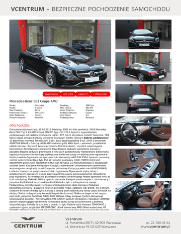 Mercedes-Benz S63 Coupe AMG Marka: Model: Rok Produkcji: Pojemność silnika : Kolor Nadwozia: Skrzynia biegów: Mercedes S Klasa 2016 5461 cm3 Czarny Automat Przebieg : Moc silnika : Kolor Wnętrza: Rodzaj nadwozia: Ilość drzwi: Rodzaj paliwa: 3083 km 585 KM Brązowy Coupe 2/3 Benzyna OPIS POJAZDU: Data pierwszej rejestracji: 15.02.2016 Przebieg: 3083 km Rok produkcji: 2016 MercedesBenz PKW Typ S 63 AMG Coupé 4MATIC Typ: 217.378.1 Pojazd z wyposażeniem podstawowym od zakładu producenta Lakier: 197 Czerń obsydianu metalik Tapicerka: 584 Skóra nappa designo Exklusiv w kolorze brązowym siodła/ czarnym Zakres podstawowy 10 głośników z funkcją FrontBass® 3-pkt. pasy bezpieczeństwa 8-cyl. silnik z wtryskiem ADAPTIVE BRAKE z funkcją HOLD AMG radiator grille AMG Sport - parametr. przekładnia układu kierown. Asystent świateł przednich Attention Assist - asystent wspomagania koncentracji Bezstopniowe otwieranie drzwi Boczne poduszki powietrzne kierowcy i pasażera Boczne poduszki powietrzne z tyłu Dach panoramiczny nieotwierany Elektryczna regulacja kolumny kierowniczej elektrycznie otwierane szyby x4 elektrycznie regulowane fotele przednie Ergonomiczne sportowe koło kierownicy AMG ESP ESP® dynamic cornering control system Gniazdko z tyłu 150 W Hamulec postojowy elektr. ISOFIX child seat attachment points with TopTether in the rear KEYLESS-GO Kierunkowskazy w obudowach lusterek zewn. Kieszenie Pompadour Kluczyk z elementami chromowanymi Komfortowe wspomaganie zamykania drzwi Komputer pokładowy Kurtyny powietrzne (WINDOWBAG) Lusterka zewnętrzne podgrzewane i elek. regulowane Ogrzewanie szyby tylnej z przełącznikiem czasowym Osłona przeciwwietrzna osłony przeciwsłoneczne Oświetlenie przy wysiadaniu Parametryczna przekładnia układu kierowniczego Pedały sportowe AMG ze stali szlachetnej Plakietki AMG w oparciu siedzenia Podajnik pasów bezpiecz. dla kierowcy i pasażera Podłokietnik ze schowkiem Podłokietnik z tyłu z uchwytami na napoje Podświetlany, klimatyzowany schowek przed pasażerem obok kierowcy Poduksza powietrzna kierowcy i pasażera Rear sill protector Regul. zagłówki (x5) przód i tył-3 pneum. składane Schowek między tylną kanapą a osłoną przeciwsłoneczną tylnej szyby Schowek na okulary Siatka na bagaż przy krawędzi bagażnika (czarna) Siatka na bagaż w kol. wypos. pod siedz. pasażera Sportowe fotele AMG Stalowe listwy progowe System aktywnego serwisowania pojazdu - Assyst System PRE-SAFE® System sterowania i nawigacji COMAND System wspomagający gwałtowne hamowanie (BAS) Szyby przyciemniane z powłoką antyrefleksyjną Światła do czytania z przodu i z tyłu Światła tylne diodowe TEMPOMAT z systemem ogran. prędkości SPEEDTRONIC Układ hamulcowy AMG Układ wydechowy V8 BITURBO lettering on the front wings Wskaźnik zużycia klocków hamulcowych Wycieraczki przedniej szyby ster. czujn. deszczu Wycieraczki wyprofilowane aerodynamicznie Zawieszenie sportowe AMG Zdalne otwieranie klapy bagażnika Zdalne zamykanie pokrywy bagażnika Zestaw wskaźników AMG Wyposażenie opcjonalne 05U Remote online 06U Moduł Mercedes-Benz connect me 249 Lusterka fotochromatyczne 275 Fotel kierowcy regulowany elektrycznie z pamięcią ustawień 310 Podwójny uchwyt na napoje 314 Wielofunkcyjna kierownica sportowa wykończona skórą i drewnem 350 Telefon bezpieczeństwa Mercedes-Benz 398 Dach panoramiczny z MAGIC SKY CONTROL 401 Podgrzewane i wentylowane fotele przednie 427 7G-TRONIC PLUS - 7-biegowa, automatyczna skrzynia biegów 432 Dynamiczny wielokontur. fotel kierowcy i pasażera 448 Interfejs sterowany dotykowo (Touchpad) 463 Wyświetlacz na przedniej szybie Head-upDisplay (HUD) 475 System monitorowania ciśnienia w oponach 531 COMAND Online 540 Elektrycznie sterowana roleta tylnej szyby 581 THERMOTRONIC - klimatyzacja automatyczna 5U5 Reflektory w technologii LED Intelligent Light System z kryształami firmy Swarovski’ego 610 NIGHT VIEW - system poprawiający widoczność nocą 61U Podsufitka DINAMICA - czarna 682 Montaż gaśnicy 753 Obręcze kute AMG 50,8 cm (20\") z 5 podwójnymi ramionami 772 Stylizacja AMG 776 Poszerzony rozstaw kół dla AMG 810 System nagłaśniający Burmester® Surround 814 Zmieniarka DVD na 6 płyt 865 Tuner telewizji cyfrowej 867 SPLITVIEW 877 Oświetlenie AMBIENTE 902 Ogrzewanie komfortowe foteli Plus po stronie kierowcy i pasażera 927 Norma czystości spalin EU6 B03 Funkcja start/stop B51 Tirefit - zestaw naprawczy uszkodzonej opony B54 Live Traffic Information D0A Gaśnica D0C Dokumentacja Mercedes-Benz D0D Transport do dealera H21 Lakier fortepianowy czarny designo K11 Adaptacyjne światła hamowania (migające) P17 Pakiet KEYLESS-GO 871 Hands free access – bezdotykowe otwieranie klapy bagażnika 889 KEYLESS-GO P20 System wspomagania bezpieczeństwa jazdy Plus 233 DICTRONIC PLUS 235 PARKTRONIC z aktywnym asystentem parkowania 237 Aktywny asystent \"martwego punktu\" 238 Aktywny asystent utrzymania pasa ruchu 253 System ostrzegający przed uderzeniami z tyłu 266 DISTRONIC Plus z asystentem rozpoznającym ruch na skrzyżowaniu 268 BAS PLUS - asystent hamowania 269 Asystent wspomagania nagłego hamowania BAS PLUS 271 Hamulec PRE-SAFE® PLUS z funkcją łagodzenia skutków kolizji 300 Hamulec PRESAFE® 501 Kamera 360 U10 Automatyczna deaktywacja przeniej poduszki powietrznej pasażera P21 Pakiet AIR-BALANCE P34 Pakiet Exclusive U25 Listwy progowe AMG z napisem »AMG«, podświetlane P35 Pakiet oświetleniowy 628 INTELLIGENT HEADLAMP CONTROL PLUS (IHC+) 642 ILS - Dynamiczne reflektory w technologii LED P54 Pakiet zabezpieczenia pojazdu 551 Alarm antywłamaniowy (EDW) 882 Zabezpieczenie wnętrza pojazdu R01 Opony letnie U26 Dywaniki AMG U60 Ochrona pieszych U70 Zaciski hamulcowe lakierowane na czerwono Dodatkowe Wyposażenie ✓20-calowe felgi aluminiowe ✓Automatycznie przyciemniane wewnętrzne lusterko wsteczne ✓Elektryczne domykanie drzwi ✓Elektrycznie otwierana klapa bagażnika ✓Elektrycznie sterowany f