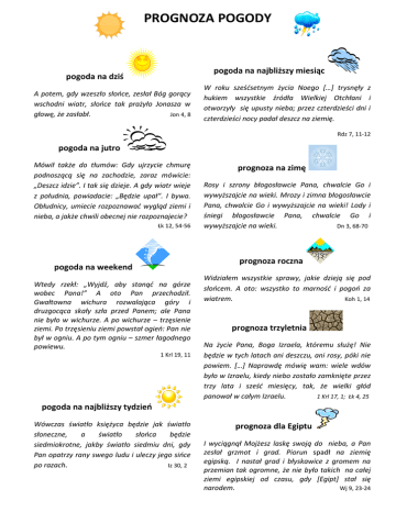 PROGNOZA POGODY pogoda na najbliższy miesiąc pogoda na dziś A potem, gdy wzeszło słońce, zesłał Bóg gorący wschodni wiatr, słońce tak prażyło Jonasza w głowę, że zasłabł. Jon 4, 8 W roku sześćsetnym życia Noego […] trysnęły z hukiem wszystkie źródła Wielkiej Otchłani i otworzyły się upusty nieba; przez czterdzieści dni i czterdzieści nocy padał deszcz na ziemię. Rdz 7, 11-12 pogoda na jutro Mówił także do tłumów: Gdy ujrzycie chmurę podnoszącą się na zachodzie, zaraz mówicie: „Deszcz idzie”. I tak się dzieje. A gdy wiatr wieje z południa, powiadacie: „Będzie upał”. I bywa. Obłudnicy, umiecie rozpoznawać wygląd ziemi i nieba, a jakże chwili obecnej nie rozpoznajecie? Łk 12, 54-56 prognoza na zimę Rosy i szrony błogosławcie Pana, chwalcie Go i wywyższajcie na wieki. Mrozy i zimna błogosławcie Pana, chwalcie Go i wywyższajcie na wieki! Lody i śniegi błogosławcie Pana, chwalcie Go i wywyższajcie na wieki. Dn 3, 68-70 prognoza roczna pogoda na weekend Wtedy rzekł: „Wyjdź, aby stanąć na górze wobec Pana!” A oto Pan przechodził. Gwałtowna wichura rozwalająca góry i druzgocąca skały szła przed Panem; ale Pana nie było w wichurze. A po wichurze – trzęsienie ziemi. Po trzęsieniu ziemi powstał ogień: Pan nie był w ogniu. A po tym ogniu – szmer łagodnego powiewu. 1 Krl 19, 11 Widziałem wszystkie sprawy, jakie dzieją się pod słońcem. A oto: wszystko to marność i pogoń za wiatrem. Koh 1, 14 prognoza trzyletnia Na życie Pana, Boga Izraela, któremu służę! Nie będzie w tych latach ani deszczu, ani rosy, póki nie powiem. […] Naprawdę mówię wam: wiele wdów było w Izraelu, kiedy niebo zostało zamknięte przez trzy lata i sześć miesięcy, tak, że wielki głód panował w całym Izraelu. 1 Krl 17, 1; Łk 4, 25 pogoda na najbliższy tydzień Wówczas światło księżyca będzie jak światło słoneczne, a światło słońca będzie siedmiokrotne, jakby światło siedmiu dni, gdy Pan opatrzy rany swego ludu i uleczy jego sińce po razach. Iz 30, 2 prognoza dla Egiptu I wyciągnął Mojżesz laskę swoją do nieba, a Pan zesłał grzmot i grad. Piorun spadł na ziemię egipską. I nastał grad i błyskawice z gromem na przemian tak ogromne, że nie było takich na całej ziemi egipskiej od czasu, gdy [Egipt] stał się narodem. Wj 9, 23-24 s.a.a.c.r®
