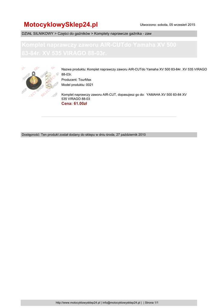 MotocyklowySklep24.pl Utworzono: sobota, 05 wrzesień 2015 DZIAŁ SILNIKOWY > Części do gaźników > Komplety naprawcze gaźnika - zaw Komplet naprawczy zaworu AIR-CUTdo Yamaha XV 500 83-84r. XV 535 VIRAGO 88-03r. Nazwa produktu: Komplet naprawczy zaworu AIR-CUTdo Yamaha XV 500 83-84r. XV 535 VIRAGO 88-03r. Producent: TourMax Model produktu: 0021 Komplet naprawczy zaworu AIR-CUT, dopasujesz go do: YAMAHA XV 500 83-84 XV 535 VIRAGO 88-03 Cena: 61.00zł Dostępność: Ten produkt został dodany do sklepu w dniu środa, 27 październik 2010 http://www.motocyklowysklep24.pl | [email protected] | | Strona 1/1