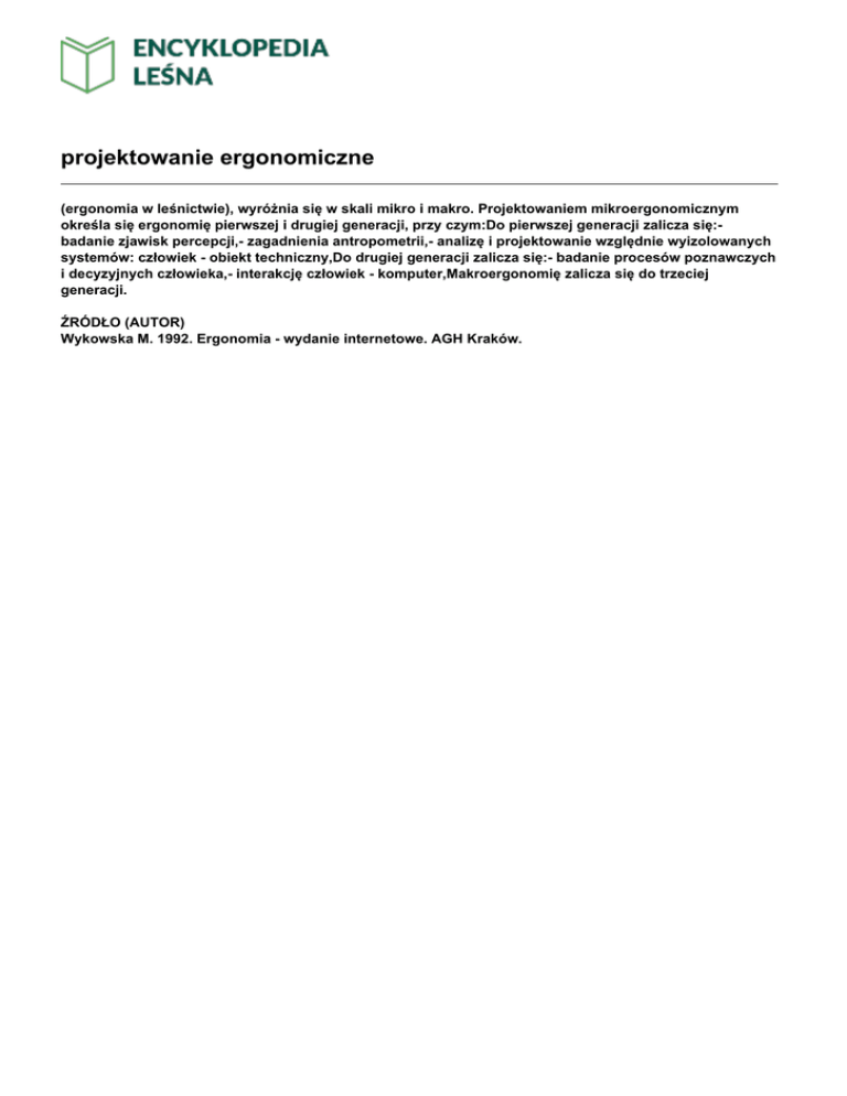 projektowanie ergonomiczne (ergonomia w leśnictwie), wyróżnia się w skali mikro i makro. Projektowaniem mikroergonomicznym określa się ergonomię pierwszej i drugiej generacji, przy czym:Do pierwszej generacji zalicza się:badanie zjawisk percepcji,- zagadnienia antropometrii,- analizę i projektowanie względnie wyizolowanych systemów: człowiek - obiekt techniczny,Do drugiej generacji zalicza się:- badanie procesów poznawczych i decyzyjnych człowieka,- interakcję człowiek - komputer,Makroergonomię zalicza się do trzeciej generacji. ŹRÓDŁO (AUTOR) Wykowska M. 1992. Ergonomia - wydanie internetowe. AGH Kraków.
