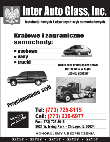 Inter Auto Glass, Inc. Instalacja nowych i u¿ywanych szyb samochodowych Krajowe i zagraniczne samochody: + osobowe + vany + trucki Niskie ceny profesjonalny serwis INSTALACJA W CI¥GU JEDNEJ GODZINY e i n ia b y z s n m ie c y z Pr imy u w Mó polsk po Tel: (773) 725-8115 Cell: (773) 230-6977 Fax: (773) 725-8016 5621 W. Irving Park • Chicago, IL 60634 HONORUJEMY UBEZPIECZENIA SZYBY • SZYBY • SZYBY • SZYBY • SZYBY
