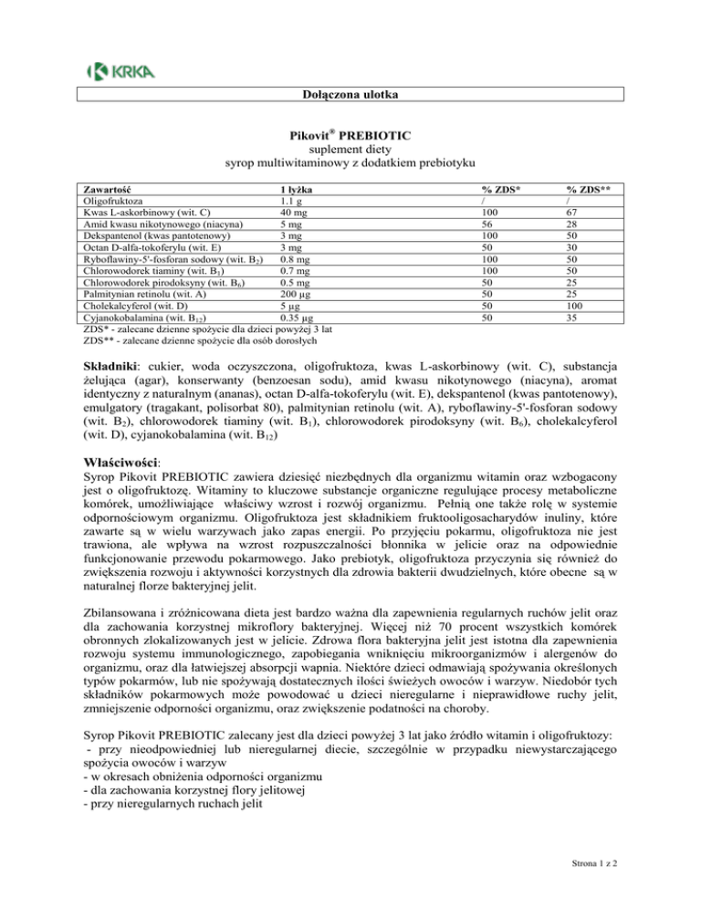 Dołączona ulotka Pikovit® PREBIOTIC suplement diety syrop multiwitaminowy z dodatkiem prebiotyku Zawartość 1 łyżka Oligofruktoza 1.1 g Kwas L-askorbinowy (wit. C) 40 mg Amid kwasu nikotynowego (niacyna) 5 mg Dekspantenol (kwas pantotenowy) 3 mg Octan D-alfa-tokoferylu (wit. E) 3 mg Ryboflawiny-5'-fosforan sodowy (wit. B2) 0.8 mg Chlorowodorek tiaminy (wit. B1) 0.7 mg Chlorowodorek pirodoksyny (wit. B6) 0.5 mg Palmitynian retinolu (wit. A) 200 µg Cholekalcyferol (wit. D) 5 µg Cyjanokobalamina (wit. B12) 0.35 µg ZDS* - zalecane dzienne spożycie dla dzieci powyżej 3 lat ZDS** - zalecane dzienne spożycie dla osób dorosłych % ZDS* / 100 56 100 50 100 100 50 50 50 50 % ZDS** / 67 28 50 30 50 50 25 25 100 35 Składniki: cukier, woda oczyszczona, oligofruktoza, kwas L-askorbinowy (wit. C), substancja żelująca (agar), konserwanty (benzoesan sodu), amid kwasu nikotynowego (niacyna), aromat identyczny z naturalnym (ananas), octan D-alfa-tokoferylu (wit. E), dekspantenol (kwas pantotenowy), emulgatory (tragakant, polisorbat 80), palmitynian retinolu (wit. A), ryboflawiny-5'-fosforan sodowy (wit. B2), chlorowodorek tiaminy (wit. B1), chlorowodorek pirodoksyny (wit. B6), cholekalcyferol (wit. D), cyjanokobalamina (wit. B12) Właściwości: Syrop Pikovit PREBIOTIC zawiera dziesięć niezbędnych dla organizmu witamin oraz wzbogacony jest o oligofruktozę. Witaminy to kluczowe substancje organiczne regulujące procesy metaboliczne komórek, umożliwiające właściwy wzrost i rozwój organizmu. Pełnią one także rolę w systemie odpornościowym organizmu. Oligofruktoza jest składnikiem fruktooligosacharydów inuliny, które zawarte są w wielu warzywach jako zapas energii. Po przyjęciu pokarmu, oligofruktoza nie jest trawiona, ale wpływa na wzrost rozpuszczalności błonnika w jelicie oraz na odpowiednie funkcjonowanie przewodu pokarmowego. Jako prebiotyk, oligofruktoza przyczynia się również do zwiększenia rozwoju i aktywności korzystnych dla zdrowia bakterii dwudzielnych, które obecne są w naturalnej florze bakteryjnej jelit. Zbilansowana i zróżnicowana dieta jest bardzo ważna dla zapewnienia regularnych ruchów jelit oraz dla zachowania korzystnej mikroflory bakteryjnej. Więcej niż 70 procent wszystkich komórek obronnych zlokalizowanych jest w jelicie. Zdrowa flora bakteryjna jelit jest istotna dla zapewnienia rozwoju systemu immunologicznego, zapobiegania wniknięciu mikroorganizmów i alergenów do organizmu, oraz dla łatwiejszej absorpcji wapnia. Niektóre dzieci odmawiają spożywania określonych typów pokarmów, lub nie spożywają dostatecznych ilości świeżych owoców i warzyw. Niedobór tych składników pokarmowych może powodować u dzieci nieregularne i nieprawidłowe ruchy jelit, zmniejszenie odporności organizmu, oraz zwiększenie podatności na choroby. Syrop Pikovit PREBIOTIC zalecany jest dla dzieci powyżej 3 lat jako źródło witamin i oligofruktozy: - przy nieodpowiedniej lub nieregularnej diecie, szczególnie w przypadku niewystarczającego spożycia owoców i warzyw - w okresach obniżenia odporności organizmu - dla zachowania korzystnej flory jelitowej - przy nieregularnych ruchach jelit Strona 1 z 2 Sposób użycia: Dzieci powyżej 3 lat powinny zażywać 1 pełną łyżeczkę dozującą syropu dziennie, najlepiej rano po posiłku. Opakowanie: Pudełko z 150 ml syropu w butelce oraz łyżeczka dozująca. Przechowywać w temperaturze poniżej 25°C. Przechowywać w oryginalnym opakowaniu w celu ochrony przed światłem. Trzymać poza zasięgiem małych dzieci. Butelkę wstrząsnąć przed użyciem. Natychmiast po użyciu zamknąć szczelnie butelkę. Syrop może być stosowany 2 miesiące po pierwszym otwarciu. Syrop nie jest substytutem zbilansowanej i zróżnicowanej diety. Nie przekraczać zalecanej porcji dziennej. Producent: KRKA, d.d., Novo mesto Šmarješka cesta 6 8501 Novo mesto Słowenia www.krka.si Importer i dystrybutor: KRKA-POLSKA Sp. z o.o. ul. Równoległa 5 02-235 Warszawa Strona 2 z 2