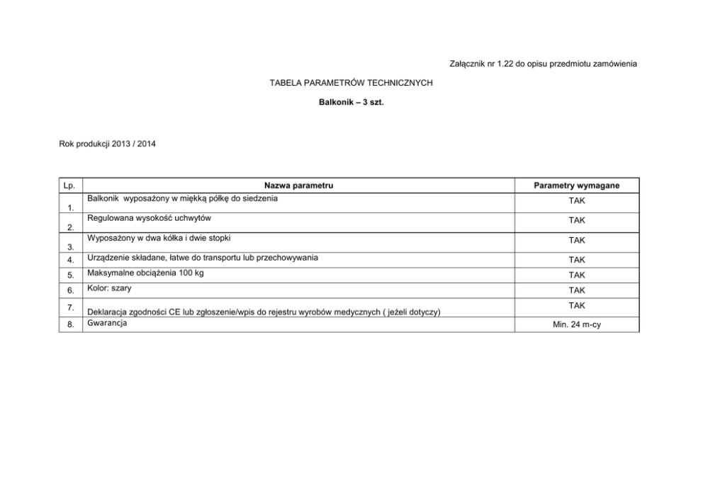 Załącznik nr 1.22 do opisu przedmiotu zamówienia TABELA PARAMETRÓW TECHNICZNYCH Balkonik – 3 szt. Rok produkcji 2013 / 2014 Nazwa parametru Lp. Parametry wymagane Balkonik wyposażony w miękką półkę do siedzenia TAK Regulowana wysokość uchwytów TAK Wyposażony w dwa kółka i dwie stopki TAK 4. Urządzenie składane, łatwe do transportu lub przechowywania TAK 5. Maksymalne obciążenia 100 kg TAK 6. Kolor: szary TAK 7. Deklaracja zgodności CE lub zgłoszenie/wpis do rejestru wyrobów medycznych ( jeżeli dotyczy) 8. Gwarancja 1. 2. 3. TAK Min. 24 m-cy Załącznik nr 1.23 opis przedmiotu zamówienia TABELA PARAMETRÓW TECHNICZNYCH Biurko – 1 szt. Rok produkcji 2013 / 2014 Nazwa parametru Lp. Parametry wymagane Wykonane z płyty wiórowej laminowanej TAK Wyposażone w szuflady na prowadnicach rolkowych TAK Możliwość ustawienia biurka przy ścianie TAK Wymiary w mm: wys. 75x szer. 123 x gł.60 TAK 5. Deklaracja zgodności CE lub zgłoszenie/wpis do rejestru wyrobów medycznych ( jeżeli dotyczy) TAK 6. Gwarancja 1. 2. 3. 4. Min. 24 m-cy Załącznik nr 1.24 opis przedmiotu zamówienia TABELA PARAMETRÓW TECHNICZNYCH Fotel biurowy - 1 szt. Rok produkcji 2013 / 2014 Nazwa parametru Lp. Fotel na metalowym chromowanym stelażu TAK Siedzisko i oparcie z tworzywa sztucznego, łatwe do utrzymania w czystości TAK Miękkie podłokietniki z poliuretanu TAK Posadowiony na kółkach z możliwością regulacji wysokości siedziska TAK Certyfikat CE dopuszczający do obrotu na terenie RP TAK 1. 2. 3. 4. 5. 6. Parametry wymagane Gwarancja Min. 24 m-cy Załącznik nr 1.25 opis przedmiotu zamówienia ZESTAWIENIE WYMAGANYCH PARAMETRÓW TECHNICZNYCH I UŻYTKOWYCH Stół zabiegowy czterosegmentowy szt. 1 Rok produkcji 2013 / 2014 PARAMETR Lp. WARUNEK KONIECZNY 1. Stół zabiegowy przeznaczony do przeprowadzania zabiegów ogólnych i specjalistycznych TAK Stół posiadający konstrukcję wykonaną z kształtowników metalowych lakierowanych proszkowo. TAK Segmenty blatu stołu pokryte materacami poliuretanowymi antystatycznymi z możliwością odejmowania o grubości min. 50 mm TAK Stół zabiegowy z leżem czterosegmentowym: - segment podgłówka - segment oparcia pleców - segment siedziska - segment nóg dodatkowo dzielony wzdłużnie z możliwością rozchylania obu podnóżków na boki TAK Stół z blatem umożliwiającym różnorodne ułożenie pacjenta tj. w pozycji siedzącej, leżącej i półleżącej TAK Regulacje: - wysokość blatu regulowana pompą hydrauliczną sterowaną nożnie – dostęp z obu stron stołu - segment podgłówka, segment oparcia pleców, segment nóg regulowane za pomocą sprężyn gazowych z blokadą - regulacja przechyłów wzdłużnych tj. pozycji Trendelenburga oraz anty-Trendelenburga uzyskiwana za pomocą sprężyn gazowych z blokadą TAK 2. 3. 4. 5. 6. PARAMETR Lp. 7. 8. 9. 10. 11. WARUNEK KONIECZNY Parametry techniczne: - długość całkowita blatu 2000 – 2100 mm - całkowita szerokość blatu 500 – 550 mm - regulacja wysokości blatu w zakresie min. od 850 mm do 1050 mm - regulacja kąta oparcia pleców min. od -30 do +70 stopni - regulacja podgłówka min. od -30 do +40 stopni - regulacja podnóżków min. od -90 do +10 stopni (w pionie) - regulacja odchylenia podnóżków min. od 0 do 180 stopni (w poziomie) - regulacja Trendelenburga min. 20 stopni - regulacja anty-Trendelenburga min. 10 stopni - dopuszczalne obciążenie min. 150 kg TAK Konstrukcja leża stołu umożliwiająca wykonywanie zdjęć RTG pod wszystkimi segmentami blatu TAK Podstawa mobilna posiadająca centralny układ blokowania 4 podwójnych kół oraz funkcję jazdy kierunkowej TAK Wyposażenie: - podpórka ręki - wieszak kroplówki TAK Blat stołu po bokach wyposażony w szyny montażowe/akcesoryjne wykonane ze stali nierdzewnej TAK Deklaracja zgodności CE lub zgłoszenie/wpis do rejestru wyrobów medycznych ( jeżeli dotyczy) TAK 12. 13. Gwarancja Min. 24 m-cy Załącznik nr 1.26 opis przedmiotu zamówienia ZESTAWIENIE PARAMETRÓW I WARUNKÓW WYMAGANYCH kozetka lekarska składana –szt. 1 Rok produkcji 2013 / 2014 Opis Parametry wymagane Lp. 1. Kozetka lekarska : fabrycznie nowa rok prod. min. 2013 TAK 2. Całkowita długość : 1850 mm +/- 50 mm TAK 3 Całkowita szerokość : 600 mm +/- 50 mm TAK 4 Wysokość : 550mm +/- 50 mm TAK 5 Kąt uniesienia podgłówka : -30° do +30° TAK 6 Podstawa kozetki wykonana z kształtowników stalowych pokrytych lakierem proszkowym , leże tapicerowane gąbką i skajem / kolor leża do wyboru przez zamawiającego/ leże tapicerowane bezszwowo TAK 7 Uchwyt na rolkę podkładu papierowego prześcieradła jednorazowego umieszczony pod segmentem leża. TAK 9 Instrukcja obsługi w języku polskim TAK 10. Deklaracja zgodności CE lub zgłoszenie/wpis do rejestru wyrobów medycznych ( jeżeli dotyczy) TAK 11. Gwarancja Min. 24 m-cy Załącznik nr 1.27 opis przedmiotu zamówienia TABELA PARAMETRÓW TECHNICZNYCH Krzesło szpitalne – 36 szt. Rok produkcji 2013 / 2014 Nazwa parametru Lp. Parametry wymagane Krzesło na metalowym chromowanym stelażu TAK Siedzisko i oparcie z tworzywa sztucznego, łatwe do utrzymania w czystości TAK Możliwość składowania krzeseł jedno na drugim TAK 4. Deklaracja zgodności CE lub zgłoszenie/wpis do rejestru wyrobów medycznych ( jeżeli dotyczy) TAK 5. Gwarancja 1. 2. 3. Min. 24 m-cy Załącznik nr 1.28 opis przedmiotu zamówienia ZESTAWIENIE PARAMETRÓW I WARUNKÓW WYMAGANYCH Łóżko szpitalne z napędem elektrycznym 4 szt. Rok prod. 2013 / 2014 Lp. Parametry i funkcje wymagane Potwierdzenie spełnienia parametrów TAK 1. Łóżko szpitalne wraz z poręczami bocznymi spełniające normę PN EN 60601-2-52 2. TAK 4. Łóżko szpitalne, 4 segmentowe. Regulacje wysokości, przechyłów wzdłużnych, segmentów oparcia pleców, ud realizowane przy pomocy siłowników elektrycznych sterowanych pilotem Konstrukcja łóżka wykonana z prostokątnych profili stalowych. Konstrukcja podwozia połączona z leżem