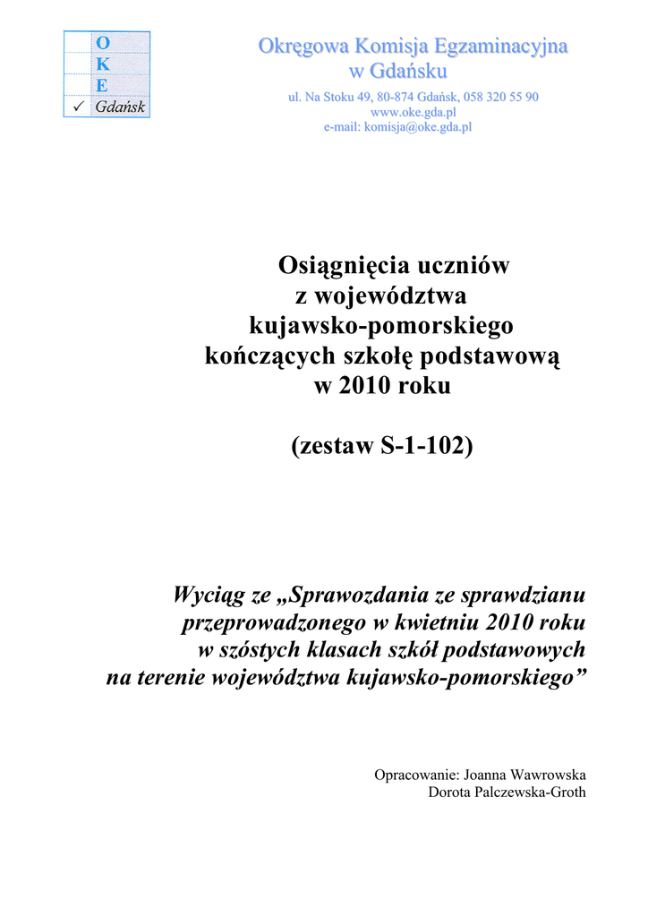 Okręgowa Komisja Egzaminacyjna w Gdańsku ul. Na Stoku 49, 80-874 Gdańsk, 058 320 55 90 www.oke.gda.pl e-mail: [email protected] Osiągnięcia uczniów z województwa kujawsko-pomorskiego kończących szkołę podstawową w 2010 roku (zestaw S-1-102) Wyciąg ze „Sprawozdania ze sprawdzianu przeprowadzonego w kwietniu 2010 roku w szóstych klasach szkół podstawowych na terenie województwa kujawsko-pomorskiego” Opracowanie: Joanna Wawrowska Dorota Palczewska-Groth Osiągnięcia uczniów z województwa kujawsko-pomorskiego kończących szkołę podstawową w kwietniu 2010 roku (zestaw S-1-102) Opis zestawu zadań Zestaw zadań w wersji standardowej S-1-102 rozwiązywali uczniowie bez dysfunkcji i z dysleksją rozwojową. Zestaw składał się z 20 zadań zamkniętych oraz 5 otwartych. Za poprawne wykonanie wszystkich zadań uczeń mógł otrzymać 40 punktów – po 20 za zadania zamknięte i otwarte. Sprawdzono umiejętności szóstoklasistów w zakresie pięciu obszarów standardów wymagań: czytania, pisania, rozumowania, korzystania z informacji i wykorzystywania wiedzy w praktyce. Udział punktów możliwych do uzyskania za każdy z tych obszarów przedstawia tabela. Nr obszaru standardu Obszar standardu wymagań Liczba punktów Waga Numery zadań (kryteriów) I Czytanie 10 25% 1, 2, 3, 4, 6, 7, 10, 11, 12, 13 II Pisanie 10 25% 25 (I-V) III Rozumowanie 8 20% 9, 14, 16, 17, 24 (I, II) IV Korzystanie z informacji 4 10% 5, 18, 19, 20 V Wykorzystywanie wiedzy w praktyce 8 20% 8, 15, 21 (I, II), 22 (I, II), 23 (I, II) 40 100% Razem Umiejętności z obszaru czytanie sprawdzono dziesięcioma zadaniami zamkniętymi. Badano czytanie dwóch tekstów literackich: prozatorskiego i poetyckiego oraz tekstu popularnonaukowego. Umiejętności z obszaru pisanie sprawdzono jednym zadaniem otwartym. Uczeń musiał zredagować dłuższą wypowiedź na podany temat, przestrzegając poprawności językowej, ortograficznej i interpunkcyjnej. Umiejętności z obszaru rozumowanie sprawdzono czterema zadaniami zamkniętymi i jednym zadaniem otwartym. Badały one między innymi umiejętności rozpoznawania charakterystycznych cech liczb i figur oraz ustalania sposobu rozwiązania zadania. Umiejętności z obszaru korzystanie z informacji sprawdzono czterema zadaniami zamkniętymi. Badano nimi, czy uczeń umie posługiwać się źródłem informacji. Umiejętności z obszaru wykorzystywanie wiedzy w praktyce sprawdzono dwoma zadaniami zamkniętymi i trzema zadaniami otwartymi. Uczniowie musieli się wykazać umiejętnością wykorzystywania obliczeń dotyczących długości i powierzchni, a także wykorzystania własności liczb w sytuacji praktycznej. Ogólne wyniki zdających Zadania z zestawu standardowego w województwie kujawsko-pomorskim rozwiązywało 21 498 uczniów, a w kraju 383 628 szóstoklasistów. Statystyczny uczeń z województwa uzyskał wynik 24,07 punktu, co stanowi 60% maksymalnej liczby punktów możliwych do uzyskania. Najniższy spośród wyników (0 punktów) uzyskał jeden uczeń, a najwyższy (40 punktów) uzyskało 157 uczniów (0,7%), w tym 135 było laureatami konkursów przedmiotowych o zasięgu wojewódzkim lub ponadwojewódzkim. Wynik najczęściej występujący – 30 punktów uzyskało 966 uczniów (4,5%). Wyniki około 70% uczniów mieszczą się w przedziale od 15 do 33 punktów. Na wykresie przedstawiono rozkład wyników zdających w województwie kujawsko-pomorskim. 2 Okręgowa Komisja Egzaminacyjna w Gdańsku procent zdających Osiągnięcia uczniów z województwa kujawsko-pomorskiego kończących szkołę podstawową w kwietniu 2010 roku (zestaw S-1-102) 5% 4% 3% 2% 1% 0% 0 2 4 6 8 10 12 14 16 18 20 22 24 26 28 30 32 34 36 38 40 liczba punktów W tegorocznej populacji szóstoklasistów wyróżniono trzy strefy osiągnięć uczniów: – do 17 punktów (staniny 1.-3.) – strefa wyników niskich – od 18 do 31 punktów (staniny 4.-6.) – strefa wyników średnich – od 32 punktów (staniny 7.-9.) – strefa wyników wysokich. W tabeli przedstawiono przedziały punktowe wyników zdających na skali staninowej wyznaczone w Centralnej Komisji Egzaminacyjnej dla sprawdzianu przeprowadzonego w kwietniu 2010 roku. Numer stanina Przedział punktowy 1 2 3 4 5 6 7 8 9 0-9 10-13 14-17 18-22 23-27 28-31 32-34 35-37 38-40 Szóstoklasiści z województwa kujawsko-pomorskiego, którzy osiągnęli ze sprawdzianu wyniki niskie, uzyskali średnio 30,2% punktów możliwych do zdobycia. Szóstoklasiści, którzy osiągnęli wyniki średnie, uzyskali średnio 61% punktów. Szóstoklasiści, którzy osiągnęli wyniki wysokie, uzyskali średnio 85,5% punktów. W strefie wyników niskich znalazło się 23,9% uczniów z województwa kujawsko-pomorskiego, a w strefie wyników wysokich – 21,2% uczniów. Wyniki zdających w obszarach standardów wymagań W tabeli oraz na wykresie podano zróżnicowanie wartości wybranych wskaźników statystycznych wyników uczniów w obszarach standardów wymagań egzaminacyjnych. Wyniki wyrażone w procentach zostały obliczone na potrzeby niniejszego opracowania na podstawie wyników punktowych podanych z dokładnością większą niż jedno miejsce po przecinku. Woj. kujawsko-pomorskie Wskaźnik statystyczny Wynik średni w punktach * Kraj * Wartość wskaźnika w obszarze I II III IV V I II III IV V 7,3 5,2 5,1 2,3 4,1 7,4 5,3 5,2 2,4 4,3 obszary umiejętności szóstoklasistów: I – czytanie (0-10 pkt), II – pisanie (0-10 pkt), III – rozumowanie (0-8 pkt), IV – korzystanie z informacji (0-4 pkt), V – wykorzystywanie wiedzy w praktyce (0-8 pkt) Okręgowa Komisja Egzaminacyjna w Gdańsku 3 II IV 53% 52% 59% III 59% 65% 53% 52% I 64% 74% 100% 90% 80% 70% 60% 50% 40% 30% 20% 10% 0% 73% procent uzyskanych punktów Osiągnięcia uczniów z województwa kujawsko-pomorskiego kończących szkołę podstawową w kwietniu 2010 roku (zestaw S-1-102) V numer obszaru woj. kujawsko-pomorskie kraj Najlepiej zostały opanowane przez uczniów umiejęt
