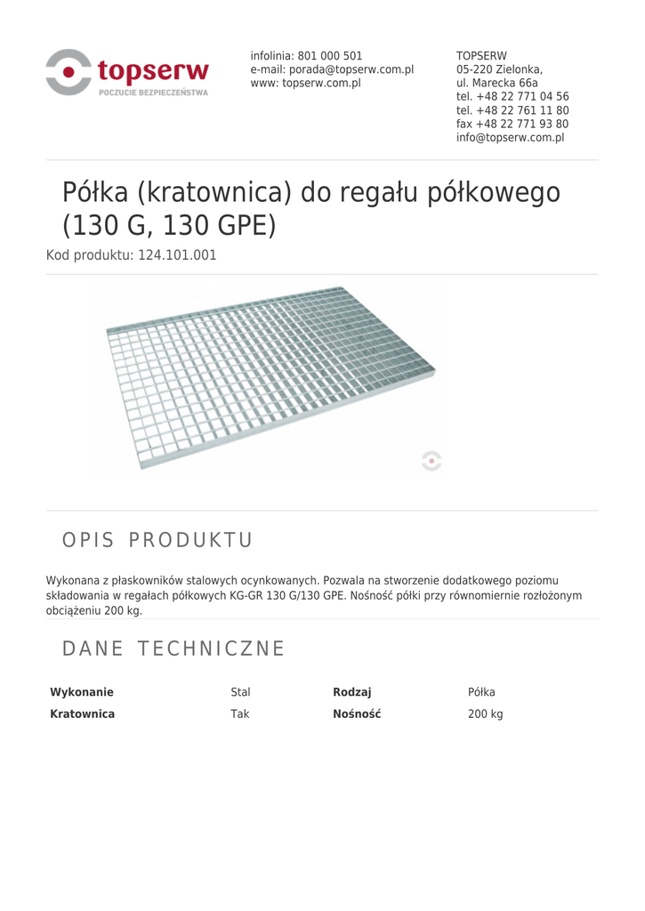infolinia: 801 000 501 e-mail: [email protected] www: topserw.com.pl TOPSERW 05-220 Zielonka, ul. Marecka 66a tel. +48 22 771 04 56 tel. +48 22 761 11 80 fax +48 22 771 93 80 [email protected] Półka (kratownica) do regału półkowego (130 G, 130 GPE) Kod produktu: 124.101.001 OPIS PRODUKTU Wykonana z płaskowników stalowych ocynkowanych. Pozwala na stworzenie dodatkowego poziomu składowania w regałach półkowych KG-GR 130 G/130 GPE. Nośność półki przy równomiernie rozłożonym obciążeniu 200 kg. DANE TECHNICZNE Wykonanie Stal Rodzaj Półka Kratownica Tak Nośność 200 kg