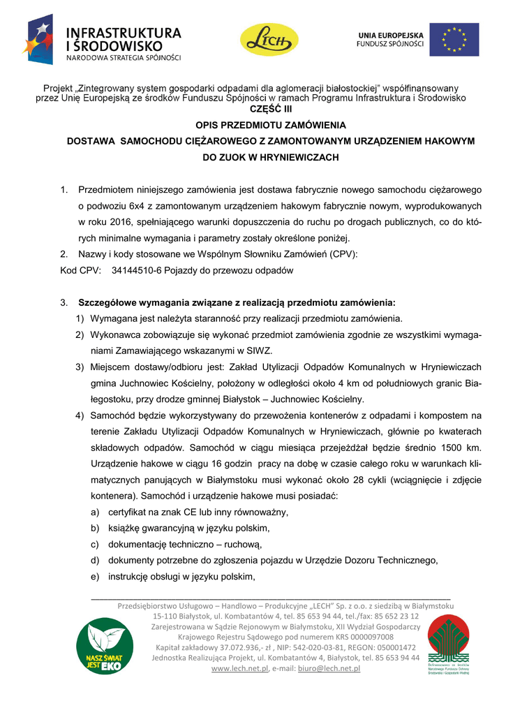 CZĘŚĆ III OPIS PRZEDMIOTU ZAMÓWIENIA DOSTAWA SAMOCHODU CIĘŻAROWEGO Z ZAMONTOWANYM URZĄDZENIEM HAKOWYM DO ZUOK W HRYNIEWICZACH 1. Przedmiotem niniejszego zamówienia jest dostawa fabrycznie nowego samochodu ciężarowego o podwoziu 6x4 z zamontowanym urządzeniem hakowym fabrycznie nowym, wyprodukowanych w roku 2016, spełniającego warunki dopuszczenia do ruchu po drogach publicznych, co do których minimalne wymagania i parametry zostały określone poniżej. 2. Nazwy i kody stosowane we Wspólnym Słowniku Zamówień (CPV): Kod CPV: 3. 34144510-6 Pojazdy do przewozu odpadów Szczegółowe wymagania związane z realizacją przedmiotu zamówienia: 1) Wymagana jest należyta staranność przy realizacji przedmiotu zamówienia. 2) Wykonawca zobowiązuje się wykonać przedmiot zamówienia zgodnie ze wszystkimi wymaganiami Zamawiającego wskazanymi w SIWZ. 3) Miejscem dostawy/odbioru jest: Zakład Utylizacji Odpadów Komunalnych w Hryniewiczach gmina Juchnowiec Kościelny, położony w odległości około 4 km od południowych granic Białegostoku, przy drodze gminnej Białystok – Juchnowiec Kościelny. 4) Samochód będzie wykorzystywany do przewożenia kontenerów z odpadami i kompostem na terenie Zakładu Utylizacji Odpadów Komunalnych w Hryniewiczach, głównie po kwaterach składowych odpadów. Samochód w ciągu miesiąca przejeżdżał będzie średnio 1500 km. Urządzenie hakowe w ciągu 16 godzin pracy na dobę w czasie całego roku w warunkach klimatycznych panujących w Białymstoku musi wykonać około 28 cykli (wciągnięcie i zdjęcie kontenera). Samochód i urządzenie hakowe musi posiadać: a) certyfikat na znak CE lub inny równoważny, b) książkę gwarancyjną w języku polskim, c) dokumentację techniczno – ruchową, d) dokumenty potrzebne do zgłoszenia pojazdu w Urzędzie Dozoru Technicznego, e) instrukcję obsługi w języku polskim, _____________________________________________________________________________________ Przedsiębiorstwo Usługowo – Handlowo – Produkcyjne „LECH” Sp. z o.o. z siedzibą w Białymstoku 15-110 Białystok, ul. Kombatantów 4, tel. 85 653 94 44, tel./fax: 85 652 23 12 Zarejestrowana w Sądzie Rejonowym w Białymstoku, XII Wydział Gospodarczy Krajowego Rejestru Sądowego pod numerem KRS 0000097008 Kapitał zakładowy 37.072.936,- zł , NIP: 542-020-03-81, REGON: 050001472 Jednostka Realizująca Projekt, ul. Kombatantów 4, Białystok, tel. 85 653 94 44 www.lech.net.pl, e-mail: [email protected] f) Dziennik Konserwacji urządzenia hakowego, g) dokumentację umożliwiającą rejestrację pojazdu (homologacja lub świadectwo badania jednostkowego). Samochód musi także spełniać obowiązujące normy emisji spalin: co najmniej EURO 6 lub inne równoważne. 5) Dodatkowe wymagania: cena ofertowa winna uwzględniać wszystkie opłaty celne i graniczne, koszty odbioru urządzenia hakowego przez UDT, koszty transportu do miejsca odbioru, przygotowanie samochodu ciężarowego i urządzenia hakowego do pracy i ich pierwsze uruchomienie, koszty szkolenia 4 kierowców w miejscu dostawy przez okres minimum 4 godziny, ewentualne koszty dokumentacji technicznej ( z punktu 4 ). 6) Wykonawca dostarczy zarejestrowany samochód ciężarowy z zamontowanym urządzeniem hakowym w Urzędzie Dozoru Technicznego i dokumenty potwierdzające rejestrację przekaże Zamawiającemu przy odbiorze przedmiotu zamówienia. 7) Okres gwarancji dla samochodu ciężarowego oraz dla zamontowanego na nim urządzenia hakowego nie może być krótszy niż 24 miesiące. Zamawiający zastrzega, że samochód nie przejedzie więcej niż 36 000 km w ciągu 24 miesięcy. Serwis gwarancyjny oraz wszelkie materiały, które będą wymieniane w ramach serwisu będą uwzględnione w cenie oferty. 8) Wymagane parametry techniczne samochodu ciężarowego: l.p. Parametry techniczne 1. Podwozie fabrycznie nowe 6x4 , prześwit pod osiami minimum 300 mm. 2. Dopuszczalna masa całkowita – około 33t 3. Kabina krótka – kolor biały 4. Okna w tylnej ścianie kabiny 5. Rodzaj paliwa - ON 6. Moc silnika minimum 360 KM 7. Silnik co najmniej Euro 6 lub inny równoważny 8. Klimatyzacja 9. Elektrycznie sterowane szyby 10. Podświetlane stopnie wejścia 11. Elektryczna regulacja przednich reflektorów 12. Układ kierowniczy ze wspomaganiem 13. Koło kierownicy regulowane w dwóch płaszczyznach 14. Immobiliser SIWZ część II OPZ „Dostawa samochodu ciężarowego z zamontowanym urządzeniem hakowym do ZUOK w Hryniewiczach” NZM.231.17.2016.KP 2 15. Przystawka odbioru mocy 16. Tachograf cyfrowy 17. Nośność osi przedniej – minimum 8000 kg 18. Nośność osi tylnej - minimum 13000 kg 19. Osie tylne na zwolnicach lub półosie 20. Przednie zawieszenie resorowe 21. Tylne zawieszenie resorowe 22. Blokada mechanizmu różnicowego tylnych osi . 23. Rozstaw osi – min.4500 mm 24. Hamulce bębnowe osi przedniej i tylnych 25. Układ ABS wyłączany 26. Zbiornik paliwa o pojemności min.290 litrów 27 Płyta ochronna pod zbiornikiem paliwa 28. Zamek zbiornika 29. Sito we wlewie paliwa 30. Koło – R 22,5 31. Opony do jazdy w ciężkich warunkach po terenie pól składowych odpadów 32. Światła cofania z systemem dźwiękowym 33. Lusterka zewnętrzne elektrycznie podgrzewane 34. Lusterka boczne sterowane elektrycznie 35. Dywaniki gumowe 36. Osłony boczne podwozia 37. Kolo zapasowe 38. Błotniki tylnych kół 39. Światła alarmowe na dachu kabiny 40. Podwozie przygotowane do pracy w niskich temp.( poniż.- 18°C ) 7) Wymagane parametry techniczne urządzenia hakowego: l.p. Parametry techniczne 1. Moc załadunkowa minimum 20 ton 2. Długość przewożonych kontenerów – 5400 ÷ 6900 mm 3. Teleskopowe ramię główne – dł. teleskopowa minimum 1350 mm 4. Wysokość sztywnego pałąka 1370 - 1570 mm (w/g normy DIN) SIWZ część II OPZ „Dostawa samochodu ciężarowego z zamontowanym urządzeniem hakowym do ZUOK w Hryniewiczach” NZM.231.17.2016.KP 3 5. Sterowanie z wnętrza ka