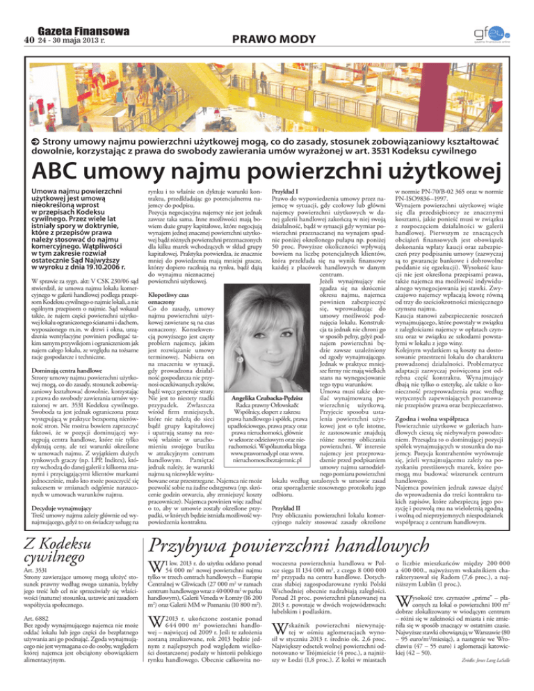40 PRAWO MODY 24 - 30 maja 2013 r. 0 Strony umowy najmu powierzchni użytkowej mogą, co do zasady, stosunek zobowiązaniowy kształtować dowolnie, korzystając z prawa do swobody zawierania umów wyrażonej w art. 3531 Kodeksu cywilnego ABC umowy najmu powierzchni użytkowej Umowa najmu powierzchni użytkowej jest umową nieokreśloną wprost w przepisach Kodeksu cywilnego. Przez wiele lat istniały spory w doktrynie, które z przepisów prawa należy stosować do najmu komercyjnego. Wątpliwości w tym zakresie rozwiał ostatecznie Sąd Najwyższy w wyroku z dnia 19.10.2006 r. W sprawie za sygn. akt: V CSK 230/06 sąd stwierdził, że umowa najmu lokalu komercyjnego w galerii handlowej podlega przepisom Kodeksu cywilnego o najmie lokali, a nie ogólnym przepisom o najmie. Sąd wskazał także, że najem części powierzchni użytkowej lokalu ograniczonego ścianami i dachem, wyposażonego m.in. w drzwi i okna, urządzenia wentylacyjne powinien podlegać takim samym przywilejom i ograniczeniom jak najem całego lokalu, ze względu na tożsame racje gospodarcze i techniczne. Dominują centra handlowe Strony umowy najmu powierzchni użytkowej mogą, co do zasady, stosunek zobowiązaniowy kształtować dowolnie, korzystając z prawa do swobody zawierania umów wyrażonej w art. 3531 Kodeksu cywilnego. Swoboda ta jest jednak ograniczona przez występującą w praktyce bezsporną nierówność stron. Nie można bowiem zaprzeczyć faktowi, że w pozycji dominującej występują centra handlowe, które nie tylko dyktują ceny, ale też warunki określone w umowach najmu. Z wyjątkiem dużych rynkowych graczy (np. LPP, Inditex), którzy wchodzą do danej galerii z kilkoma znanymi i przyciągającymi klientów markami jednocześnie, mało kto może poszczycić się sukcesem w zmianach odgórnie narzuconych w umowach warunków najmu. Decyduje wynajmujący Treść umowy najmu zależy głównie od wynajmującego, gdyż to on świadczy usługę na Z Kodeksu cywilnego Art. 3531 Strony zawierające umowę mogą ułożyć stosunek prawny według swego uznania, byleby jego treść lub cel nie sprzeciwiały się właściwości (naturze) stosunku, ustawie ani zasadom współżycia społecznego. Art. 6882 Bez zgody wynajmującego najemca nie może oddać lokalu lub jego części do bezpłatnego używania ani go podnająć. Zgoda wynajmującego nie jest wymagana co do osoby, względem której najemca jest obciążony obowiązkiem alimentacyjnym. rynku i to właśnie on dyktuje warunki kontraktu, przedkładając go potencjalnemu najemcy do podpisu. Pozycja negocjacyjna najemcy nie jest jednak zawsze taka sama. Inne możliwości mają bowiem duże grupy kapitałowe, które negocjują wynajem jednej znacznej powierzchni użytkowej bądź różnych powierzchni przeznaczonych dla kilku marek wchodzących w skład grupy kapitałowej. Praktyka potwierdza, że znacznie mniej do powiedzenia mają mniejsi gracze, którzy dopiero raczkują na rynku, bądź dążą do wynajmu nieznacznej powierzchni użytkowej. Przykład I Prawo do wypowiedzenia umowy przez najemcę w sytuacji, gdy czołowy lub główni najemcy powierzchni użytkowych w danej galerii handlowej zakończą w niej swoją działalność, bądź w sytuacji gdy wymiar powierzchni przeznaczanej na wynajem spadnie poniżej określonego pułapu np. poniżej 50 proc. Powyższe okoliczności wpływają bowiem na liczbę potencjalnych klientów, która przekłada się na wynik finansowy każdej z placówek handlowych w danym centrum. Jeżeli wynajmujący nie zgadza się na skrócenie Kłopotliwy czas okresu najmu, najemca oznaczony powinien zabezpieczyć Co do zasady, umowy się, wprowadzając do najmu powierzchni użytumowy możliwość podkowej zawierane są na czas najęcia lokalu. Konstrukoznaczony. Konsekwencja ta jednak nie chroni go cją powyższego jest częsty w sposób pełny, gdyż podproblem najemcy, jakim najem powierzchni bęjest rozwiązanie umowy dzie zawsze uzależniony terminowej. Nabiera on od zgody wynajmującego. na znaczeniu w sytuacji, Jednak w praktyce mniejgdy prowadzona działalsze firmy nie mają wielkich ność gospodarcza nie przyszans na wynegocjowanie nosi oczekiwanych zysków, tego typu warunków. bądź wręcz generuje straty. Umowa musi także okreAngelika Czubacka-Pędzisz Nie jest to niestety rzadki ślać wynajmowaną poRadca prawny Orłowska& przypadek. Zwłaszcza wierzchnię użytkową. Wspólnicy, ekspert z zakresu wśród firm mniejszych, Przyjecie sposobu ustaprawa handlowego i spółek, prawa które nie należą do sieci lenia powierzchni użytupadłościowego, prawa pracy oraz bądź grupy kapitałowej kowej jest o tyle istotne, prawa nieruchomości, głównie i upatrują szansy na rozże zastosowanie znajdują w sektorze odzieżowym oraz niewój właśnie w uruchoróżne normy obliczania ruchomości. Współautorka bloga mieniu swojego butiku powierzchni. W interesie www.prawomody.pl oraz www. w atrakcyjnym centrum najemcy jest przeprowanieruchomoscibeztajemnic.pl handlowym. Pamiętać dzenie przed podpisaniem jednak należy, że warunki umowy najmu samodzielnajmu są niezwykle wyśrunego pomiaru powierzchni bowane oraz przestrzegane. Najemca nie może lokalu według ustalonych w umowie zasad pozwolić sobie na żadne odstępstwa (np. skró- oraz sporządzenie stosownego protokołu jego cenie godzin otwarcia, aby zmniejszyć koszty odbioru. pracownicze). Najemca powinien więc zadbać o to, aby w umowie zostały określone przy- Przykład II padki, w których będzie istniała możliwość wy- Przy obliczaniu powierzchni lokalu komerpowiedzenia kontraktu. cyjnego należy stosować zasady określone w normie PN-70/B-02 365 oraz w normie PN-ISO9836 – 1997. Wynajem powierzchni użytkowej wiąże się dla przedsiębiorcy ze znacznymi kosztami, jakie ponieść musi w związku z rozpoczęciem działalności w galerii handlowej. Pierwszym ze znaczących obciążeń finansowych jest obowiązek dokonania wpłaty kaucji oraz z