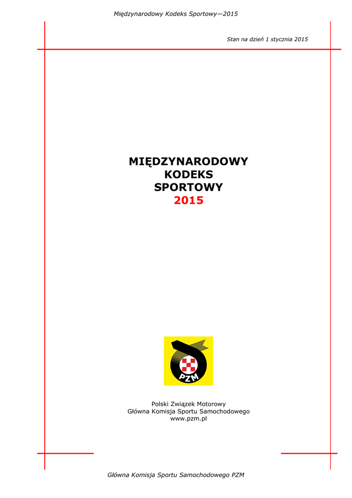 Międzynarodowy Kodeks Sportowy—2015 Stan na dzień 1 stycznia 2015 MIĘDZYNARODOWY KODEKS SPORTOWY 2015 Polski Związek Motorowy Główna Komisja Sportu Samochodowego www.pzm.pl Główna Komisja Sportu Samochodowego PZM Międzynarodowy Kodeks Sportowy—2015 Spis treści: Artykuł Artykuł Artykuł Artykuł Artykuł Artykuł Artykuł Artykuł Artykuł Artykuł Artykuł Artykuł Artykuł Artykuł Artykuł Artykuł Artykuł Artykuł Artykuł Artykuł 1 Przepisy ogólne 2 Zawody—Ogólne warunki 3 Zawody—Szczegóły organizacyjne 4 Wydarzenia / Zloty Turystyczne 5 Parada 6 Pokaz 7 Trasy i Tory 8 Starty i Biegi 9 Zawodnicy i Kierowcy 10 Samochody 11 Osoby Oficjalne 12 Kary 13 Protesty 14 Odwołania 15 Przepisy dotyczące Numerów Startowych i reklamy na Samochodach 16 Zakłady sportowe 17 Kwestie handlowe związane ze sportem samochodowym 18 Metody stabilizowania decyzji FIA 19 Stosowanie MKS 20 Definicje Str. 2 Główna Komisja Sportu Samochodowego PZM 3 4 13 16 17 17 18 18 20 23 25 30 35 37 39 39 40 40 41 41 Międzynarodowy Kodeks Sportowy—2015 ARTYKUŁ 1 ARTYKUŁ 1 PRZEPISY OGÓLNE ARTYKUŁ 1.1 MIĘDZYNARODOWE PRZEPISY SPORTU MOTOROWEGO 1.1.1 Międzynarodowa Federacja Samochodowa (Fédération Internationale de l'Automobile), zwana dalej FIA, jest jedyną międzynarodową władzą sportową upoważnioną do ustanawiania i wdrażania przepisów, opartych na podstawowych zasadach bezpieczeństwa oraz bezstronności sportowej, dotyczących propagowania i kontroli Zawodów samochodowych, oraz organizacji Międzynarodowych Mistrzostw FIA. 1.1.2 FIA jest międzynarodowym trybunałem ostatniej instancji, upoważnionym do rozstrzygania sporów mogących powstać podczas stosowania tych przepisów, uznając, że Międzynarodowa Federacja Motocyklowa sprawuje identyczną władzę odnośnie pojazdów samochodowych jedno, dwu i trójkołowych. ARTYKUŁ 1.2 MIĘDZYNARODOWY KODEKS SPORTOWY (MKS) 1.2.1 Celem umożliwienia sprawowania powyższej władzy w sposób rzetelny i sprawiedliwy, FIA ustanowiła Międzynarodowy Kodeks Sportowy (MKS) wraz z załącznikami. 1.2.2 Celem MKS jest regulacja, zachęcanie i ułatwienie uprawiania sportu samochodowego. 1.2.3 MKS nie będzie nigdy stosowany w celu utrudniania lub zapobiegania Zawodom lub udziałowi Zawodników, z wyjątkiem przypadku, gdy FIA dojdzie do wniosku, że taki środek jest konieczny, ażeby sport samochodowy mógł być uprawiany w warunkach pełnego bezpieczeństwa, w sposób sprawiedliwy i zgodny z przepisami. ARTYKUŁ 1.3 ZNAJMOŚĆ I PRZESTRZEGANIE REGULAMINÓW 1.3.1 Każda osoba lub grupa osób, organizująca Zawody lub uczestnicząca w nich: 1.3.1.a Uznana jest za osobę, która zapoznała się ze statutem i regulaminami FIA oraz regulaminami krajowymi. 1.3.1.b Zobowiązuje się bez żadnych zastrzeżeń poddać powyższemu i decyzjom władz sportowych i konsekwencjami z nich wynikającymi. 1.3.2 W przypadku nie przestrzegania niniejszych przepisów, każda osoba i grupa osób, które organizują Zawody lub biorą w nich udział, mogą mieć cofniętą wydaną im Licencję oraz każdy producent może być wykluczony okresowo lub na stałe z Mistrzostw FIA. FIA i/lub ASN uzasadni powody swoich decyzji. 1.3.3 Jeżeli dany Samochód uznany jest za niezgodny z regulaminem technicznym, brak przewagi osiągów wynikający z niezgodności regulaminowych nie będzie nigdy uważany jako element obrony. ARTYKUŁ 1.4 NARODOWE KIEROWANIE SPORTEM SAMOCHODOWYM 1.4.1 FIA uznaje tylko jeden ASN w danym kraju, jako jedyną władzę sportową upoważnioną do stosowania MKS i kierowania sportem samochodowym na całości terytoriów znajdujących się pod zwierzchnictwem tego kraju. 1.4.2 Każdy ASN zobowiązany jest do stosowania MKS. ARTYKUŁ 1.5 SPRAWOWANIE WŁADZY SPORTOWEJ W JEDNOSTKACH TERYTORIALNYCH Nieautonomiczne jednostki terytorialne danego Państwa podlegają władzy sportowej ASN-u, reprezentującego wspomniane Państwo wobec FIA. ARTYKUŁ 1.6 PRZEKAZYWANIE WŁADZY SPORTOWEJ Każdy ASN ma prawo przekazać jednemu lub kilku klubom ze swojego kraju, władzę sportową lub jej część, przyznaną mu przez MKS, jednakże wyłącznie po uprzedniej zgodzie FIA. ARTYKUŁ 1.7 COFNIĘCIE PEŁNOMICNITWA ASN ma prawo do cofnięcia przekazanej władzy sportowej, pod warunkiem poinformowania o tym fakcie FIA. ARTYKUŁ 1.8 KRAJOWE REGULAMINY SPORTOWE Każdy ASN może ustanowić swój krajowy regulamin sportowy, który musi być udostępniony FIA. Str. 3 Główna Komisja Sportu Samochodowego PZM Międzynarodowy Kodeks Sportowy—2015 ARTYKUŁ 2 ARTYKUŁ 2 ZAWODY-USTALENIA OGÓLNE 2.1 ZASADY OGÓLNE 2.1.1 Ogólne warunki stosowania MKS 2.1.1.a Wszelkie Zawody organizowane w kraju reprezentowanym w FIA, regulowane są przez niniejszy MKS. 2.1.1.b Jednakże Zawody Zamknięte są regulowane przez krajowy regulamin sportowy. W krajach w których nie opublikowano żadnego krajowego regulaminu sportowego, obowiązuje niniejszy MKS. 2.1.2 Organizacja Zawodów W każdym kraju Zawody mogą być organizowane: 2.1.2.a przez ASN 2.1.2.b przez automobilklub lub w wyjątkowych przypadkach inną wykwalifikowaną grupę sportową, z zastrzeżeniem, że ten klub lub ta grupa posiadać będzie niezbędne Zezwolenie na Organizację. 2.1.3 Dokumenty oficjalne 2.1.3.a We wszystkich Zawodach z wyjątkiem Prób Ustanowienia Rekordu, chyba, że przewidziano inaczej w określonych regulaminach FIA, muszą być wydane oficjalne dokumenty, wśród których obligatoryjnie musi znaleźć się Regulamin Uzupełniający, formularz Zgłoszenia i Oficjalny Program. 2.1.3.b Jeżeli jakikolwiek zapis w tychże dokumentach oficjalnych jest sprzeczny z niniejszym MKS, to uważany jest za nieważny. 2.1.4 Oświadczenie obowiązujące we wszystkich dokumentach dotyczących Zawodów 2.1.4.a Wszelkie Regulaminy Uzupełniające, Oficjalne Programy i Formularze Zgłoszeń związane z jakimikolwiek Zawodami, muszą zawierać w widoczny sposób następujące oświadczenie: „Zorganizowane zgodn