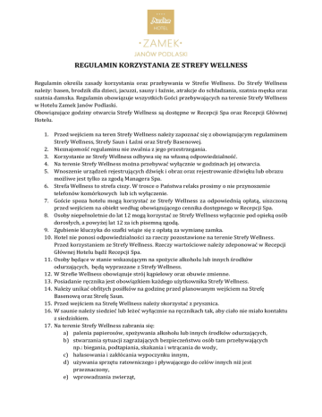 REGULAMIN KORZYSTANIA ZE STREFY WELLNESS Regulamin określa zasady korzystania oraz przebywania w Strefie Wellness. Do Strefy Wellness należy: basen, brodzik dla dzieci, jacuzzi, sauny i łaźnie, atrakcje do schładzania, szatnia męska oraz szatnia damska. Regulamin obowiązuje wszystkich Gości przebywających na terenie Strefy Wellness w Hotelu Zamek Janów Podlaski. Obowiązujące godziny otwarcia Strefy Wellness są dostępne w Recepcji Spa oraz Recepcji Głównej Hotelu. 1. Przed wejściem na teren Strefy Wellness należy zapoznać się z obowiązującym regulaminem Strefy Wellness, Strefy Saun i Łaźni oraz Strefy Basenowej. 2. Nieznajomość regulaminu nie zwalnia z jego przestrzegania. 3. Korzystanie ze Strefy Wellness odbywa się na własną odpowiedzialność. 4. Na terenie Strefy Wellness można przebywać wyłącznie w godzinach jej otwarcia. 5. Wnoszenie urządzeń rejestrujących dźwięk i obraz oraz rejestrowanie dźwięku lub obrazu możliwe jest tylko za zgodą Managera Spa. 6. Strefa Wellness to strefa ciszy. W trosce o Państwa relaks prosimy o nie przynoszenie telefonów komórkowych lub ich wyłączenie. 7. Goście spoza hotelu mogą korzystać ze Strefy Wellness za odpowiednią opłatą, uiszczoną przed wejściem na obiekt według obowiązującego cennika dostępnego w Recepcji Spa. 8. Osoby niepełnoletnie do lat 12 mogą korzystać ze Strefy Wellness wyłącznie pod opieką osób dorosłych, a powyżej lat 12 za ich pisemną zgodą. 9. Zgubienie kluczyka do szafki wiąże się z opłatą za wymianę zamka. 10. Hotel nie ponosi odpowiedzialności za rzeczy pozostawione na terenie Strefy Wellness. Przed korzystaniem ze Strefy Wellness. Rzeczy wartościowe należy zdeponować w Recepcji Głównej Hotelu bądź Recepcji Spa. 11. Osoby będące w stanie wskazującym na spożycie alkoholu lub innych środków odurzających, będą wypraszane z Strefy Wellness. 12. W Strefie Wellness obowiązuje strój kąpielowy oraz obuwie zmienne. 13. Posiadanie ręcznika jest obowiązkiem każdego użytkownika Strefy Wellness. 14. Należy unikać obfitych posiłków na godzinę przed planowanym wejściem na Strefę Basenową oraz Strefę Saun. 15. Przed wejściem na Strefę Wellness należy skorzystać z prysznica. 16. W saunie należy siedzieć lub leżeć wyłącznie na ręcznikach tak, aby ciało nie miało kontaktu z siedziskiem. 17. Na terenie Strefy Wellness zabrania się: a) palenia papierosów, spożywania alkoholu lub innych środków odurzających, b) stwarzania sytuacji zagrażających bezpieczeństwu osób tam przebywających np.: biegania, podtapiania, skakania i wtrącania do wody, c) hałasowania i zakłócania wypoczynku innym, d) używania sprzętu ratowniczego i pływającego do celów innych niż jest przeznaczony, e) wprowadzania zwierząt, f) g) h) i) j) k) l) m) n) 18. 19. 20. 21. 22. 23. 24. 25. 26. poruszania się w obuwiu do tego nieprzeznaczonym, wrzucania do wody jakichkolwiek przedmiotów do tego nieprzeznaczonych, niszczenia wyposażenia, dotykania i manipulowania przy urządzeniach, zanieczyszczania wody basenowej, wnoszenia własnych zapachów, aromatów, wykonywania zabiegów kosmetycznych, schładzania się po saunie w basenie lub basenie do hydromasażu, zachowania uznanego powszechnie za nieprzyzwoite lub obraźliwe, osoby naruszające porządek publiczny, przepisy regulaminu lub niestosujące się do zaleceń obsługi będą wypraszane z terenu Strefy Wellness. Osoby o niestabilnym stanie zdrowia powinny korzystać z atrakcji ze szczególną ostrożnością lub po konsultacji z lekarzem. Hotel nie ponosi odpowiedzialności za pogorszenie stanu zdrowia przez nieodpowiednie, niedostosowane korzystanie z atrakcji. W przypadku złego samopoczucia należy bezzwłocznie opuścić Strefę Wellness i w razie konieczności poinformować o tym obsługę. Osoby korzystające ze Strefy Wellness są zobowiązane do bezwzględnego przestrzegania zaleceń osób obsługujących obiekt. Odpowiedzialność materialną za wyrządzone szkody ponosi osoba winna zniszczenia lub uszkodzenia sprzętu. Za osoby niepełnoletnie niszczące sprzęt lub urządzenia ponoszą odpowiedzialność ich opiekunowie prawni. Hotel nie ponosi odpowiedzialności za wypadki spowodowane nieprzestrzeganiem regulaminu. W sprawach spornych, nieokreślonych niniejszym regulaminem zastosowanie mają zapisy prawne kodeksu cywilnego. Wszelkie uzasadnione życzenia, uwagi i skargi należy zgłaszać na piśmie do Recepcji Spa, Dyrekcji Hotelu lub Managera on Duty w trakcie pobytu w kompleksie Spa&Wellness. Gość wyraża zgodę na przetwarzanie i przechowywanie danych osobowych zgodnie z ustawą o ochronie danych osobowych (j.t. Dz. U. z 2002r. Nr 101, poz. 926) przez Arche Sp. z o.o. Gość ma prawo do wglądu do swoich danych osobowych oraz ich poprawiania. Hotel świadczy usługi zgodnie ze swoją kategorią i standardem. W przypadku jakichkolwiek zastrzeżeń dotyczących jakości usług Gość jest proszony o natychmiastowy kontakt z Dyrekcją Hotelu oraz Managerem Spa, co umożliwi niezwłoczną reakcję. Serdecznie dziękujemy za przestrzeganie powyższego regulaminu. W razie jakichkolwiek dodatkowych pytań Recepcja Spa pozostaje do Państwa dyspozycji w godzinach otwarcia. Życzymy miłego pobytu w Hotelu Zamek Janów Podlaski****.