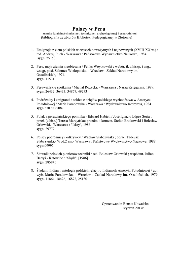 Polacy w Peru znani z działalności misyjnej, technicznej, archeologicznej i przyrodniczej (bibliografia ze zbiorów Biblioteki Pedagogicznej w Złotowie) 1. Emigracja z ziem polskich w czasach nowożytnych i najnowszych (XVIII-XX w.) / red. Andrzej Pilch.- Warszawa : Państwowe Wydawnictwo Naukowe, 1984. sygn. 25150 2. Peru, moja ziemia nieobiecana / Feliks Woytkowski ; wybór, tł. z hiszp. i ang., wstęp, posł. Salomea Wielopolska. - Wrocław : Zakład Narodowy im. Ossolińskich, 1974. sygn. 11531 3. Peruwiańskie spotkania / Michał Różycki. - Warszawa : Nasza Księgarnia, 1989. sygn. 26432, 36433, 34857, 49273 4. Podróżnicy i emigranci : szkice z dziejów polskiego wychodźstwa w Ameryce Południowej / Maria Paradowska.- Warszawa : Wydawnictwo Interpress, 1984. sygn.37070,25087 5. Polak z peruwiańskiego pomnika - Edward Habich / José Ignacio López Soria ; przeł. [z hisz.] Teresa Marzyńska; przedm. i koment. Stefan Bratkowski i Bolesław Orłowski.- Warszawa : "Iskry", 1986 sygn. 29777 6. Polscy podróżnicy i odkrywcy / Wacław Słabczyński ; oprac. Tadeusz Słabczyński.- Wyd.2 zm.- Warszawa : Państwowe Wydawnictwo Naukowe, 1988. sygn.09995 7. Słownik polskich pionierów techniki / red. Bolesław Orłowski ; współaut. Julian Bartyś.- Katowice : "Śląsk", [1986]. sygn. 28584p 8. Śladami Indian : antologia polskich relacji o Indianach Ameryki Południowej / aut. wyb. Maria Paradowska. - Wrocław : Zakład Narodowy im. Ossolińskich, 1979. sygn. 11864, 18426, 16872, 25180 Opracowanie: Renata Kowalska styczeń 2017r.