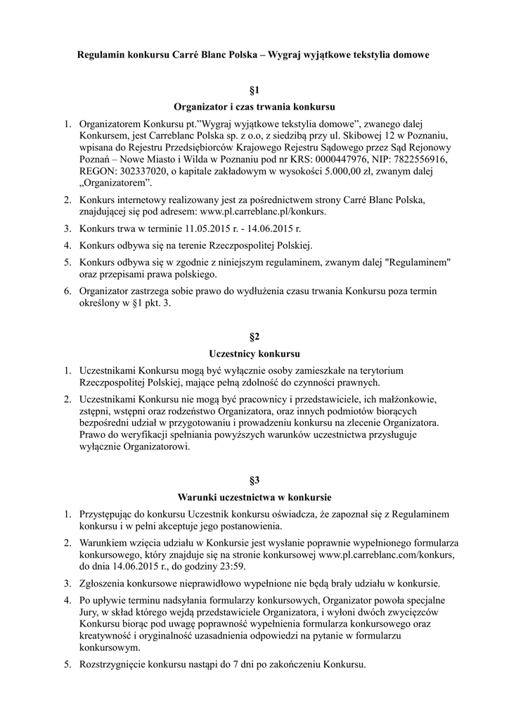 Regulamin konkursu Carré Blanc Polska – Wygraj wyjątkowe tekstylia domowe §1 Organizator i czas trwania konkursu 1. Organizatorem Konkursu pt.”Wygraj wyjątkowe tekstylia domowe”, zwanego dalej Konkursem, jest Carreblanc Polska sp. z o.o, z siedzibą przy ul. Skibowej 12 w Poznaniu, wpisana do Rejestru Przedsiębiorców Krajowego Rejestru Sądowego przez Sąd Rejonowy Poznań – Nowe Miasto i Wilda w Poznaniu pod nr KRS: 0000447976, NIP: 7822556916, REGON: 302337020, o kapitale zakładowym w wysokości 5.000,00 zł, zwanym dalej „Organizatorem”. 2. Konkurs internetowy realizowany jest za pośrednictwem strony Carré Blanc Polska, znajdującej się pod adresem: www.pl.carreblanc.pl/konkurs. 3. Konkurs trwa w terminie 11.05.2015 r. - 14.06.2015 r. 4. Konkurs odbywa się na terenie Rzeczpospolitej Polskiej. 5. Konkurs odbywa się w zgodnie z niniejszym regulaminem, zwanym dalej "Regulaminem" oraz przepisami prawa polskiego. 6. Organizator zastrzega sobie prawo do wydłużenia czasu trwania Konkursu poza termin określony w §1 pkt. 3. §2 Uczestnicy konkursu 1. Uczestnikami Konkursu mogą być wyłącznie osoby zamieszkałe na terytorium Rzeczpospolitej Polskiej, mające pełną zdolność do czynności prawnych. 2. Uczestnikami Konkursu nie mogą być pracownicy i przedstawiciele, ich małżonkowie, zstępni, wstępni oraz rodzeństwo Organizatora, oraz innych podmiotów biorących bezpośredni udział w przygotowaniu i prowadzeniu konkursu na zlecenie Organizatora. Prawo do weryfikacji spełniania powyższych warunków uczestnictwa przysługuje wyłącznie Organizatorowi. §3 Warunki uczestnictwa w konkursie 1. Przystępując do konkursu Uczestnik konkursu oświadcza, że zapoznał się z Regulaminem konkursu i w pełni akceptuje jego postanowienia. 2. Warunkiem wzięcia udziału w Konkursie jest wysłanie poprawnie wypełnionego formularza konkursowego, który znajduje się na stronie konkursowej www.pl.carreblanc.com/konkurs, do dnia 14.06.2015 r., do godziny 23:59. 3. Zgłoszenia konkursowe nieprawidłowo wypełnione nie będą brały udziału w konkursie. 4. Po upływie terminu nadsyłania formularzy konkursowych, Organizator powoła specjalne Jury, w skład którego wejdą przedstawiciele Organizatora, i wyłoni dwóch zwycięzców Konkursu biorąc pod uwagę poprawność wypełnienia formularza konkursowego oraz kreatywność i oryginalność uzasadnienia odpowiedzi na pytanie w formularzu konkursowym. 5. Rozstrzygnięcie konkursu nastąpi do 7 dni po zakończeniu Konkursu. 6. Organizator skontaktuje się ze zwycięzcami Konkursu w terminie do 7 dni po ogłoszeniu wyników Konkursu. 7. Zwycięzca Konkursu zostanie powiadomiony o wygranej drogą mailową na adres e-mail podany w formularzu konkursowym. 8. Warunkiem niezbędnym do otrzymania nagrody jest przekazanie Organizatorowi danych do wysyłki nagrody (imię i nazwisko, adres, numer telefonu). 9. W przypadku, gdy zwycięzca konkursu, w ciągu 7 dni od otrzymanej od Organizatora wiadomości e-mail informującej o wygranej nie odpowie na nią i nie przekaże danych niezbędnych do wysyłki nagrody, traci prawo do nagrody i Organizatorowi przysługuje prawo do innego przydzielenia tej nagrody. §4 Nagrody w konkursie 1. Nagrodami w Konkursie są: I miejsce: komplet pościeli z kolekcji Jade (poszwa na kołdrę o wymiarach 200x200 cm + dwie poszewki na poduszkę o wymiarach 65x65 cm) o łącznej wartości 701 złotych. II miejsce: komplet ręczników z kolekcji Lola (kąpielowy o wymiarach 90x150 cm + prysznicowy o wymiarach 70x130 cm + średni o wymiarach 50x90 cm) o łącznej wartości 409 złotych. Zwycięzca będzie mógł zdecydować o kolorze. 2. Uczestnik konkursu może wygrać tylko jedną nagrodę. 3. Zwycięzca może wygrać tylko jedną nagrodę z wymienionych w §4 pkt. 1. 4. Organizator oświadcza, że w związku z przepisami prawa o podatku dochodowym od osób fizycznych nagroda jest zwolniona od podatku. 5. W przypadku nie zgłoszenia się zwycięzcy w sprawie otrzymania nagrody w terminie 7 dni od otrzymania informacji o wygranej, nagroda przechodzi na własność Organizatora. §4 Dane osobowe 1. Organizator oświadcza, że prowadzi bazę danych osobowych. Dane wyszczególnione w formularzu będą przetwarzane przez Organizatora zgodnie z Ustawą z dnia 29 sierpnia 1997 r. o ochronie danych osobowych (Dz.U. z 2002r. Nr 101, poz. 926, ze zm.). §5 Reklamacje 1. Reklamacje związane z Konkursem będą przyjmowane przez Organizatora jedynie w formie pisemnej. 2. Reklamacje powinny być wysłane drogą listowną na adres Organizatora w terminie do 3 dni od daty ogłoszenia zwycięzców Konkursu. 3. Reklamacje powinny zawierać następujące informacje: imię i nazwisko, adres, nazwę konkursu oraz opis reklamacji. 4. Otrzymane reklamacje zostaną rozpatrzone w ciągu 5 dni od daty jej otrzymania. 5. Decyzja specjalnie powołanej Komisji Reklamacyjnej jest wiążąca i ostateczna. Uczestnik konkursu, zgłaszający reklamacje zostanie o niej poinformowany w ciągu 10 dni od daty jej rozpatrzenia. §6 Postanowienia końcowe 1. Organizator zastrzega sobie prawo zmiany okresu trwania Konkursu. W takim przypadku, informacja o tym zostanie przekazana do wiadomości na stronie www.pl.carreblanc.com/konkurs. 2. W przypadku niemożności odbioru nagrody przez uczestnika konkursu Organizator nie wysyła nagrody ponownie. 3. Uczestnik ponosi pełną odpowiedzialność prawną, jeśli jego działania związane z konkursem w jakikolwiek sposób naruszają prawa osób trzecich lub powszechnie obowiązujące przepisy prawa. 4. Odpowiedzialność Organizatora ograniczona jest względem uczestnika do wysokości wartości nagród. 5. We wszystkich sprawach dotyczących Konkursu, a nieuregulowanych Regulaminem, stosuje się przepisy prawa polskiego, a w szczególności przepisy Kodeksu Cywilnego. Skierowanie sprawy na drogę sądową może nastąpić wyłącznie po wyczerpaniu drogi postępowania reklamacyjnego. Sporządzono 