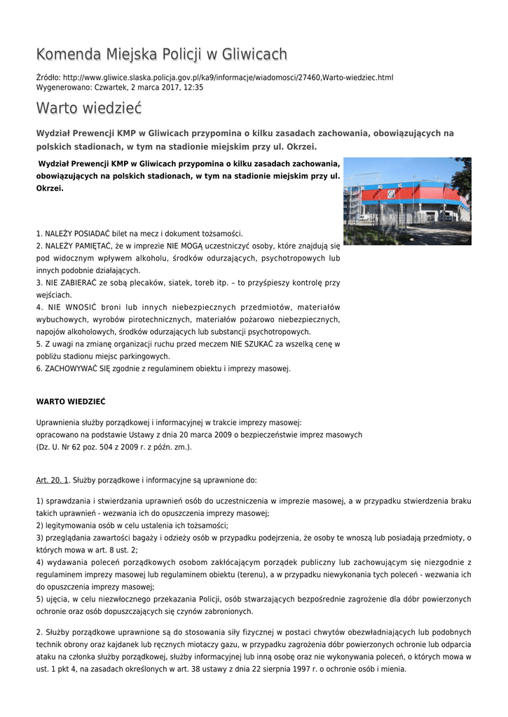 Komenda Miejska Policji w Gliwicach Źródło: http://www.gliwice.slaska.policja.gov.pl/ka9/informacje/wiadomosci/27460,Warto-wiedziec.html Wygenerowano: Czwartek, 2 marca 2017, 12:35 Warto wiedzieć Wydział Prewencji KMP w Gliwicach przypomina o kilku zasadach zachowania, obowiązujących na polskich stadionach, w tym na stadionie miejskim przy ul. Okrzei. Wydział Prewencji KMP w Gliwicach przypomina o kilku zasadach zachowania, obowiązujących na polskich stadionach, w tym na stadionie miejskim przy ul. Okrzei. 1. NALEŻY POSIADAĆ bilet na mecz i dokument tożsamości. 2. NALEŻY PAMIĘTAĆ, że w imprezie NIE MOGĄ uczestniczyć osoby, które znajdują się pod widocznym wpływem alkoholu, środków odurzających, psychotropowych lub innych podobnie działających. 3. NIE ZABIERAĆ ze sobą plecaków, siatek, toreb itp. – to przyśpieszy kontrolę przy wejściach. 4. NIE WNOSIĆ broni lub innych niebezpiecznych przedmiotów, materiałów wybuchowych, wyrobów pirotechnicznych, materiałów pożarowo niebezpiecznych, napojów alkoholowych, środków odurzających lub substancji psychotropowych. 5. Z uwagi na zmianę organizacji ruchu przed meczem NIE SZUKAĆ za wszelką cenę w pobliżu stadionu miejsc parkingowych. 6. ZACHOWYWAĆ SIĘ zgodnie z regulaminem obiektu i imprezy masowej. WARTO WIEDZIEĆ Uprawnienia służby porządkowej i informacyjnej w trakcie imprezy masowej: opracowano na podstawie Ustawy z dnia 20 marca 2009 o bezpieczeństwie imprez masowych (Dz. U. Nr 62 poz. 504 z 2009 r. z późn. zm.). Art. 20. 1. Służby porządkowe i informacyjne są uprawnione do: 1) sprawdzania i stwierdzania uprawnień osób do uczestniczenia w imprezie masowej, a w przypadku stwierdzenia braku takich uprawnień - wezwania ich do opuszczenia imprezy masowej; 2) legitymowania osób w celu ustalenia ich tożsamości; 3) przeglądania zawartości bagaży i odzieży osób w przypadku podejrzenia, że osoby te wnoszą lub posiadają przedmioty, o których mowa w art. 8 ust. 2; 4) wydawania poleceń porządkowych osobom zakłócającym porządek publiczny lub zachowującym się niezgodnie z regulaminem imprezy masowej lub regulaminem obiektu (terenu), a w przypadku niewykonania tych poleceń - wezwania ich do opuszczenia imprezy masowej; 5) ujęcia, w celu niezwłocznego przekazania Policji, osób stwarzających bezpośrednie zagrożenie dla dóbr powierzonych ochronie oraz osób dopuszczających się czynów zabronionych. 2. Służby porządkowe uprawnione są do stosowania siły fizycznej w postaci chwytów obezwładniających lub podobnych technik obrony oraz kajdanek lub ręcznych miotaczy gazu, w przypadku zagrożenia dóbr powierzonych ochronie lub odparcia ataku na członka służby porządkowej, służby informacyjnej lub inną osobę oraz nie wykonywania poleceń, o których mowa w ust. 1 pkt 4, na zasadach określonych w art. 38 ustawy z dnia 22 sierpnia 1997 r. o ochronie osób i mienia. 3. Czynności, o których mowa w ust. 1 i 2, powinny być wykonywane w sposób zapewniający poszanowanie godności ludzkiej oraz innych dóbr osobistych osoby, w stosunku do której zostały podjęte. WARTO WIEDZIEĆ Przepisy karne obowiązujące w trakcie imprez masowych (wybrane): opracowano na podstawie Ustawy z dnia 20 marca 2009 o bezpieczeństwie imprez masowych (Dz. U. Nr 62 poz. 504 z 2009 r. z późn. zm.). Art. 54. 1. Kto nie wykonuje polecenia porządkowego, wydanego na podstawie ustawy, regulaminu obiektu (terenu) lub regulaminu imprezy masowej przez służby porządkowe lub służby informacyjne, podlega karze ograniczenia wolności albo grzywny nie niższej niż 2000 zł. 2. Tej samej karze podlega, kto w czasie trwania: 1) imprezy masowej przebywa w miejscu nieprzeznaczonym dla publiczności; 2) masowej imprezy sportowej przebywa w sektorze innym niż wskazany na bilecie wstępu lub innym dokumencie uprawniającym do przebywania na imprezie masowej i nie opuszcza tego sektora mimo wezwania osoby uprawnionej. Art. 55. Kto nie wykonuje polecenia wydanego przez Policję lub Żandarmerię Wojskową, w miejscu i w czasie trwania imprezy masowej, podlega karze ograniczenia wolności albo grzywny nie niższej niż 2000 zł. Art. 56. Kto wbrew przepisom ustawy wnosi lub posiada na imprezie masowej napoje alkoholowe, podlega karze ograniczenia wolności albo grzywny nie niższej niż 2000 zł."; Art. 57a. Kto w miejscu i w czasie trwania masowej imprezy sportowej używa elementu odzieży lub przedmiotu w celu uniemożliwienia lub istotnego utrudnienia rozpoznania osoby, podlega karze ograniczenia wolności albo grzywny nie niższej niż 2000 zł., Art. 59. 1. Kto wnosi lub posiada na imprezie masowej broń, w rozumieniu ustawy z dnia 21 maja 1999 r. o broni i amunicji (Dz. U. z 2004 r. Nr 52, poz. 525, z późn. zm.6)), wyroby pirotechniczne, materiały pożarowo niebezpieczne lub inne niebezpieczne przedmioty lub materiały wybuchowe, podlega grzywnie nie mniejszej niż 180 stawek dziennych, karze ograniczenia wolności albo pozbawienia wolności od 3 miesięcy do lat 5. Art. 60. 1. Kto w czasie trwania masowej imprezy sportowej, w tym meczu piłki nożnej, wdziera się na teren, na którym rozgrywane są zawody sportowe, albo wbrew żądaniu osoby uprawnionej miejsca takiego nie opuszcza, podlega grzywnie nie mniejszej niż 180 stawek dziennych, karze ograniczenia wolności albo pozbawienia wolności do lat 3. 1a. Kto w czasie trwania imprezy masowej wdziera się na teren obiektu lub na teren, gdzie prowadzona jest impreza masowa albo wbrew żądaniu osoby uprawnionej miejsca takiego nie opuszcza, podlega grzywnie, karze ograniczenia wolności albo pozbawienia wolności do roku. 2. Kto w czasie trwania imprezy masowej rzuca przedmiot, mogący stanowić zagrożenie dla życia, zdrowia lub bezpieczeństwa osób przebywających na terenie lub w obiekcie, gdzie odbywa się impreza masowa, albo w inny, równie niebezpieczny sposób zakłóca przebieg tej imprezy, podlega grzywnie nie mniejsze