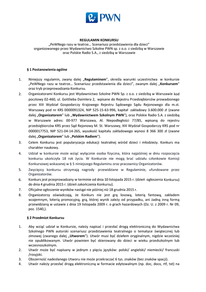 REGULAMIN KONKURSU „PeWNego razu w teatrze… Scenariusz przedstawienia dla dzieci” organizowanego przez Wydawnictwo Szkolne PWN sp. z o.o. z siedzibą w Warszawie oraz Polskie Radio S.A., z siedzibą w Warszawie § 1 Postanowienia ogólne 1. 2. Niniejszy regulamin, zwany dalej „Regulaminem”, określa warunki uczestnictwa w konkursie „PeWNego razu w teatrze… Scenariusz przedstawienia dla dzieci”, zwanym dalej „Konkursem” oraz tryb przeprowadzania Konkursu. Organizatorami Konkursu jest Wydawnictwo Szkolne PWN Sp. z o.o. z siedzibą w Warszawie kod pocztowy 02-460, ul. Gottlieba Daimlera 2, wpisane do Rejestru Przedsiębiorców prowadzonego przez XIII Wydział Gospodarczy Krajowego Rejestru Sądowego Sądu Rejonowego dla m.st. Warszawy pod nr KRS 0000091324, NIP 525-15-63-996, kapitał zakładowy 3.600.000 zł (zwane dalej „Organizatorem” lub „Wydawnictwem Szkolnym PWN”), oraz Polskie Radio S.A. z siedzibą w Warszawie adres: 00-977 Warszawa, Al. Niepodległości 77/85, wpisaną do rejestru przedsiębiorców KRS przez Sąd Rejonowy M. St. Warszawy, XIII Wydział Gospodarczy KRS pod nr 0000017753, NIP 521-04-14-265, wysokość kapitału zakładowego wynosi 8 366 300 zł (zwane dalej „Organizatorem” lub „Polskim Radiem”). 3. Celem Konkursu jest popularyzacja edukacji teatralnej wśród dzieci i młodzieży. Konkurs ma charakter naukowy. 4. Udział w konkursie może wziąć wyłącznie osoba fizyczna, która najpóźniej w dniu rozpoczęcia konkursu ukończyła 18 rok życia. W Konkursie nie mogą brać udziału członkowie Komisji Konkursowej wskazanej w § 5 niniejszego Regulaminu oraz pracownicy Organizatorów. 5. Zwycięzcy konkursu otrzymają nagrody przewidziane w Regulaminie, ufundowane przez Organizatorów. Konkurs jest przeprowadzany w terminie od dnia 10 listopada 2015 r. (dzień ogłoszenia Konkursu) do dnia 4 grudnia 2015 r. (dzień zakończenia Konkursu). Oficjalne ogłoszenie wyników nastąpi nie później niż 18 grudnia 2015 r. Organizatorzy oświadczają, że Konkurs nie jest grą losową, loterią fantową, zakładem wzajemnym, loterią promocyjną, grą, której wynik zależy od przypadku, ani żadną inną formą przewidzianą w ustawie z dnia 19 listopada 2009 r. o grach hazardowych (Dz. U. z 2009 r. Nr 09, poz. 1540,). 6. 7. 8. § 2 Przedmiot Konkursu 1. 2. 3. 4. Aby wziąć udział w Konkursie, należy napisać i przesłać drogą elektroniczną do Wydawnictwa Szkolnego PWN autorski scenariusz przedstawienia teatralnego o tematyce świątecznej lub zimowej (zwanego dalej „Utworem”). Utwór musi być dziełem oryginalnym, nigdzie wcześniej nie opublikowanym. Utwór powinien być skierowany do dzieci w wieku przedszkolnym lub wczesnoszkolnym. Utwór może być napisany w jednym z pięciu języków: polski/ angielski/ niemiecki/ francuski /rosyjski. Obszerność nadesłanego Utworu nie może przekraczać 6 tys. znaków (bez znaków spacji). Utwór należy przesłać drogą elektroniczną w formacie edytowalnym (np. doc, docx, rtf, txt) na 5. adres: [email protected] w terminie od 10 listopada 2015 r. do dnia 4 grudnia 2015 r. do godz. 23:59. Prace przesłane po terminie nie będą oceniane. § 3 Warunki uczestnictwa i przebieg Konkursu 1. 2. 3. 4. 5. 6. 7. 8. 9. 10. 11. 12. 13. 14. Konkurs ma charakter otwarty. Udział w Konkursie jest dobrowolny i bezpłatny. Konkurs składa się z jednego etapu. Uczestnicy Konkursu wykonują Utwory określone w § 2 Regulaminu. Zgłoszenie udziału w Konkursie następuje poprzez wysłanie maila na adres [email protected] w terminie od 10 listopada 2015 r. do 4 grudnia 2015 r. do godz. 23:59. W zgłoszeniu mailowym autorzy umieszczają następujące dane: imię i nazwisko, adres korespondencyjny, adres mailowy, numer telefonu. Do maila należy dołączyć Utwór (pracę konkursową) oraz oświadczenia, o których mowa w ust. 7 i 8 poniżej, a także oświadczenie, o którym mowa w par. 4 ust. 5. W Konkursie biorą udział tylko kompletne zgłoszenia. Osoby zgłaszające Utwory do Konkursu są jego uczestnikami (dalej: „Uczestnik” lub „Uczestnicy”). Każdy Uczestnik może zgłosić tylko jeden Utwór swojego autorstwa, który nie został nigdzie wcześniej opublikowany. Warunkiem wzięcia udziału w Konkursie jest wysłanie kopii prawidłowo wypełnionego i podpisanego oświadczenia zawartego w Załączniku nr 1 do niniejszego Regulaminu, o wyrażeniu zgody na przetwarzanie swoich danych osobowych na potrzeby realizacji Konkursu. Warunkiem wzięcia udziału w Konkursie jest wysłanie kopii prawidłowo wypełnionego i podpisanego oświadczenia zawartego w Załączniku nr 1 do niniejszego Regulaminu, o wyrażeniu zgody na publikację swoich danych osobowych w zakresie: imienia, nazwiska oraz miejscowości, w której Uczestnik zamieszkuje, w celu publikacji informacji o zwycięskich Utworach Konkursu i Uczestnikach, którzy je zgłosili. Na zakończenie Konkursu, Komisja Konkursowa, o której mowa w § 5, wyłoni spośród wszystkich Uczestników piętnastu laureatów. Przy ocenie Utworów Komisja Konkursowa weźmie pod uwagę następujące kryteria: a) spełnienie przez Utwór warunków formalnych określonych w Regulaminie; b) zgodność z tematyką konkursu; c) poprawność językowa; d) pomysłowość autora; e) oryginalność Utworu; f) ciekawy sposób ujęcia tematu; g) walory artystyczne i edukacyjne. Oficjalne ogłoszenie wyników nastąpi nie później niż 18 grudnia 2015 r. na stronach internetowych Organizatorów, w tym przede wszystkim na stronie internetowej www.wszpwn.com.pl oraz na antenie Polskiego Radia Dzieciom. W ramach ogłoszenia wyników Konkursu publikowane zostaną jedynie informacje o zwycięskich Utworach i Uczestnikach, którzy je zgłosili (w zakresie danych objętych oświadczeniem zgody, o którym mowa w ust. 8 powyżej). Uczestnik nadsyłając swój tekst wyraża zgodę na nieodpłatne udzielenie niewyłącznej licencji na wykorzystanie zgłoszonego Utworu przez W