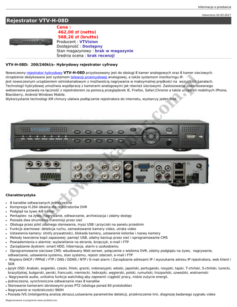 Informacje o produkcie Utworzono 02-03-2017 Rejestrator VTV-H-08D Cena : 462,00 zł (netto) 568,26 zł (brutto) Producent : VTVision Dostępność : Dostępny Stan magazynowy : brak w magazynie Średnia ocena : brak recenzji VTV-H-08D: 200/240kl/s– Hybrydowy rejestrator cyfrowy ● ● ● ● ● ● ● ● ● ● ● ● ● ● ● ● ● ● 8 kanałów odtwarzanych jednocześnie Kompresja H.264 idealna dla rejestratorów DVR Podgląd na żywo 4/8 kamer Pentaplex: na żywo, nagrywanie, odtwarzanie, archiwizacja i zdalny dostęp Posiada dwa strumienie transmisji przez sieć Obsługa przez pilot zdalnego sterowania, mysz USB i przyciski na panelu przednim Funkcje alarmowe: detekcja ruchu, zamaskowanie kamery video, utrata video Ustawienia kamery: strefy prywatności, blokada kamery, ustawienie kolorów i nazwy kamery Metody tworzenia kopii zapasowej: pamięć USB, zdalny backup przez sieć i oprogramowanie CMS Powiadomienia o alarmie: wyświetlanie na ekranie, brzęczyk, e-mail i FTP Zarządzanie dyskiem: smart HDD, hibernacja, alarm o uszkodzeniu Oprogramowanie sieciowe CMS: wbudowany Web serwer, połączenie z wieloma DVR, zdalny podglądu na żywo, nagrywanie, odtwarzanie, ustawienia systemu, stan systemu, rejestr zdarzeń, e-mail i FTP Wspiera DHCP / PPPoE / FTP / DNS / DDNS / NTP / E-mail alarm / Zarządzanie adresami IP / wyszukanie adresu IP rejestratora, web klient i SDK Język OSD: Arabski, angielski, czeski, fiński, grecki, indonezyjski, włoski, japoński, portugalski, rosyjski, tajski, T-chiński, S-chiński, turecki, brazylijskiej, bułgarski, perski, francuski, niemiecki, hebrajski, węgierski, polski, rumuński, hiszpański, szwedzki, wietnamski Nagrywanie audio, unikalna funkcja watchdog aby zapewnić ciągłość pracy, niskie zużycie energii. Jednoczesne, synchroniczne odtwarzanie max 8 kanałów Sterowanie kamerami obrotowymi przez PTZ (obsługa ponad 60 protokołów) Nagrywanie w rozdzielczości 960H Posiada IVS (inteligentną analizę obrazu),ustawianie parametrów detekcji, przekroczenie linii, diagnozę badanego sygnału video hu ● rt Charakterystyka ow ni ak am er .c om .p l Nowoczesny rejestrator hybrydowy VTV-H-08D przystosowany jest do obsługi 8 kamer analogowych oraz 8 kamer sieciowych. Urządzenie dedykowane jest systemom telewizji przemysłowej analogowej, a także systemom monitoringu IP. Jest nowoczesnym urządzeniem ośmiokanałowym z możliwością nagrywania w maksymalnej prędkości na wszystkich kanałach. Technologii hybrydowej umożliwia współpracę z kamerami analogowymi jak również sieciowymi. Zastosowanie zawansowanego webserwera pozwala na łączność z rejestratorem za pomocą przeglądarek IE, Firefox, Safari,Chrome a także urządzeń mobilnych iPhone, Blackberry, Android Windows Mobile. Wykorzystanie technologi XM chmury ułatwia podłączenie rejestratora do internetu, wystarczy jeden krok. Wygenerowano w programie www.oscGold.com ● ● ● DVR, NVR i HVR, 3 w 1 Wspiera smartfony i przeglądarki Internetowe (IE, Firefox, Safari i Chrome). Zdalne monitorowanie w czasie rzeczywistym dla producentów takich jak iPhone, Blackberry, Android, Nokia i Windows Mobile. Technologia XM chmury (www.xmeye.net), nie ma potrzeby mapowania rutera, wystarczy jeden krok aby mieć dostęp do rejestratora za pośrednictwem Internetu SPECYFIKACJA Nagrywanie i odtwarzanie Zapis I kopiowanie Funkcje pentaplex: podgląd na żywo, zapis, odtwarzanie, kopiowanie & zdalny dostęp Interfejs użytkownika GUI, menu ekranowe Obsługa funkcji Panel czołowy, mysz USB, pilot Standard video PAL 625 linii,50 kl/s; NTSC 525 linie,60 kl/s Kompresja video H.264 Zapis video D1: PAL 1-25kl/s NTSC 1-30kl/s; Detekcja obrazu Strefy:192(16*12) pola detekcji, Czułość: 1-6(6 stopniowa). Wyzwalanie nagrywania, trasa, alarm, e-mail & FTP Ustawienie wyjścia video Regulacja koloru, rozdzielczości & strefy wyświetlania Kompresja audio G711A Transmisja audio Dwukierunkowa Ustawienia nagrywania Manualne>Alarm>Detekcja Obrazu>Ciągłe Playback 8 kanałów odtwarzanych równocześnie, pauza, stop, przewijanie, szybkie przewijanie, powolne odtwarzanie, następny plik, wcześniejszy plik, powtarzanie, wybór materiału do kopiowania Wyszukiwanie nagrań Wyszukiwanie po: czasie/dacie, alarmie, z detekcji obrazu Zajmowane miejsce na dysku Video: 1080p 80G/dzień/ch, 720p 26G/dzień/ch, D1 16~20G/dzień/ch; Audio: 691.2M/dzień/ch Zarządzanie dyskiem Technologia hibernacji dysku, alarm o awarii dysku Archiwizacja danych Przez sieć internetową oraz za pomocą pamięci USB Wejścia wideo 8 kanałów Wyjścia wideo 1ch TV BNC 1.0Vp-p 75Ω, 1ch VGA, 1ch HDMI Wejścia audio 8 kanałów Wyjścia audio 1 kanał Wejścia alarmowe 4 kanały Wyjścia alarmowe 1 kanał Rodzaje pracy Tylko kamery analogowe(DVR): 8*D1 Kamery analogowe + IP(HVR): 2 *D1+(1*1080P+1*720P) Tylko kamery IP(NVR): 8*960H /4*720P / 2*1080P/1*720P+7*D1 /1*1080P+1*720P+2*D1 Złącze Internetu RJ-45 (10M/100M) Złącza USB 2*USB 2.0 porty Kontrola PTZ 1 RS485 3G Obsługuje Ilość dysków 1 SATA port(Max 3T) Zasilanie 12V/3A Pobór mocy <10W Temperatura pracy 0-55°C Wilgotność 10%-90% Ciśnienie atmosferyczne 86kpa-106kpa Wymiary 31*28,5*4.5cm Waga 2Kg Pozycja pracy Pozioma hu Środowisko pracy .p l LINUX System zapis/odczyt rt Wejścia System operacyjny er .c om Audio 1*Hi3520A ni ak am Video VTV-H-08D Procesor ow System Model hu rt ow ni ak am er .c om .p l Informacje o produkcie Wygenerowano w programie www.oscGold.com
