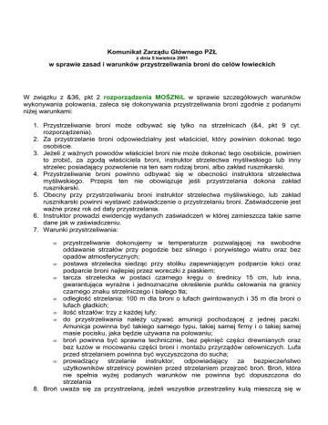 Komunikat Zarządu Głównego PZŁ z dnia 5 kwietnia 2001 w sprawie zasad i warunków przystrzeliwania broni do celów łowieckich W związku z &36, pkt 2 rozporządzenia MOŚZNiL w sprawie szczegółowych warunków wykonywania polowania, zaleca się dokonywania przystrzeliwania broni zgodnie z podanymi niżej warunkami: 1. Przystrzeliwanie broni może odbywać się tylko na strzelnicach (&4, pkt 9 cyt. rozporządzenia). 2. Za przystrzelanie broni odpowiedzialny jest właściciel, który powinien dokonać tego osobiście. 3. Jeżeli z ważnych powodów właściciel broni nie może dokonać tego osobiście, powinien to zrobić, za zgodą właściciela broni, instruktor strzelectwa myśliwskiego lub inny strzelec posiadający pozwolenie na ten sam rodzaj broni, albo zakład rusznikarski. 4. Przystrzeliwanie broni powinno odbywać się w obecności instruktora strzelectwa myśliwskiego. Przepis ten nie obowiązuje jeśli przystrzelania dokona zakład rusznikarski. 5. Obecny przy przystrzeliwaniu broni instruktor strzelectwa myśliwskiego, lub zakład rusznikarski powinni wystawić zaświadczenie o przystrzelaniu broni. Zaświadczenie jest ważne przez rok od daty przystrzelania. 6. Instruktor prowadzi ewidencję wydanych zaświadczeń w której zamieszcza takie same dane jak w zaświadczeniu. 7. Warunki przystrzeliwania: • • • • • • • • 8. Broń przystrzeliwanie dokonujemy w temperaturze pozwalającej na swobodne oddawanie strzałów przy pogodzie bez silnego i porywistego wiatru oraz bez opadów atmosferycznych; postawa strzelecka siedząc przy stoliku zapewniającym podparcie łokci oraz podparcie broni najlepiej przez woreczki z piaskiem; tarcza strzelecka w postaci czarnego kręgu o średnicy 15 cm, lub inna, gwarantująca wyraźne i jednoznaczne określenie punktu celowania na granicy czarnego znaku strzelniczego i białego tła; odległość strzelania: 100 m dla broni o lufach gwintowanych i 35 m dla broni o lufach gładkich; ilość strzałów: trzy z każdej lufy; do przystrzeliwania należy używać amunicji pochodzącej z jednej paczki. Amunicja powinna być takiego samego typu, takiej samej firmy i o takiej samej masie pocisku, jaka będzie używana na polowaniu; broń powinna być sprawna technicznie, bez pęknięć części drewnianych oraz bez luzów w mocowaniu części broni i montażu przyrządów celowniczych. Lufa przed strzelaniem powinna być wyczyszczona do sucha; prowadzący strzelanie instruktor, odpowiadający za bezpieczeństwo użytkowników strzelnicy powinien przed strzelaniem przejrzeć broń. Broń, która nie spełnia wyżej podanych warunków nie powinna być dopuszczona do strzelania uważa się za przystrzelaną, jeżeli wszystkie przestrzeliny kulą mieszczą się w okręgu o średnicy co najwyżej 12 cm zarówno dla luf gwintowanych jak i gładkich, a średni punkt trafienia z każdej lufy gwintowanej znajduje się nie dalej niż 4 cm, natomiast średni punkt trafienia z każdej lufy gładkiej znajduje się nie dalej niż 6 cm przy strzelaniu kulą lub śrutem, od oczekiwanego punktu trafienia. 9. Lufa gładka nie podlega przystrzeliwaniu kulami jeżeli strzela się z niej wyłącznie śrutem. Broń z lufami gładkimi, które dobrze strzelają śrutem, a nie spełniają warunków przystrzeliwania kulą, nie powinny być dopuszczone do strzelania kulą z tych luf. 10. Broń, która nie spełnia warunków podanych w punkcie 8 nie powinna być dopuszczona do strzelania i kwalifikuje się do naprawy. 11. Punkty 8, 9 i 10 dotyczą odpowiednio broni kombinowanej. dr Lech Bloch Prezes Zarządu PZŁ Komunikat nr 6/2001 omawia zasady i warunki przystrzeliwania broni w świetle § 36 Rozporządzenia Ministra Środowiska Zasobów Naturalnych i Leśnictwa z dnia 4 kwietnia 1997 r. W sprawie szczegółowych warunków wykonywania polowania oraz obowiązku znakowania, który w dwóch pierwszych punktach, mówi, że myśliwy jest zobowiązany do przestrzegania następujących zasad: 1. używania tylko broni myśliwskiej sprawnej technicznie; 2. przystrzeliwania broni co najmniej raz w roku. Krótkie dyspozycje zarówno rozporządzenia jak i komunikatu mogą budzić wątpliwości różnej natury i dlatego przedstawiamy niniejsze uzasadnienie. 1. Z tekstu zapisu § 36 cyt. rozporządzenia wynika, że za realizację omówionych tam spraw odpowiedzialny jest myśliwy. Wynika z tych zapisów także to, że przystrzeliwać należy każdą broń zarówno gwintowaną jak i gładkolufową, a także wyposażoną zarówno w celownik mechaniczny jak i optyczny. Należy wziąć przy tym pod uwagę również zapis § 4 cyt. rozporządzenia, w którym w pkt 9 jest zapisane: przystrzelanie broni ? rozumie się przez to wyregulowanie przyrządów celowniczych, a następnie sprawdzenie na strzelnicy celności oddawanych strzałów. Wydawać by się mogło, że w związku z tym, należy przystrzeliwać wyłącznie broń, która ma regulowane przyrządy celownicze, choć rozporządzenia tak tego nie precyzuje. Trzeba bowiem wiedzieć, że wszystkie przyrządy celownicze w broni są regulowane, tylko jedne z nich mogą być regulowane przez użytkownika, a inne zostały wyregulowane, lub jak ktoś woli, ustawione przez producenta i regulacja przez użytkownika nie jest możliwa w prosty sposób, a wymaga ingerencji rusznikarza. Na przykład szyna celownicza w broni gładkolufowej może zostać pogięta i broń będzie źle strzelała, ale rusznikarz sobie z tym poradzi, podobnie jak ze zgiętą stałą muszką czy szczerbinką. Czasem te mankamenty przyrządów celowniczych nie rzucają się w oczy, ale broń strzela niecelnie. Podobnie może się zdarzyć, że rozkalibrujemy lufę i broń zacznie, jak to się mówi ?rzucać?. Trudno przecież mówić, że broń, która ma nadmierny rozrzut , strzela celnie. Zatem broń, która nie ma regulowanych przyrządów celowniczych lub inaczej mówiąc zostały one wyregulowane na stałe przez producenta, powinna być poddana przyna