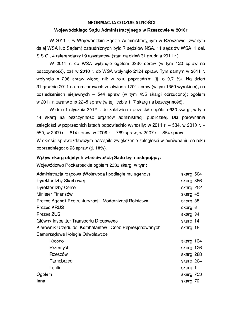 INFORMACJA O DZIAŁALNO CI Wojewódzkiego S du Administracyjnego w Rzeszowie w 2010r W 2011 r. w Wojewódzkim S dzie Administracyjnym w Rzeszowie (zwanym dalej WSA lub S dem) zatrudnionych było 7 s dziów NSA, 11 s dziów WSA, 1 del. S.S.O., 4 referendarzy i 9 asystentów (stan na dzie 31 grudnia 2011 r.). W 2011 r. do WSA wpłyn ło ogółem 2330 spraw (w tym 120 spraw na bezczynno ), za w 2010 r. do WSA wpłyn ło 2124 spraw. Tym samym w 2011 r. wpłyn ło o 206 spraw wi cej ni w roku poprzednim (tj. o 9,7 %). Na dzie 31 grudnia 2011 r. na rozprawach załatwiono 1701 spraw (w tym 1359 wyrokiem), na posiedzeniach niejawnych – 544 spraw (w tym 435 skargi odrzucono); ogółem w 2011 r. załatwiono 2245 spraw (w tej liczbie 117 skarg na bezczynno ). W dniu 1 stycznia 2012 r. do załatwienia pozostało ogółem 630 skargi, w tym 14 skarg na bezczynno organów administracji publicznej. Dla porównania zaległo ci w poprzednich latach odpowiednio wynosiły: w 2011 r. – 534, w 2010 r. – 550, w 2009 r. – 614 spraw, w 2008 r. – 769 spraw, w 2007 r. – 854 spraw. W okresie sprawozdawczym nast piło zwi kszenie zaległo ci w porównaniu do roku poprzedniego: o 96 spraw (tj. 18%). Wpływ skarg obj tych wła ciwo ci S du był nast puj cy: Województwo Podkarpackie ogółem 2330 skarg, w tym: Administracja rz dowa (Wojewoda i podległe mu agendy) Dyrektor Izby Skarbowej Dyrektor Izby Celnej Minister Finansów skarg skarg skarg skarg 504 366 252 45 Prezes Agencji Restrukturyzacji i Modernizacji Rolnictwa Prezes KRUS Prezes ZUS Główny Inspektor Transportu Drogowego Kierownik Urz du ds. Kombatantów i Osób Represjonowanych Samorz dowe Kolegia Odwoławcze Krosno Przemy l Rzeszów Tarnobrzeg Lublin Ogółem Inne skarg skarg skarg skarg skarg 35 6 34 14 18 skarg skarg skarg skarg skarg skarg skarg 134 126 288 204 1 753 72 Skargi wedle kryterium najliczniejszych wpływów wynosiły: 2008 Lp 2009 liczba % 2010 liczba liczba liczba 2011 % liczba % 1. Podatki 601 33,94 522 372 372 17,07 793 35,88 2. Budownictwo 238 13,44 219 243 243 11,15 260 11,76 143 17,40 359 200 200 9,17 322 14,57 3. Pomoc społeczna W okresie sprawozdawczym najwi kszy wpływ odnotowano w sprawach podatkowych (793 sprawy), co stanowi 35,88 % ogólnego wpływu skarg. Ogółem w sprawach samorz dowych wpłyn ło 30 skarg: 5 skarg wniosły jednostki samorz du terytorialnego na rozstrzygni cia organów nadzorczych, za 23 skargi wniesiono na podstawie art. 101 ust. 1 ustawy z dnia 8 marca 1990 r. o samorz dzie gminnym (Dz. U. z 2001 r., Nr 142, poz. 1591), 2 skargi wniesiono na podstawie art. 90 i 91 ustawy z dnia 5 czerwca 1998r. o samorz dzie wojewódzkim (tj. Dz. U. z 2001r., Nr 142, poz. 1590 ze zm.). W porównaniu do 2010 r., wpływ skarg w prezentowanej grupie spraw był mniejszy o 3 skargi. Sposób załatwienia skarg w sprawach samorz dowych na rozprawach był nast puj cy: oddalono –5 uwzgl dniono –4 załatwiono w inny sposób – 1 na posiedzeniach niejawnych załatwiono 9 skarg (9 skarg odrzucono). Skuteczno skarg, w najliczniej wpływaj cych za ostatnie 4 lata w uj ciu procentowym, była nast puj ca: Lp 2008 2009 2010 2011 1. Podatki 9,58 14,23 16,71 12,26 2. Budownictwo 24,89 24.06 23,45 23,1 3. Pomoc społeczna 26,72 27,5 22,98 28,07 Wedle rodzaju organów skuteczno skarg w uj ciu procentowym była nast puj ca (uwzgl dniono sprawy, w których post powania zako czono wyrokiem, pomini to sprawy, w których skarg odrzucono lub post powanie zako czono w inny sposób): Wojewoda Podkarpacki i podległe mu organy administracji rz dowej – 36,85 % Dyrektor Izby Skarbowej – 27,43 % Dyrektor Izby Celnej – 21,79 % Główny Inspektor Transportu Drogowego – 33,33 % Samorz dowe Kolegia Odwoławcze Krosno – 33,33 % Przemy l – 61,70 % Rzeszów – 35,14 % Tarnobrzeg – 28,47 % Lublin wpłyn ła 1 skarga, która została uwzgl dniona Kierownik Urz du ds. Kombatantów i Osób Represjonowanych w Warszawie – 41,17 % Minister Finansów – 45,71 % Prezes Kasy Rolniczego Ubezpieczenia Społecznego – 75,00 % Prezes Zakładu Ubezpiecze Społecznych – 16,66 % Inne organy (tak e podmioty nie b d ce organami administracji) – 62,96 % W 2011r. nie rozpoznano adnej skargi na akty i czynno ci Dyrektora Urz du Kontroli Skarbowej. Dane liczbowe za 2011 r. wskazuj na najwi ksz skuteczno skarg na decyzje Prezesa Kasy Rolniczych Ubezpiecze Społecznych – 75 %, a najmniejsz w przypadku Dyrektora Izby Celnej – 21,79 %. Zdecydowana wi kszo Na ogóln ilo skarg wniesiona została przez osoby fizyczne. 2330 skarg (w tym 120 skarg na bezczynno ) osoby fizyczne wniosły 1728 skargi, tj. 74,16 %. Pozostałe skargi były wnoszone przez: ♦ osoby prawne – 492 ♦ organizacje społeczne i stowarzyszenia – 30 ♦ prokuratora – 44 Udział w post powaniu przedstawiał si nast puj co: ♦ pełnomocnicy administracji pa stwowej – 737 ♦ adwokaci jako pełnomocnicy skar – 168 cych i uczestników ♦ radcowie prawni jako pełnomocnicy skar cych i uczestników – 296 ♦ doradcy podatkowi – 107 ♦ rzecznicy patentowi –0 ♦ prokuratorzy: Prokurator Rejonowy dla Miasta Rzeszowa –1 W 2011 roku Rzecznik Praw Obywatelskich nie wniósł adnej skargi i nie brał udziału w jakiejkolwiek sprawie. W 2011 roku nie załatwiono adnej sprawy w post powaniu mediacyjnym. Je li chodzi o tryb uproszczony, zastosowano go w 16 przypadkach, przy czym dotyczyło to sytuacji obj tych dyspozycj art. 119 pkt 1 ustawy z dnia 30 sierpnia 2002 r. – Prawo o post powaniu przed s dami administracyjnymi (Dz. U. nr 153, poz. 1270, ze zm., zwan dalej P.p.s.a.), gdzie S d skierował spraw do rozpoznania w tym trybie. Natomiast przy wniosku strony o rozpoznanie sprawy w trybie uproszczonym (wniosek taki składał głównie Kierownik Urz du do Spraw Kombatantów i Osób Represjonowanych w Warszawie oraz Pa stwowy Wojewódzki Inspektor Sanitarny) rozpoznano 11 skarg. W pozostałych wypadkach, na skutek dania strony, sprawy skierowane były na rozprawy. W mini