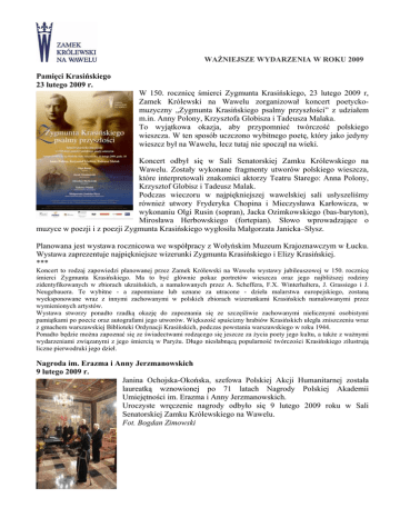 WAŻNIEJSZE WYDARZENIA W ROKU 2009 Pamięci Krasińskiego 23 lutego 2009 r. W 150. rocznicę śmierci Zygmunta Krasińskiego, 23 lutego 2009 r, Zamek Królewski na Wawelu zorganizował koncert poetyckomuzyczny „Zygmunta Krasińskiego psalmy przyszłości” z udziałem m.in. Anny Polony, Krzysztofa Globisza i Tadeusza Malaka. To wyjątkowa okazja, aby przypomnieć twórczość polskiego wieszcza. W ten sposób uczczono wybitnego poetę, który jako jedyny wieszcz był na Wawelu, lecz tutaj nie spoczął na wieki. Koncert odbył się w Sali Senatorskiej Zamku Królewskiego na Wawelu. Zostały wykonane fragmenty utworów polskiego wieszcza, które interpretowali znakomici aktorzy Teatru Starego: Anna Polony, Krzysztof Globisz i Tadeusz Malak. Podczas wieczoru w najpiękniejszej wawelskiej sali usłyszeliśmy również utwory Fryderyka Chopina i Mieczysława Karłowicza, w wykonaniu Olgi Rusin (sopran), Jacka Ozimkowskiego (bas-baryton), Mirosława Herbowskiego (fortepian). Słowo wprowadzające o muzyce w poezji i z poezji Zygmunta Krasińskiego wygłosiła Małgorzata Janicka–Słysz. Planowana jest wystawa rocznicowa we współpracy z Wołyńskim Muzeum Krajoznawczym w Łucku. Wystawa zaprezentuje najpiękniejsze wizerunki Zygmunta Krasińskiego i Elizy Krasińskiej. *** Koncert to rodzaj zapowiedzi planowanej przez Zamek Królewski na Wawelu wystawy jubileuszowej w 150. rocznicę śmierci Zygmunta Krasińskiego. Ma to być głównie pokaz portretów wieszcza oraz jego najbliższej rodziny zidentyfikowanych w zbiorach ukraińskich, a namalowanych przez A. Scheffera, F.X. Winterhaltera, J. Grassiego i J. Neugebauera. Te wybitne - a zapomniane lub uznane za utracone - dzieła malarstwa europejskiego, zostaną wyeksponowane wraz z innymi zachowanymi w polskich zbiorach wizerunkami Krasińskich namalowanymi przez wymienionych artystów. Wystawa stworzy ponadto rzadką okazję do zapoznania się ze szczęśliwie zachowanymi nielicznymi osobistymi pamiątkami po poecie oraz autografami jego utworów. Większość spuścizny hrabiów Krasińskich uległa zniszczeniu wraz z gmachem warszawskiej Biblioteki Ordynacji Krasińskich, podczas powstania warszawskiego w roku 1944. Ponadto będzie można zapoznać się ze świadectwami rodzącego się jeszcze za życia poety jego kultu, a także z ważnymi wydarzeniami związanymi z jego śmiercią w Paryżu. Długo niesłabnącą popularność twórczości Krasińskiego zilustrują liczne pierwodruki jego dzieł. Nagroda im. Erazma i Anny Jerzmanowskich 9 lutego 2009 r. Janina Ochojska-Okońska, szefowa Polskiej Akcji Humanitarnej została laureatką wznowionej po 71 latach Nagrody Polskiej Akademii Umiejętności im. Erazma i Anny Jerzmanowskich. Uroczyste wręczenie nagrody odbyło się 9 lutego 2009 roku w Sali Senatorskiej Zamku Królewskiego na Wawelu. Fot. Bogdan Zimowski WAŻNIEJSZE WYDARZENIA W ROKU 2009 Dyrektor Zamku nagrodzony Dyrektor Zamku Królewskiego na Wawelu, prof. Jan K. Ostrowski, został uhonorowany nagrodą im. Aleksandra Gieysztora. Od 2000 r. nagroda ta przyznawana jest za osiągnięcia w ochronie polskiego dziedzictwa kulturowego. Kapituła, pod przewodnictwem prof. Andrzeja Rottermunda, nagrodziła prof. Ostrowskiego za pracę nad opublikowaniem (w latach 1993-2008) 16 tomów "Materiałów do dziejów sztuki sakralnej na ziemiach wschodnich dawnej Rzeczypospolitej". W publikacjach zawarte są 436 opracowania zabytków z terenu d. województwa ruskiego (lwowskiego), przygotowane przez 30 autorów, pod redakcją i ze znacznym udziałem autorskim prof. Jana K. Ostrowskiego. Więcej o nagrodzie, fundatorze www.citibank.pl/poland/kronenberg i laureatach poprzednich edycji można przeczytać na stronie: Otwarcie nowej pracowni konserwacji mebli i magazynów muzealnych 10 marca 2009 r. o godz. 12 w Zamku Królewskim na Wawelu odbyła się prezentacja nowej pracowni konserwacji mebli i magazynów muzealnych. Zamek Królewski na Wawelu przez dziesięciolecia cierpiał na brak nowoczesnej powierzchni magazynowej, a pracownie konserwatorskie nie miały właściwych warunków pracy. Stopniowo, w latach 1998-2003, wygospodarowano nowe pomieszczenia dla pracowni konserwacji tkanin zabytkowych, malarstwa i rzeźby, papieru oraz rzemiosła artystycznego, które zostały zmodernizowane i wyposażone zgodnie z aktualnymi potrzebami i przepisami. W latach 2003-2004 zmodernizowano magazyn tkanin, który uzyskał rozwiązania optymalne z punktu widzenia warunków przechowania i dostępu do zabytków. W roku 2004 wykonano nowoczesny magazyn biblioteki, zapewniający jej rozwój na kilkadziesiąt lat. Kolejnym etapem modernizacji i rozbudowy infrastruktury muzealnej stała się adaptacja ryzalitu południowego budynku nr 5 na potrzeby pracowni konserwacji mebli oraz magazynów muzealnych. Ta część budowli została wzniesiona niemal od nowa w czasie okupacji niemieckiej, prawdopodobnie z przeznaczeniem na organizowanie uroczystości partyjnych. Na I piętrze znajdowały się trzy ogromne sale o wysokości dwóch kondygnacji, bardzo trudne do wykorzystania dla celów muzealnych. Ryzalit nigdy nie został w pełni ukończony, a jego stan przez dziesięciolecia pogarszał się, pomimo próby urządzenia w nim Muzeum Historii Wawelu (w latach 50. XX w.) oraz z powodu naruszenia jego statyki przez wykopy archeologiczne. Kompleksowy plan rewaloryzacji ryzalitu zakładał: 1. zapewnienie budynkowi bezpieczeństwa statycznego, 2. uporządkowanie nieukończonych i zdewastowanych elewacji, 3. uzyskanie około 570 m2 nowej powierzchni użytkowej dla pracowni konserwacji mebli i magazynów muzealnych. Odpowiedni projekt został sporządzony w roku 2004. Po uzyskaniu pozwolenia na budowę podjęto starania o dofinansowanie z funduszu ZPORR. Pomimo pozytywnej oceny projektu (skierowanego do Departament Funduszy Europejskich w Urzędzie Marszałkowskim województwa małopolskiego), dotacja jednak nie została przyznana. W tych warunkach Dyrekcja Zamku Królews