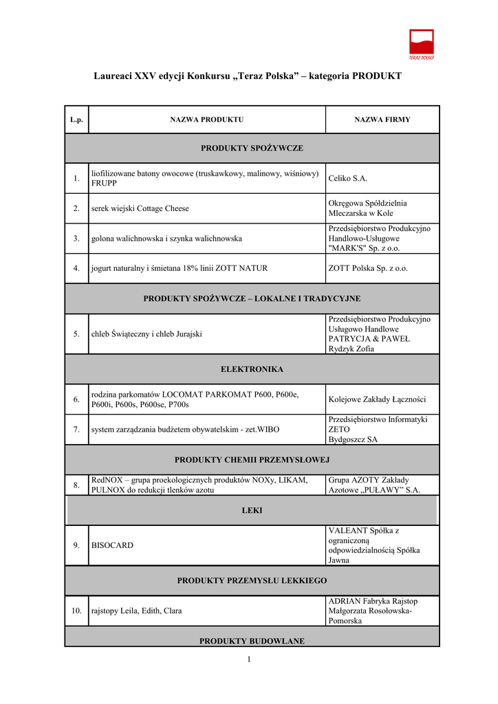 Laureaci XXV edycji Konkursu „Teraz Polska” – kategoria PRODUKT L.p. NAZWA PRODUKTU NAZWA FIRMY PRODUKTY SPOŻYWCZE 1. liofilizowane batony owocowe (truskawkowy, malinowy, wiśniowy) FRUPP Celiko S.A. 2. serek wiejski Cottage Cheese Okręgowa Spółdzielnia Mleczarska w Kole 3. golona walichnowska i szynka walichnowska Przedsiębiorstwo Produkcyjno Handlowo-Usługowe "MARK'S" Sp. z o.o. 4. jogurt naturalny i śmietana 18% linii ZOTT NATUR ZOTT Polska Sp. z o.o. PRODUKTY SPOŻYWCZE – LOKALNE I TRADYCYJNE 5. Przedsiębiorstwo Produkcyjno Usługowo Handlowe PATRYCJA & PAWEŁ Rydzyk Zofia chleb Świąteczny i chleb Jurajski ELEKTRONIKA 6. rodzina parkomatów LOCOMAT PARKOMAT P600, P600e, P600i, P600s, P600se, P700s Kolejowe Zakłady Łączności 7. system zarządzania budżetem obywatelskim - zet.WIBO Przedsiębiorstwo Informatyki ZETO Bydgoszcz SA PRODUKTY CHEMII PRZEMYSŁOWEJ 8. RedNOX – grupa proekologicznych produktów NOXy, LIKAM, PULNOX do redukcji tlenków azotu Grupa AZOTY Zakłady Azotowe „PUŁAWY” S.A. LEKI 9. VALEANT Spółka z ograniczoną odpowiedzialnością Spółka Jawna BISOCARD PRODUKTY PRZEMYSŁU LEKKIEGO 10. ADRIAN Fabryka Rajstop Małgorzata RosołowskaPomorska rajstopy Leila, Edith, Clara PRODUKTY BUDOWLANE 1 11. SILTEN TERBUD Sp. z o.o. Sp.k. zaprawy renowacyjne SILTEN RENO SZKŁO I CERAMIKA 12. Kreacje Grupy Tubądzin – Kolekcje Inspirowane Tubądzin Management Group Sp. z o.o. Światowymi Metropoliami MASZYNY I URZĄDZENIA 13. automatyczne kotły na pellet SIGMA EKOPELL Przedsiębiorstwo Wielobranżowe DEFRO Robert Dziubeła 14. pilarki modułowe REMA FX-N REMA Spółka Akcyjna WYDAWNICTWA 15. działalność o charakterze edukacyjnym, kulturalnym, społecznym na przykładzie albumu Jan Paweł II na znaczkach Poczty Polskiej Poczta Polska SA Laureaci i wyróżnieni XXV edycji Konkursu „Teraz Polska” – kategoria USŁUGI Lp. NAZWA USŁUGI NAZWA FIRMY USŁUGI HANDLOWE 1. polska sieć kin wielosalowych - projekcja filmów HELIOS Spółka Akcyjna 2. wynajem powierzchni eventowych, organizacja oraz współpraca przy organizacji eventów PL2012+ Sp. z o.o. 3. wynajem powierzchni handlowych Warszawski RolnoSpożywczy Rynek Hurtowy SA w Broniszach USŁUGI BUDOWLANE 4. kompleksowe wykonawstwo obiektów inżynieryjnych oraz wytwarzanie i montaż konstrukcji stalowych 2 Przedsiębiorstwo Wielobranżowe BANIMEX Sp. z o.o. USŁUGI MEDYCZNE 5. kompleksowa opieka medyczna stacjonarna i domowa BETAMED S.A. POZOSTAŁE USŁUGI 6. stałe udostępnianie i zapewnianie aktualnej bazy opisów produktów leczniczych oraz interakcji lekowych wzbogaconych o alerty bezpieczeństwa ich stosowania PHARMINDEX® BAZA PHARMINDEX Poland Sp. z o.o. WYRÓŻNIENIA TERAZ POLSKA 1. działalność związana z organizacją targów obejmująca działalność promocyjną na rzecz polskich eksporterów, organizację i realizację zagranicznych wystąpień targowych ELTAR Tęsna Elżbieta 2. kształcenie zawodowe dekarzy i blacharzy dachowych Polskie Stowarzyszenie Dekarzy Laureaci VIII edycji Konkursu „Teraz Polska” - kategoria PRZEDSIĘWIĘCIA INNOWACYJNE Lp. NAZWA INNOWACJI INSTYTUT / FIRMA 1. „CyberOko” - metoda oraz technologia do diagnozowania i stymulowania pacjentów z ciężkimi urazami mózgu Politechnika Gdańska, Wydział ETI, Katedra Systemów Multimedialnych 2. inteligentny system samodzielnie zarządzający produkcją - IPOsystem UIBS Teamwork sp. z o.o. Laureaci IX edycji Konkursu „Teraz Polska” dla Gmin Lp. NAZWA GMINY 1. Mielec 2. Świdnica 3
