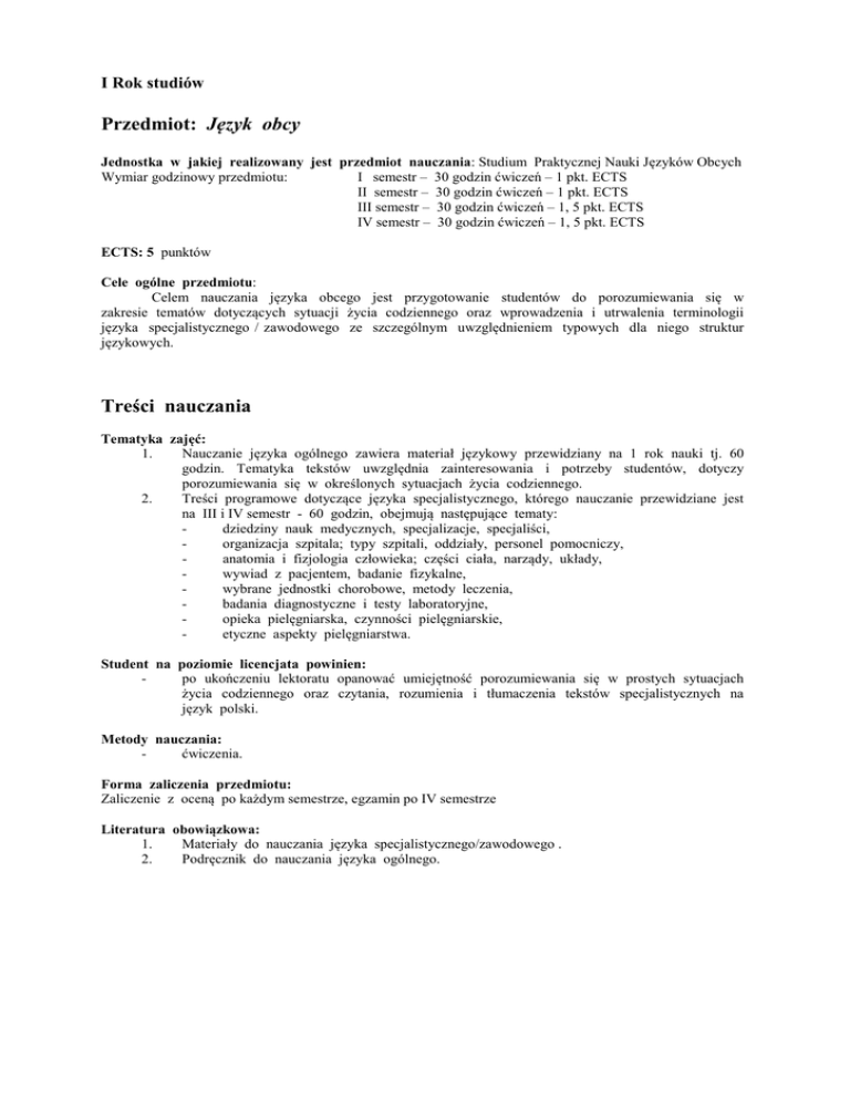 I semestr - 30 godzin ćwiczeń – 1 pkt. ECTS