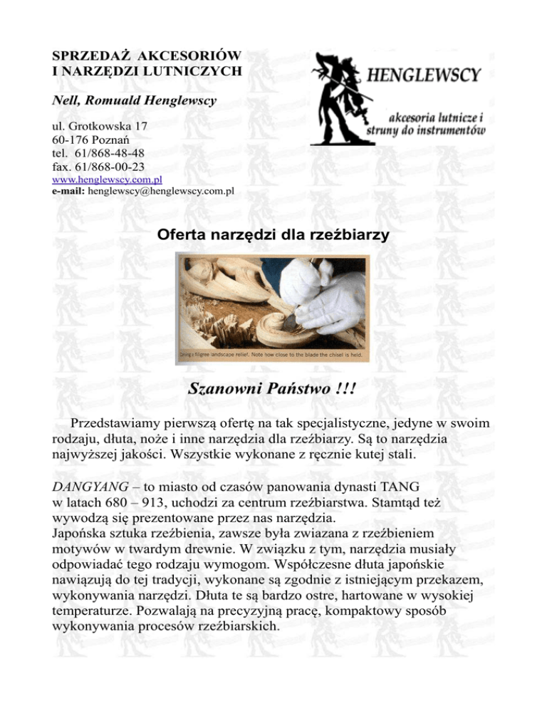 SPRZEDAŻ AKCESORIÓW I NARZĘDZI LUTNICZYCH Nell, Romuald Henglewscy ul. Grotkowska 17 60-176 Poznań tel. 61/868-48-48 fax. 61/868-00-23 www.henglewscy.com.pl e-mail: [email protected] Oferta narzędzi dla rzeźbiarzy Szanowni Państwo !!! Przedstawiamy pierwszą ofertę na tak specjalistyczne, jedyne w swoim rodzaju, dłuta, noże i inne narzędzia dla rzeźbiarzy. Są to narzędzia najwyższej jakości. Wszystkie wykonane z ręcznie kutej stali. DANGYANG – to miasto od czasów panowania dynasti TANG w latach 680 – 913, uchodzi za centrum rzeźbiarstwa. Stamtąd też wywodzą się prezentowane przez nas narzędzia. Japońska sztuka rzeźbienia, zawsze była zwiazana z rzeźbieniem motywów w twardym drewnie. W związku z tym, narzędzia musiały odpowiadać tego rodzaju wymogom. Współczesne dłuta japońskie nawiązują do tej tradycji, wykonane są zgodnie z istniejącym przekazem, wykonywania narzędzi. Dłuta te są bardzo ostre, hartowane w wysokiej temperaturze. Pozwalają na precyzyjną pracę, kompaktowy sposób wykonywania procesów rzeźbiarskich. Narzędzia przeznaczone są dla specjalistów, jak i dla miłośników, amatorów rzeźby. Zapraszamy do zapoznania się z asortymentem i skorzystania z przedstawionej oferty !!! Japońskie dłuta do rzeźbienia I: 6470 Zestaw 10 dłut w pudełku drewnianym długość ostrza 20-50mm, długość całkowita dłuta 205-215mm CENA : 526,76€ brutto / 2 265,07 PLN brutto dłuta o wymiarach : 5/15mm 9/9mm 6/6mm 6mm gekröpft/15mm 15mm wąski czubek 12mm płaski 12mm Yari Kanna 9mm 7,5mm kształt litery V gekröpft płaski Japońskie dłuta do rzeźbienia Zestaw 7 dłut o profilu stich 7 zawiera: CENA za sztukę : 6mm - 22,37€ brutto 9mm - 22,37€ brutto 12mm - 22,37€ brutto 15mm - 22,37€ brutto 18mm - 22,37€ brutto 21mm - 24,08€ brutto 24mm - 24,08€ brutto / 96,19 PLN brutto / 96,19 PLN brutto / 96,19 PLN brutto / 96,19 PLN brutto / 96,19 PLN brutto / 103,54 PLN brutto / 103,54 PLN brutto Ostrza do rzeźbienia I: 6494 Zestaw 18 ostrzy bez uchwytów CENA : 65, 00€ brutto / 279,50 PLN brutto Dłuta - narzędzia do rzeźbienia Zestaw 12 dłut Szerokość ostrza 5 – 20mm Długość całkowita 180-210mm CENA : 138,84€ brutto / 597,01 PLN brutto Ostrza do rzeźbienia Zestaw 18 ostrzy bez uchwytów CENA : 99, 13€ brutto / 426,26 PLN brutto I: 6937 Dłuta - narzędzia do rzeźbienia I: 6326 Zestaw 6 dłut Szerokość ostrza 6 – 18mm Długość całkowita 180-210mm CENA : 75,00€ brutto / 322,50 PLN brutto Dłuta - narzędzia do rzeźbienia Zestaw 12 dłut Szerokość ostrza 6 – 25mm Długość całkowita 180-210mm CENA : 142,75€ brutto / 613,83 PLN brutto I: 6327 Noże Hiro Hiro czołowy producent japońskich noży służących do prac rzeźbiarskich i wykonywania reliefów. Ostrza wykonane są z masywnej stali węglowej, hartowanej ok. 62 rockwell. Uchwyty wykonane z drewna TEAK. Zestaw noży do rzeźbienia - Typ japoński I: 6614 Zestaw 9 noży CENA : 236,91€ brutto / 1 018,71 PLN brutto Noże do rzeźbienia - Typ japoński CENA za sztukę : 25,40€ brutto / 109,22 PLN brutto Noże do rzeźbienia - Typ japoński CENA za sztukę : 22,37€ brutto / 96,19 PLN brutto Zapraszamy do skorzystania z naszej oferty oraz na naszą stronę internetową !!!! www.henglewscy.com.pl Z pozdrowieniami Firma Henglewscy ul. Grotkowska 17 60-176 Poznań tel. 61/868-48-48; 61/868-98-25 fax. 61/868-00-23 e-mail: [email protected]