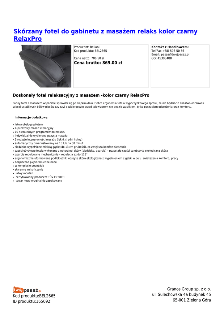 Skórzany fotel do gabinetu z masażem relaks kolor czarny RelaxPro Producent: Beliani Kod produktu: BEL2665 Cena netto: 706,50 zł Kontakt z Handlowcem: Tel/Fax: (68) 506 50 56 Email: [email protected] GG: 45303488 Cena brutto: 869.00 zł Doskonały fotel relaksacyjny z masażem -kolor czarny RelaxPro Ładny fotel z masażem wspaniale sprawdzi się po ciężkim dniu. Dobra ergonomia fotela wypoczynkowego sprawi, że nie będziecie Państwo odczuwali więcej uciążliwych bólów pleców czy szyi a wiele godzin przed telewizorem nie będzie wysiłkiem, tylko poczuciem odprężenia oraz komfortu. Informacje dodatkowe: ● ● ● ● ● ● ● ● ● ● ● ● ● ● ● ● łatwa obsługa pilotem 4-punktowy masaż wibracyjny 10 niezależnych programów do masażu indywidualnie wybierana pozycja masażu 3 rodzaje intensywności masażu (lekki, średni i silny) automatyczny timer ustawiany na 15 lub na 30 minut siedzisko wypełnione miękką gąbką(do 13 cm grubości), co zwiększa komfort siedzenia części użytkowe fotela wykonane z naturalnej skóry (siedzisko, oparcie) – pozostałe części są obszyte ekologiczną skóra oparcie regulowane mechanicznie – regulacja aż do 115° ergonomicznie uformowane podłokietniki obszyte skóra ekologiczna z wypełnieniem z gąbki w celu zwiększenia komfortu pracy bezpieczne pięcioramienne nóżki w komplecie podnóżek staranne wykończenie łatwy montaż certyfikowany producent TÜV ISO9001 towar nowy oryginalnie zapakowany Kod produktu:BEL2665 ID produktu:165092 Granos Group sp. z o.o. ul. Sulechowska 4a budynek 45 65-001 Zielona Góra