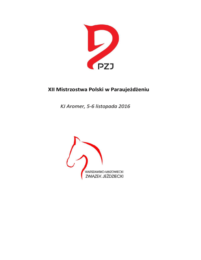 XII Mistrzostwa Polski w Paraujeżdżeniu KJ Aromer, 5-6 listopada 2016 I. INFORMACJE OGÓLNE 1. Typ zawodów Ranga zawodów: Kategoria wiekowa: Data : Miejsce: MP-PA, SENIORZY, JUNIORZY 5-6.11.2016 KJ Aromer, ul. Stołeczna 250 05-074 Halinów 2. Organizator Nazwa: KJ Aromer ul. Stołeczna 250 05-074 Halinów www.aromer.pl 3. Komitet Organizacyjny: Dyrektor Zawodów: Biuro Zawodów: Łukasz Sikorski Agnieszka Kopka II. OSOBY OFICJALNE 1. Komisja Sędziowska: Krzysztof Tomaszewski - Sędzia Główny: Sędziowie: Beata Libera Magdalena Jarmuła Wojciech Dąbrowski Bartosz Jura 2. Klasyfikator: Anna Grześkowiak 609 068 929 3. Lekarz zawodów Małgorzata Świderek-Baran III. WARUNKI TECHNICZNE 1. Program zawodów: Mistrzostwa Polski Data Otwarcie stajni 4.11.2016 Godzina 14.00 Zebranie techniczne 4.11.2016 19.00 Trening oficjalny 4.11.2016 17.00-20.00 Mistrzostwa Polski Grupa A, Grupa B Poziom Kategoria Sobota, 5.11.2016 Godz. 8:00 GRUPA B Sobota, 5.11.2016 Godz. 8:00 GRUPA A Niedziela, 6.11.2016 Godz. 8:00 GRUPA B Niedziela, 6.11.2016 Godz: 8:00 GRUPA A Ia Senior Program Novice Program Mistrzowski Program Novice Program Dowolny Ib Senior Program Novice Program Mistrzowski Program Novice Program Dowolny II Senior Program Novice Program Mistrzowski Program Novice Program Dowolny III Senior Program Novice Program Mistrzowski Program Novice Program Dowolny IV Senior Program Novice Program Mistrzowski Program Novice Program Dowolny Ia Junior Program Novice Program Novice Program Novice Program Dowolny Ib Junior Program Novice Program Novice Program Novice Program Dowolny II Junior Program Novice Program Novice Program Novice Program Dowolny III Junior Program Novice Program Novice Program Novice Program Dowolny IV Junior Program Novice Program Novice Program Novice Program Dowolny Konkursy poziomu III i IV kategorii Senior (Mistrzowski, Dowolny) rozgrywane będą na czworoboku 20x60m. Konkursy dowolne poziomu III i IV kategorii Junior rozgrywane będą na czworoboku zgodnie ze wskazaniem zawodnika w zgłoszeniu. Wszystkie konkursy odbywać się będą na hali. Podane godziny mogą ulec zmianie. IV. WARUNKI UCZESTNICTWA 1. Warunki uczestnictwa Zawody zostaną rozegrane zgodnie z aktualnymi przepisami i regulaminami dyscypliny paraujeżdżenia oraz pozostałymi przepisami PZJ. W zawodach mogą brać udział zawodnicy niepełnosprawni w wieku od 10 lat. Zawodnicy będą startowali w dwóch grupach: • Grupa A: zawodnicy startują na poziomie zgodnym z przyznaną klasyfikacją. • Grupa B: zawodnicy startujący poniżej przyznanego poziomu klasyfikacyjnego oraz zawodnicy bez klasyfikacji – w przypadku grupy B to zawodnik/trener określa poziom startowy na dane zawody. Zawodnicy startują na własnych koniach. Wszystkich obowiązują numery startowe dla koni (prosimy przywieźć własne numery). Na jednym koniu może startować więcej niż jeden zawodnik – zgodnie z regulaminem dyscypliny. W przypadku dzielenia koni - należy pamiętać o zmianie numeru wraz ze zmianą zawodnika. Limity dziennego startu koni zgodnie z regulaminem dyscypliny. Minimalny wiek koni: Grupa A – 6 lat, Grupa B – 5 lat 2. Dokumentacja uczestników Dokumentacja zawodników i koni zgodnie z wymogami dyscypliny Zawodnicy: Ważne badania lekarskie sportowe, karta klasyfikacyjna lub ksero protokołu klasyfikacyjnego. Zawodnicy niesklasyfikowani startować mogą wyłącznie w grupie B. Zawodnicy niepełnoletni –zgoda rodziców lub opiekunów ustawowych na udział w zawodach. Konie: Paszport PZJ lub PZHK z aktualnymi szczepieniami. 3. Zgłoszenia Zgłoszenia wstępne Data: 30.10.2016 Zgłoszenia ostateczne Data: 3.11.2016 Zgłoszenia prosimy wysyłać na adres: [email protected] Zgłoszenia jedynie na drukach paraujeżdżenia: do pobrania na stronie www.paraklasyfikacja.pl oraz www.hippoland.pl 4. Warunki finansowe Boksy dla koni: Wpisowe: od dnia 4.11 na koszt organizatora, istnieje możliwość wcześniejszego przyjazdu za dodatkową opłatą 50zł za dzień 0 zł V. Nagrody Organizator zapewnia wstęgi honorowe (flots), medale i puchary. VI. OFEROWANE ŚWIADCZENIA Organizator pokrywa koszty: boksów dla koni od dnia 4.11.2016 zakwaterowania zawodnika i jednej osoby towarzyszącej na terenie KJ Aromer od dnia 4.11.2016; Inne osoby towarzyszące zawodnikowi będą kwaterowane na terenie zawodów w miarę możliwości i na koszt własny obiadów dla zawodnika i jednej osoby towarzyszącej w trakcie zawodów Przez cały czas trwania zawodów na terenie zawodów będzie czynna restauracja. Obrządek (karmienie, sprzątanie itp.) przez cały czas trwania imprezy we własnym zakresie. VII. INNE 1. OGRANICZENIE ODPOWIEDZIALNOŚCI Organizator nie odpowiada za wypadki, szkody i kradzieże powstałe w trakcie zawodów. Komitet Organizacyjny nie ponosi żadnej odpowiedzialności w razie wypadków i zachorowań trenera, zawodników, luzaków i koni, jak również w przypadku kradzieży, zniszczeń, pożarów i innych wydarzeń. Zawodnicy i właściciele odpowiadają osobiście za zniszczenia w stosunku do osób trzecich, spowodowane przez nich samych, ich pracowników lub ich konie. Dlatego zalecane jest zawarcie stosownego pełnego ubezpieczenia na czas udziału w zawodach. 2. Sprawy weterynaryjne Szczepienia ochronne przeciwko grypie koni. Obowiązuje następujący schemat szczepień: szczepienie podstawowe: • pierwsze szczepienie – w dniu rozpoczęcia szczepień • drugie szczepienie – nie wcześniej niż 21-go dnia i nie później niż 92 dnia od pierwszego szczepienia. szczepienie przypominające: • • co 6 miesięcy od ostatniego szczepienia (jest dopuszczalny 21 dniowy okres karencji); żadne szczepienie przypominające nie może się odbyć później niż na 7 dni przed przybyciem na zawody L.p. Funkcja Imię i nazwisko Telefon 1. Powiatowy lekarz wet. Cezary Bogusz (25) 758 50 59 2. Lekarz weterynarii zawodów Małgorzata Świderek-Baran 604 557 202 VIII. KODEKS POSTĘPOWANIA Z KONIEM I. Polski Związek Jeź