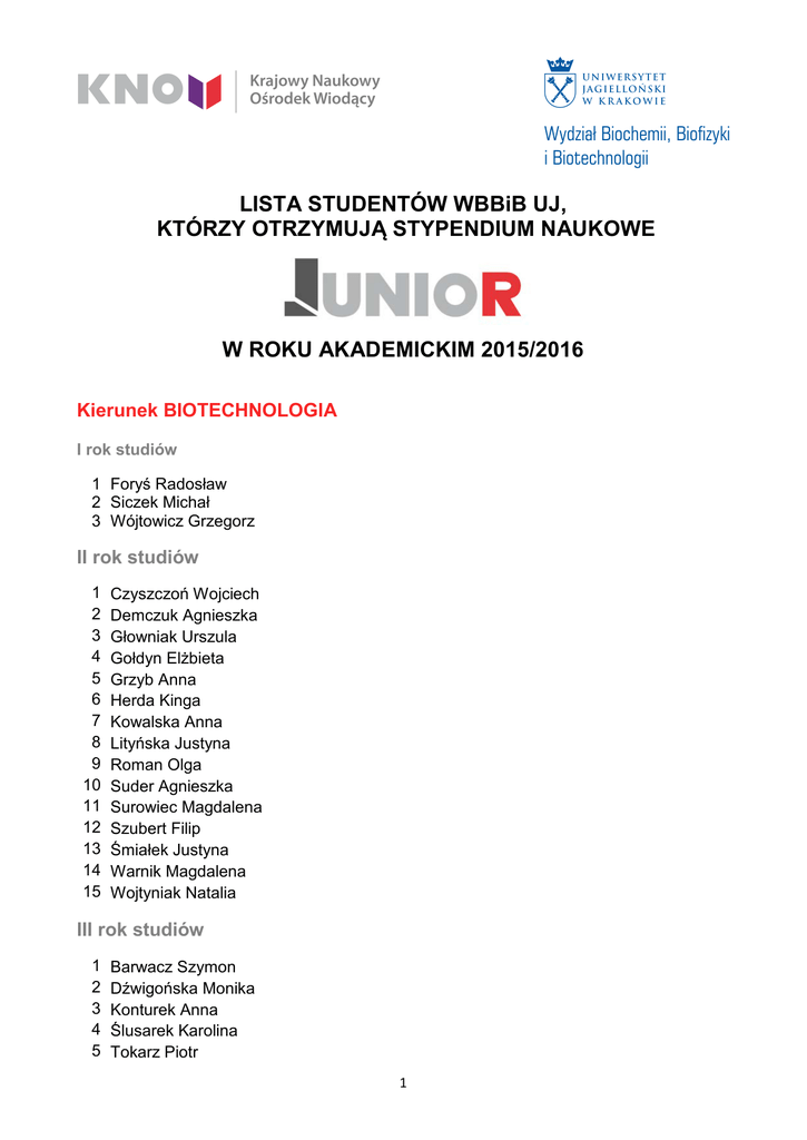 LISTA STUDENTÓW WBBiB UJ, KTÓRZY OTRZYMUJĄ STYPENDIUM NAUKOWE W ROKU AKADEMICKIM 2015/2016 Kierunek BIOTECHNOLOGIA I rok studiów 1 Foryś Radosław 2 Siczek Michał 3 Wójtowicz Grzegorz II rok studiów 1 2 3 4 5 6 7 8 9 10 11 12 13 14 15 Czyszczoń Wojciech Demczuk Agnieszka Głowniak Urszula Gołdyn Elżbieta Grzyb Anna Herda Kinga Kowalska Anna Lityńska Justyna Roman Olga Suder Agnieszka Surowiec Magdalena Szubert Filip Śmiałek Justyna Warnik Magdalena Wojtyniak Natalia III rok studiów 1 2 3 4 5 Barwacz Szymon Dźwigońska Monika Konturek Anna Ślusarek Karolina Tokarz Piotr 1 Kierunek BIOFIZYKA II rok studiów 1 Kusiak Agnieszka 2 Kurleto Damian 3 Mielecki Bohun III rok studiów 1 Mularczyk Dorota Kierunek BIOCHEMIA I rok studiów 1 2 3 4 Kanoza Michał Kumorek Alina Pudełek Maciej Wiatrzyk Małgorzata II rok studiów 1 2 3 4 5 6 7 8 9 10 Gołębiowska Katarzyna Jurczak Joanna Kiel Klaudia Lipiński Oskar Mazur Jarosław Ostapczuk Weronika Pajdzik Kinga Stanclik Szymon Stopa Kinga Wasilewska Martyna III rok studiów 1 2 3 4 5 6 Dolicka Dobrochna Duraczyńska Natalia Kalita Agata Piwowarczyk Rafał Seretny Agnieszka Wielento Aleksandra 2