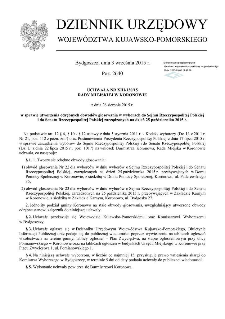 DZIENNIK URZĘDOWY WOJEWÓDZTWA KUJAWSKO-POMORSKIEGO Bydgoszcz, dnia 3 września 2015 r. Elektronicznie podpisany przez: Ewa Mes; Kujawsko-Pomorski Urząd Wojewódzki w Bydgoszcz Poz. 2640 Data: 2015-09-03 14:42:16 UCHWAŁA NR XIII/120/15 RADY MIEJSKIEJ W KORONOWIE z dnia 26 sierpnia 2015 r. w sprawie utworzenia odrębnych obwodów głosowania w wyborach do Sejmu Rzeczypospolitej Polskiej i do Senatu Rzeczypospolitej Polskiej zarządzonych na dzień 25 października 2015 r. Na podstawie art. 12 § 4, § 10 - § 12 ustawy z dnia 5 stycznia 2011 r. - Kodeks wyborczy (Dz. U. z 2011 r. Nr 21, poz. 112 z późn. zm1) oraz Postanowienia Prezydenta Rzeczypospolitej Polskiej z dnia 17 lipca 2015 r. w sprawie zarządzenia wyborów do Sejmu Rzeczypospolitej Polskiej i do Senatu Rzeczypospolitej Polskiej (Dz. U. z dnia 22 lipca 2015 r., poz. 1017) na wniosek Burmistrza Koronowa, Rada Miejska w Koronowie uchwala, co następuje: § 1. 1. Tworzy się odrębne obwody głosowania: 1) obwód głosowania Nr 22 dla wyborców w dniu wyborów o Sejmu Rzeczypospolitej Polskiej i do Senatu Rzeczypospolitej Polskiej, zarządzonych na dzień 25 października 2015 r. przebywających w Domu Pomocy Społecznej w Koronowie, z siedzibą w Domu Pomocy Społecznej, Koronowo, ul. Paderewskiego 35; 2) obwód głosowania Nr 23 dla wyborców w dniu wyborów o Sejmu Rzeczypospolitej Polskiej i do Senatu Rzeczypospolitej Polskiej, zarządzonych na 25 paździenika 2015 r. przebywających w Zakładzie Karnym w Koronowie, z siedzibą w Zakładzie Karnym, Koronowo, ul. Bydgoska 27. 2. Jednolity podział gminy Koronowo na stałe obwody głosowania, uwzględniający utworzone obwody odrębne stanowi załącznik do niniejszej uchwały. § 2. Uchwałę przekazuje się Wojewodzie Kujawsko-Pomorskiemu oraz Komisarzowi Wyborczemu w Bydgoszczy. § 3. Uchwałę ogłasza się w Dzienniku Urzędowym Województwa Kujawsko-Pomorskiego, Biuletynie Informacji Publicznej oraz podaje się do publicznej wiadomości poprzez wywieszenie na tablicach ogłoszeń w sołectwach na terenie gminy, tablicy ogłoszeń - Plac Zwycięstwa, na słupie ogłoszeniowym przy ulicy Pomianowskiego w Koronowie oraz na tablicach ogłoszeń w budynkach Urzędu Miejskiego w Koronowie przy Placu Zwycięstwa 1, ul. Pomianowskiego 1. § 4. Na niniejszą uchwałę wyborcom, w liczbie co najmniej 15, przysługuje prawo wniesienia skargi do Komisarza Wyborczego w Bydgoszczy, w terminie 5 dni od daty podania uchwały do publicznej wiadomości. § 5. Wykonanie uchwały powierza się Burmistrzowi Koronowa. Dziennik Urzędowy Województwa Kujawsko-Pomorskiego –2– Poz. 2640 _______________________________________________________________________________________________________________ § 6. Uchwała wchodzi w życie z dniem podjęcia. Przewodniczący Rady Miejskiej w Koronowie Włodzimierz Domek 1] Zmiany wymienionej ustawy zostały ogłoszone w Dz. U. z 2011 r. Nr 26, poz. 134, Nr 94, poz. 550, Nr 102, poz. 588, Nr 134, poz. 777, Nr 147, poz. 881, Nr 149, poz. 889, Nr 171, poz. 1016 i Nr 217, poz. 1281, z 2012 r. poz. 849, 951 i 1529, z 2014 r. poz.179, 180, 1072 oraz z 2015 r. poz. 1043, 1044 Dziennik Urzędowy Województwa Kujawsko-Pomorskiego –3– Poz. 2640 _______________________________________________________________________________________________________________ Załącznik do Uchwały Nr XIII/120/15 Rady Miejskiej w Koronowie z dnia 26 sierpnia 2015 r. Podział Gminy Koronowo na stałe i odrębne obwody głosowania Numer obwodu głosowania 1 Granice obwodu głosowania Miasto Koronowo ulice: Bydgoska, Kasprzaka, Klasztorna, Kościuszki, Krasickiego, Krzyżowa, Nakielska, Nowodworska, Podgórna, Poprzeczna, Promenady, Szkolna, Ślusarska, Władysława Łokietka, Wodna 2 Miasto Koronowo ulice: Biwakowa, Boczna, Droga do Różanny, Farna, Garncarska, Gołębia, Iwickowo, Jachtowa, Jagodowa, Jana Sobieskiego, Janowo, Jaskółcza, Jastrzębia, Jeżynowa, Leśna, Lipinki, Okrzei, Orla, Paderewskiego, Plac Zwycięstwa, Podwórzowa, Poziomkowa, Przyrzecze, Ptasia, Romanowo, Sawickiej, Sienkiewicza, Spichlerzowa, Srebrnica, Staromiejska, Tucholska, Wąska, Wąskotorowa, Zdrojowa, Żurawia 3 Miasto Koronowo ulice: Aleje Wolności, Dworcowa, Kolejowa, Kwiatowa, Liliowa, Ogrodowa, Przemysłowa Różana, Szosa Kotomierska od nr 1 do 8 4 Miasto Koronowo ulice: 26 Stycznia, Alfonsa Hoffmanna, Brzegowa, Brzoskwiniowa, Brzozowa nr 13 i 15 oraz od nr 17, Bulwarowa, Czereśniowa, Daleka, Jabłoniowa, Krótka, Krzywa, Malinowa, Mała Droga, Modrzewiowa, Morelowa, Na Skarpie, Nowotki, Objazdowa, Okrężna, Orzechowa, Podmiejska, Pomianowskiego bez bloków Koronowskiej Spółdzielni Mieszkaniowej nr 2, 4, 6, 8, 9, 10, 10A, 12, 14, Sosnowa, Spacerowa, Świerkowa, Truskawkowa ,Ustronie, Wiśniowa Miasto Koronowo ulice: Bukowa, Brzozowa od nr 1 do 12 oraz nr 14 i 16, Chopina, Klonowa, Konopnickiej bez bloków Koronowskiej Spółdzielni Mieszkaniowej nr 1A, 3A, 5, Łąkowa, Mickiewicza, Moniuszki, Norwida, Powstańców Wielkopolskich, Słowackiego, Topolowa, Witosa bez bloków Koronowskiej Spółdzielni Mieszkaniowej od nr 1A do nr 1G, Wyczółkowskiego, Zawadzkiego Miasto Koronowo bloki Koronowskiej Spółdzielni Mieszkaniowej przy ulicy Konopnickiej Nr 1A, 3A, 5 i ulicy Witosa od nr 1A do nr 1G 5 6 7 Miasto Koronowo ulice: Agatowa, Al. Jana Pawła II, Amarantowa, Azaliowa, Bazaltowa, Błękitna, Borowikowa, Bursztynowa, Cyprysowa, Diamentowa, Dolomitowa, Grzybowa, Jęczmienna, Kajakowa, Kąkolowa, Kąpielowa, Konwaliowa, Koralowa, Krzemowa, Kwarcowa, Lazurowa, Leszczynowa, Leśne Osiedle, Letniskowa, Lipkusz, Lisia, Łubinowa, Makowa, Modrakowa, Muszlowa, Nadrzeczna, Nefrytowa, Okoniowa, Olszewka, Orkiszowa, Orna, Owsiana, Paprociowa, Perłowa, Siedziba obwodowej komisji d/s referendum Liceum Ogólnokształcące im. Leona Wyczółkowskiego ul. Szkolna 4 Koronowo Zespół Szkół ul. Jana Sobieskiego 16 Koronowo * Szkoła Podstawowa Nr 2 im. Jana Pawła II ul. Dworcowa 48 Koronowo * Gimnaz
