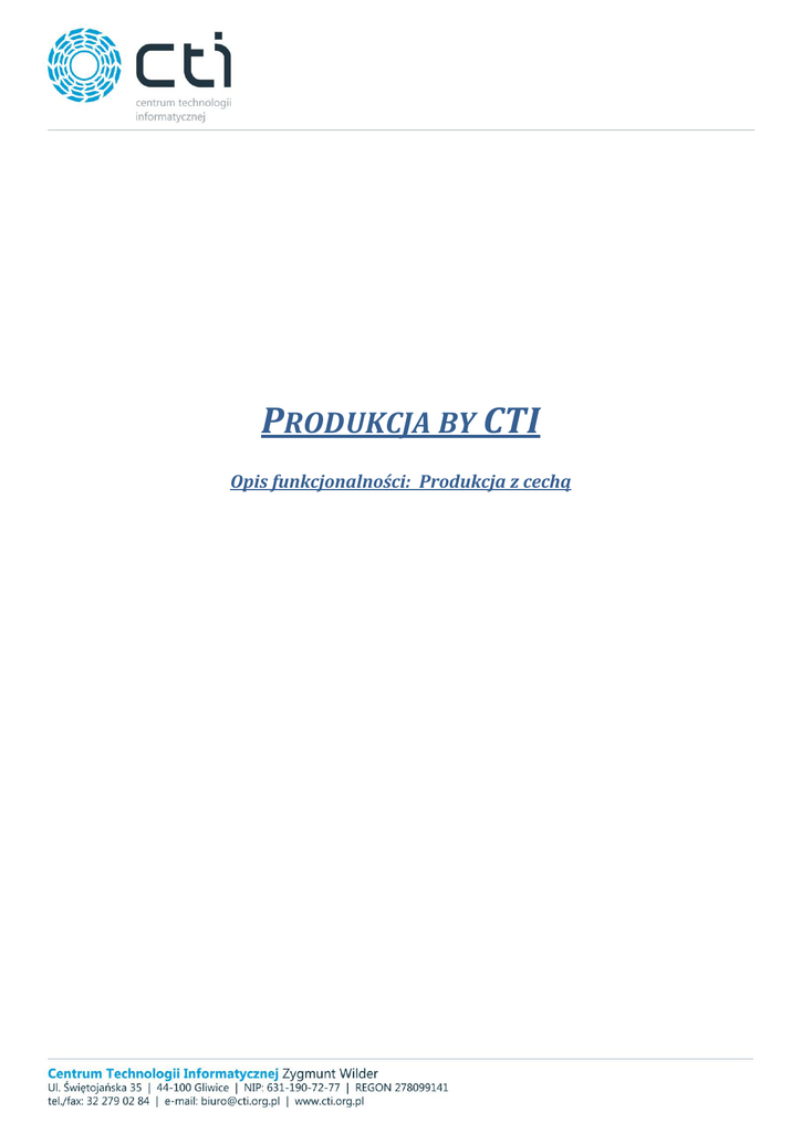 PRODUKCJA BY CTI Opis funkcjonalności: Produkcja z cechą 1 Spis treści: 1. Opis ogólny. ............................................................................................................................................... 3 2. Wprowadzenie surowca i wyrobu w Comarch ERP Optima. ..................................................................... 3 3. Konfiguracja Produkcja by CTI. .................................................................................................................. 3 3.1. Obsługa ceny ewidencyjnej. .............................................................................................................. 4 3.2. Dokumenty do bufora. ...................................................................................................................... 4 4. Wprowadzenie technologii........................................................................................................................ 4 5. Utworzenie zlecenia produkcyjnego. ........................................................................................................ 5 6. Wydanie surowca. ..................................................................................................................................... 6 7. Przyjęcie wyrobów gotowych. ................................................................................................................... 6 8. Zamknięcie zlecenia. .................................................................................................................................. 7 2 1. Opis ogólny. W programie Produkcja by CTI istnieje możliwość obsługiwania cech (wyróżników dostawy). Opcja ta służy do pracy na konkretnych partiach dostawy. W przypadku używania cech należy posiadać wolną licencję na Handel Plus w momencie tworzenia dokumentów. Jeśli nie zamierzamy obsługiwać cech to w zupełności wystarcza licencja na „zwykły” Hancel. 2. Wprowadzenie surowca i wyrobu w Comarch ERP Optima. W Programie Comarch Optimie dodajemy uzupełniamy : Cennik - kod, nazwę, jednostkę miary stawkę VAT oraz, jeśli towar będzie identyfikowany po specjalnym numerze serii, partii, czyli tzw. atrybut, 3. Pracowników- należy wpisać akronim oraz imię i nazwisko, Magazynu- muszą być co najmniej dwa magazyny: główny i produkcyjny. Konfiguracja Produkcja by CTI. Aby zaistniała możliwość pracy z cechami, należy w konfiguracji programu Produkcja by CTI zaznaczyć ‘’Obsługa cech - przypisanie numer partii dostawy na dokumentach”. Pierwsza cecha jest to numer partii, po którym program identyfikuje surowce i wyroby. Druga cecha to dodatkowa informacja przypisywana na dokumentach PW. Aby było możliwe wybranie atrybutu/cechy w konfiguracji produkcji, należy go zdefiniować w Optimie. Musi być również dodany na towarowych (surowce, wyroby) w Optimie. Atrybut w Optimie musi mieć zaznaczoną pozycję "przenosić na dostawy" oraz "obowiązkowy". Konfigurując atrybut należy najpierw ustawić atrybut odpowiedzialny za cechę- np. numer serii, partii, a następnie atrybut dodatkowy, czyli wszelkie informacje dodawane na PW. 3 3.1. Obsługa ceny ewidencyjnej. Opcja "Obsługa ceny ewidencyjnej przy tworzeniu dokumentu PW" umożliwia wprowadzenie ceny ewidencyjnej na technologii. Cena ta jest wprowadzana na dokumencie PW. Przy tej opcji dokumenty RW i PW powstają niezależnie, wiąże je tylko dokument ZP. W przypadku nie zaznaczenia danej opcji cena na dokumencie PW będzie liczona z wartości wcześniej wygenerowanego dokumentu RW. Może ona uwzględniać również koszty odpadów i koszty związane z czynnościami wykonywanymi przez pracowników produkcji. 3.2. Dokumenty do bufora. Zaznaczenie opcji "Dokumenty RW/PW generowane do bufora" umożliwia tworzenie wszystkich dokumentów RW i PW do bufora. Przy tej opcji należy pamiętać, aby po wygenerowaniu danych dokumentów, zamknąć je ręcznie w programie Optima. 4. Wprowadzenie technologii. Podczas tworzenia nowej technologii zakładka "Definicja partii na produkcji" oraz "Surowiec z cechą" są nie aktywne, ponieważ produkt nie został jeszcze wybrany. W momencie, gdy wybierzemy produkt z dodanym odpowiednim atrybutem zdefiniowanym w Optimie zostanie zaznaczona opcja "Cecha/Partia", a zakładki "Definicja partii na produkcji" oraz "Surowiec z cechą" będą aktywne. 4 Na zakładce "Definicja partii na produkcji" widoczna jest domyślna definicja cechy którą wprowadziliśmy w konfiguracji. Po wprowadzeniu potrzebnych danych na technologii należy ją potwierdzić, aby była możliwa do wyboru na zleceniu produkcyjnym. Technologię można otworzyć do edycji, jeżeli nie jest powiązana z żadnym zleceniem. 5. Utworzenie zlecenia produkcyjnego. W celu wprowadzenia nowego zlecenia należy z górnego menu programu wybrać zakładkę produkcja, a następnie przycisk zlecenia. Po naciśnięciu przycisku Dodaj nowe zlecenie należy wybrać technologię, która wcześniej została utworzona, oraz ilość wyrobu na zlecenie. Następnie należy dodać opis, pracownika/ów, którzy będą pracowali w ramach tego zlecenia, ilość wyrobów do wykonania przez poszczególnych pracowników oraz nacisnąć przycisk Zapisz. 5 6. Wydanie surowca. Po potwierdzeniu Zlecenia zaznaczymy pracownika/ów i uruchamiamy przycisk Wydanie do produkcji, powstanie dokument MM. Na dokumencie MM należy dodać surowce z magazynu głównego który ma być przesunięty na magazyn produkcji. Należy wybrać ilość surowca, a następnie wprowadzić zmiany na dokumencie. Następnie nacisnąć przycisk Zamknij dokument i wyciągnąć dokument z bufora. Surowce możemy wybierać za pomocą czytnika kodów kreskowych z uwzględnieniem ewentualnych kodów kreskowych opisujących numery dostaw (cechy). 7. Przyjęcie wyrobów gotowych. Aby uruchomić okno Przyjęcie z cechą na liście dokumentów przyjęcia, należy uruchomić przycisk "Realizacja częściowa". Wybór zleceń ograniczony 