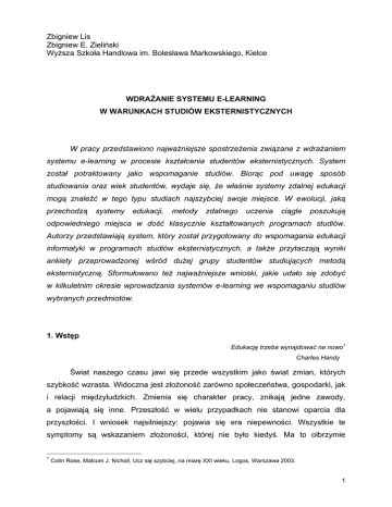 Zbigniew Lis Zbigniew E. Zieliński Wyższa Szkoła Handlowa im. Bolesława Markowskiego, Kielce WDRAŻANIE SYSTEMU E-LEARNING W WARUNKACH STUDIÓW EKSTERNISTYCZNYCH W pracy przedstawiono najważniejsze spostrzeżenia związane z wdrażaniem systemu e-learning w procesie kształcenia studentów eksternistycznych. System został potraktowany jako wspomaganie studiów. Biorąc pod uwagę sposób studiowania oraz wiek studentów, wydaje się, że właśnie systemy zdalnej edukacji mogą znaleźć w tego typu studiach najszybciej swoje miejsce. W ewolucji, jaką przechodzą systemy edukacji, metody zdalnego uczenia ciągle poszukują odpowiedniego miejsca w dość klasycznie kształtowanych programach studiów. Autorzy przedstawiają system, który został przygotowany do wspomagania edukacji informatyki w programach studiów eksternistycznych, a także przytaczają wyniki ankiety przeprowadzonej wśród dużej grupy studentów studiujących metodą eksternistyczną. Sformułowano też najważniejsze wnioski, jakie udało się zdobyć w kilkuletnim okresie wprowadzania systemów e-learning we wspomaganiu studiów wybranych przedmiotów. 1. Wstęp Edukację trzeba wynajdować na nowo1 Charles Handy Świat naszego czasu jawi się przede wszystkim jako świat zmian, których szybkość wzrasta. Widoczna jest złożoność zarówno społeczeństwa, gospodarki, jak i relacji międzyludzkich. Zmienia się charakter pracy, znikają jedne zawody, a pojawiają się inne. Przeszłość w wielu przypadkach nie stanowi oparcia dla przyszłości. I wniosek najsilniejszy: pojawia się era niepewności. Wszystkie te symptomy są wskazaniem złożoności, której nie było kiedyś. Ma to olbrzymie 1 Colin Rose, Malcom J. Nicholl, Ucz się szybciej, na miarę XXI wieku, Logos, Warszawa 2003. 1 znaczenie. Oto sposoby zachowań naszych przodków wobec mniejszej złożoności nie są możliwe wprost do przeniesienia w nasze czasy, także systemy edukacji tamtych czasów nie są wystarczająco dobre, by sprostać wymaganiom dzisiejszego studenta. I drugie ważne spostrzeżenie: w obliczu złożoności teoria systemów wypracowała pewne metody pracy, ale najważniejsze to nie gubić w opisie świata jego całości. Systemy posiadają podstawową własność wyrażoną zasadą Nersta: Całość to coś więcej, niż suma części2. Widzieć systemem w jego całości, to widzieć jego własności, ale ważniejsze są sposoby powiązania. Systemu edukacji nie można oddzielić od innych zachowań czy potrzeb człowieka, bo popełniamy wtedy błąd podstawowy: redukując, zajmujemy się fragmentem zachowań człowieka, który w żaden sposób nie jest przystający do jego zachowań w pełnej gamie potrzeb i wymagań stawianych przez cywilizację tego czasu. Możliwości człowieka, jego kapitał umysłowy są zbiorowym bogactwem, którego nie można zaniedbać przez niedostrzeganie zmian, którym podlega nasz czas. Należy także mądrze postawić wymagania, jakie te zmiany generują. Jedną z nich jest cel edukacji, czy cel zachowań zawodowych człowieka. Wydaje się, że człowiek gromadzący wiedzę dawno już pozostał w wieku poprzednim. Wydaje się, że istotne staje się, jak się uczyć, jak myśleć. Tym bardziej urastają tego typu cele do podstawowych, że z najnowszych badań mózgu (min. metodą badań emisyjnej tomografii komputerowej pozytonowej PET) i jego pracy mamy dość nowych spostrzeżeń, by wykorzystać je w edukacji, a te prowadzą do zmiany. Paradygmat opierający się na akceptacji niepewności jako jednego z wymiarów przyszłości3 wyzwala nas z ograniczeń determinizmu jako godnej idei naukowego widzenia świata i umożliwia wykorzystanie losowości w opisie świata. W pracy4 autorzy poddają systemy edukacji głębokiej analizie, która wyraźnie wskazuje na tak duże nagromadzenie zmian, których jesteśmy świadkami, że zmiany, jakie zaczynamy odczuwać mają charakter rewolucji i czasu, który w historii nie zdarzał się tak często, zmiany paradygmatu. Przytoczone słowa w pracy5 greckiego pisarza i filozofa Plutarcha napisane ponad trzy tysiące lat temu …Umysł nie jest naczyniem, które należy napełniać, lecz ogniem, który trzeba rozniecić, są chyba dobrym drogowskazem na drogę, która ma przed sobą Edukacja Nowego Wieku 2 Weinberg Gerlach M., Myślenie systemowe, Wydawnictwa Naukowo-Techniczne, Warszawa, 1997. Butrler Gillian, Hope Tony, Zarządzaj swoim umysłem, Oficyna wydawnicza ABA, Warszawa, 2001. 4 Gorden Gordon, Vos Jeannette, Rewolucja w uczeniu, Wydawnictwo Moderski i S-ka, Warszawa 2000. 5 Tamże. 3 2 2. E-Learning Jako Technologia Nauczania Najważniejszym celem edukacji jest nauczyć się, jak się uczyć6 Luis Alberto Machado Współczesne społeczeństwo korzystające i wspomagane przez informatyczne i telekomunikacyjne technologie dostrzega, że zastosowanie oraz wdrożenie nowych produktów znacznie zmienia standard życia, sposób wykonywanej pracy czy komunikowania się. Poziom edukacyjny nowoczesnego społeczeństwa jest silnie powiązany z sytuacją ekonomiczną kraju, dlatego też dynamiczne wdrażanie innowacyjnych technologii wymusza ustawiczną edukację dzisiejszego społeczeństwa. Pojawił się już nowy paradygmat w sposobie zdobywania wiedzy, postrzegający uczenie się jako cykliczny proces trwający całe życie. Również szybko wdrażana nowoczesna technologia wymusza na społeczeństwie ciągłe odnawianie i pogłębianie wiedzy obywateli z różnych dziedzin nauki i techniki. Podmioty edukacyjne dostrzegają coraz większe korzyści z wprowadzania zaawansowanych szkoleń przy użyciu komputerów i sieci Internet. Powoduje to poszukiwanie i wprowadzanie rozwiązań usprawniających oraz zwiększających wydajność procesu szkolenia. Przykładem jest kształcenie określane często mianem nauczania na odległość (distance educatioń) lub e-learningu, będące alternatywą dla klasycznego nauczania w obecności nauczyciela. Umiej