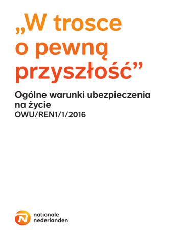 „W trosce o pewną przyszłość” Ogólne warunki ubezpieczenia na życie OWU/REN1/1/2016 Spis treści Ogólne warunki ubezpieczenia na życie „W trosce o pewną przyszłość” nr OWU/REN1/1/2016..................................................................... 4 Art. 1 Definicje................................................................................ 4 Art. 2 Przedmiot i zakres ubezpieczenia.............................. 5 Art. 3 Zakres i czas trwania odpowiedzialności Ubezpieczyciela................................................................ 6 Art. 4 Tryb zawarcia Umowy ubezpieczenia. Szczególne warunki Umowy ubezpieczenia.......... 6 Art. 5 Wiek Ubezpieczonego i czas trwania Umowy ubezpieczenia.....................................................7 Art. 6 Wyznaczanie Uposażonego..........................................7 Art. 7 Obowiązki Ubezpieczyciela..........................................7 Art. 8 Obowiązki Ubezpieczonego..........................................7 Art. 9 Składka..................................................................................7 Art. 10 Suma ubezpieczenia....................................................... 8 Art. 11 Zmiana wysokości Składki........................................... 8 Art. 12 Zawieszenie opłacania Składki.................................. 9 Art. 13 Umowa ubezpieczenia bezskładkowego................ 9 Art. 14 Wypłata w czasie trwania Umowy ubezpieczenia.................................................................. 10 Art. 15 Składka dodatkowa.........................................................11 Art. 16 Wypłata Sumy ubezpieczenia składek dodatkowych......................................................................11 Art. 17 Wartość wykupu...............................................................11 Art. 18 Udział w zysku..................................................................12 Art. 19 Wypłata świadczenia z tytułu dożycia....................13 Art. 20 Przejęcie opłacania Składek przez Ubezpieczyciela...................................................14 Art. 21 Wypłata świadczenia z tytułu śmierci Ubezpieczonego..............................................................15 Art. 22 Wyłączenia odpowiedzialności Ubezpieczyciela...............................................................16 Art. 23 Odstąpienie od Umowy ubezpieczenia..................17 Art. 24 Rozwiązanie Umowy ubezpieczenia........................17 Art. 25 Wygaśnięcie Umowy ubezpieczenia.......................17 Art. 26 Reklamacje.........................................................................17 Art. 27 Techniczna stopa procentowa...................................17 Art. 28 Przekazywanie korespondencji.................................17 Art. 29 Duplikat Dokumentu ubezpieczenia........................18 Art. 30 Opodatkowanie świadczeń.........................................18 Art. 31 Zmiana systemu monetarnego..................................18 Art. 32 Zmiana treści Tabeli limitów i opłat..........................18 Art. 33 Prawo właściwe. Rozstrzyganie sporów................19 Art. 34 Wejście w życie Warunków.........................................19 Tabela limitów i opłat TLiO/REN1/1/2015.........................................................................20 2| Informacje dotyczące: Ogólnych warunków ubezpieczenia na życie „W trosce o pewną przyszłość” nr OWU/REN1/1/2016 (OWU) Tabeli limitów i opłat TLiO/REN1/1/2015 (TLiO) Informacje zawarte w OWU i TLiO Nr artykułu OWU/ TLiO 1. Przesłanki wypłaty odszkodowania i innych świadczeń lub wartości wykupu Ubezpieczenia Art. 1, Art. 2, Art. 3, Art. 4, Art. 5, Art. 17, Art. 20, Art. 21 i Art. 22 OWU 2. Ograniczenia oraz wyłączenia odpowiedzialności zakładu ubezpieczeń uprawniające do odmowy wypłaty odszkodowania i innych świadczeń lub ich obniżenia Art. 21 i Art. 22 OWU 3. Koszty oraz inne obciążenia potrącane ze składek ubezpieczeniowych, z aktywów ubezpieczeniowych funduszy kapitałowych lub poprzez umorzenie jednostek uczestnictwa ubezpieczeniowych funduszy kapitałowych. Nie dotyczy 4. Wartość wykupu ubezpieczenia w poszczególnych okresach trwania ochrony ubezpieczeniowej oraz okres, w którym roszczenie o wypłatę wartości wykupu nie przysługuje. Art. 17 OWU |3 Ogólne warunki ubezpieczenia na życie „W trosce o pewną przyszłość” nr OWU/REN1/1/2016 Komentarze w ramkach – czemu służą i jaki mają charakter? Tekst warunków ubezpieczenia jest dokumentem o charakterze prawnym. Z tego powodu może być trudny w odbiorze. Mamy nadzieję, że poprzez komentarze w ramkach ułatwimy jego zrozumienie. Nie są one częścią Umowy ubezpieczenia i nie mają charakteru wiążącego. Posłużyliśmy się w nich mniej formalnym językiem oraz podaliśmy przykłady objaśniające konsekwencje poszczególnych zapisów. Nie objaśnialiśmy każdego artykułu – wybraliśmy tylko kluczowe dla zrozumienia tego ubezpieczenia. Dodatkowe informacje dotyczące Umowy ubezpieczenia „W trosce o pewną przyszłość” znajdują się w opisie dostępnym na stronie internetowej www.nn.pl. To nie wszystko – nasi Przedstawiciele oraz pracownicy Centrum Obsługi Telefonicznej odpowiedzą na każde pytanie. Ogólne warunki ubezpieczenia na życie mają zastosowanie do Umowy ubezpieczenia oznaczonej w polisie i innych dokumentach wystawionych przez Nationale-Nederlanden Towarzystwo Ubezpieczeń na Życie S.A. kodem: REN1 i są jej integralną częścią. Ogólne warunki ubezpieczenia – inaczej OWU – jakie mają dla Ciebie znaczenie? Ogólne warunki ubezpieczenia (OWU) stanowią najważniejszy element umowy pomiędzy Tobą a Ubezpieczycielem. W tym dokumencie znajdziesz istotne informacje dotyczące Umowy ubezpieczenia. Art. 1 Definicje Definicje – czemu służą i dlaczego warto się z nimi zapoznać? Niektóre słowa użyte w dokumencie mają ściśle określone znacze